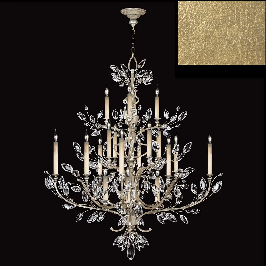 Chandelier in a silver leaf finish with warm gray candlesticks featuring stylized faceted crystal leaves.