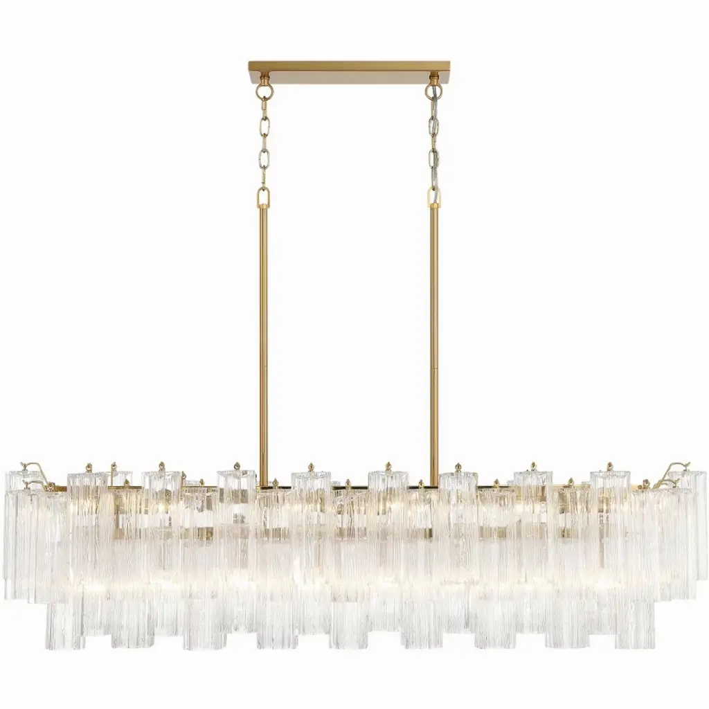 The captivating Addis Lighting Collection is a modern-day interpretation of the iconic mid-century Tronchi chandelier. Inspired by its predecessor's sleek lines and geometric shapes, the Addis features a polished Chrome or Aged Brass metal frame that exudes sophistication and style. Its unique design showcases transparent tiers of textured Tronchi glass tubes, forming a mesmerizing 5-point rounded star shape. Choose from a range of glass colors, including clear, amber, smoke, and white, or the stunning Autumn option, which features a captivating multicolor disposition of amber, clear, and smoke Tronchi glass. The Addis Lighting Collection offers various sizes and finishes, allowing you to find the perfect fit for your space while adding a touch of timeless elegance. Addis collection features a versatile transitional design. / Characterized by clean lines, sculptural forms, and warm metallic or wood accents, often featuring bold shapes and playful pops of color for a retro yet timeless