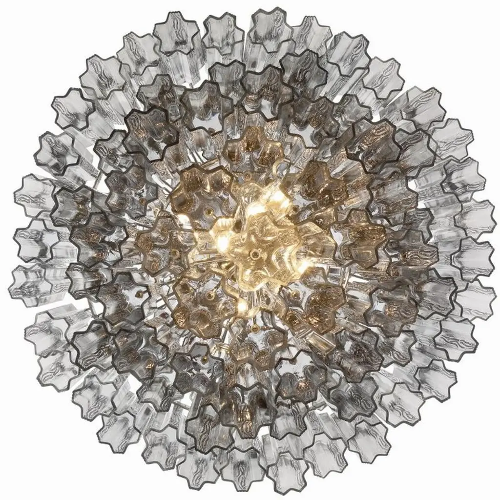 The captivating Addis Lighting Collection is a modern-day interpretation of the iconic mid-century Tronchi chandelier. Inspired by its predecessor's sleek lines and geometric shapes, the Addis features a polished Chrome or Aged Brass metal frame that exudes sophistication and style. Its unique design showcases transparent tiers of textured Tronchi glass tubes, forming a mesmerizing 5-point rounded star shape. Choose from a range of glass colors, including clear, amber, smoke, and white, or the stunning Autumn option, which features a captivating multicolor disposition of amber, clear, and smoke Tronchi glass. The Addis Lighting Collection offers various sizes and finishes, allowing you to find the perfect fit for your space while adding a touch of timeless elegance. Addis collection features a versatile transitional design. / Characterized by clean lines, sculptural forms, and warm metallic or wood accents, often featuring bold shapes and playful pops of color for a retro yet timeless