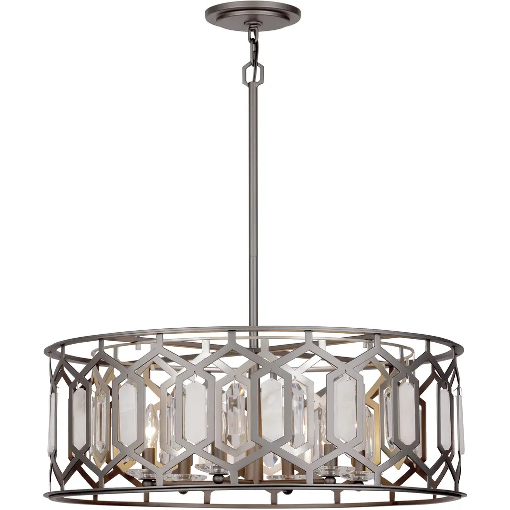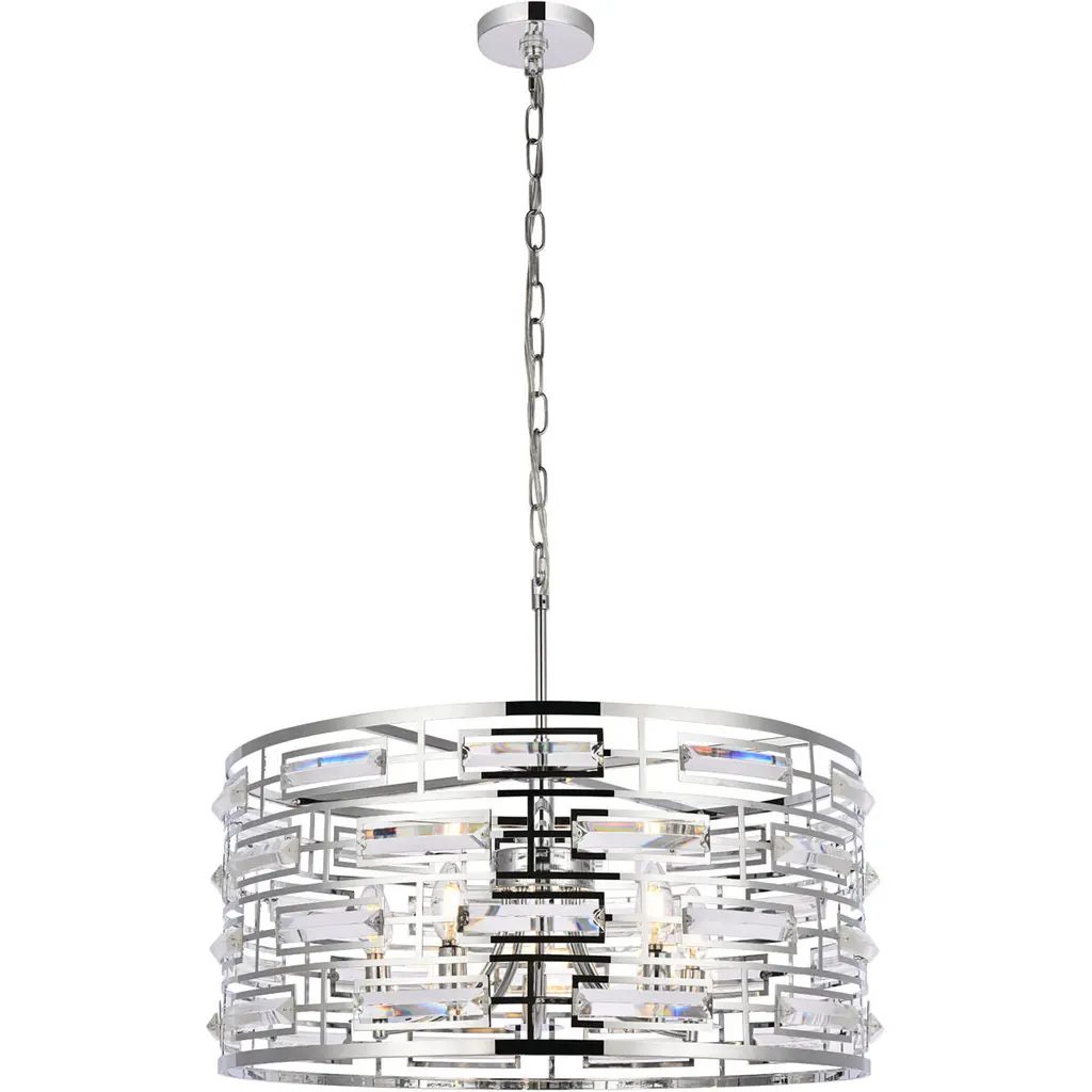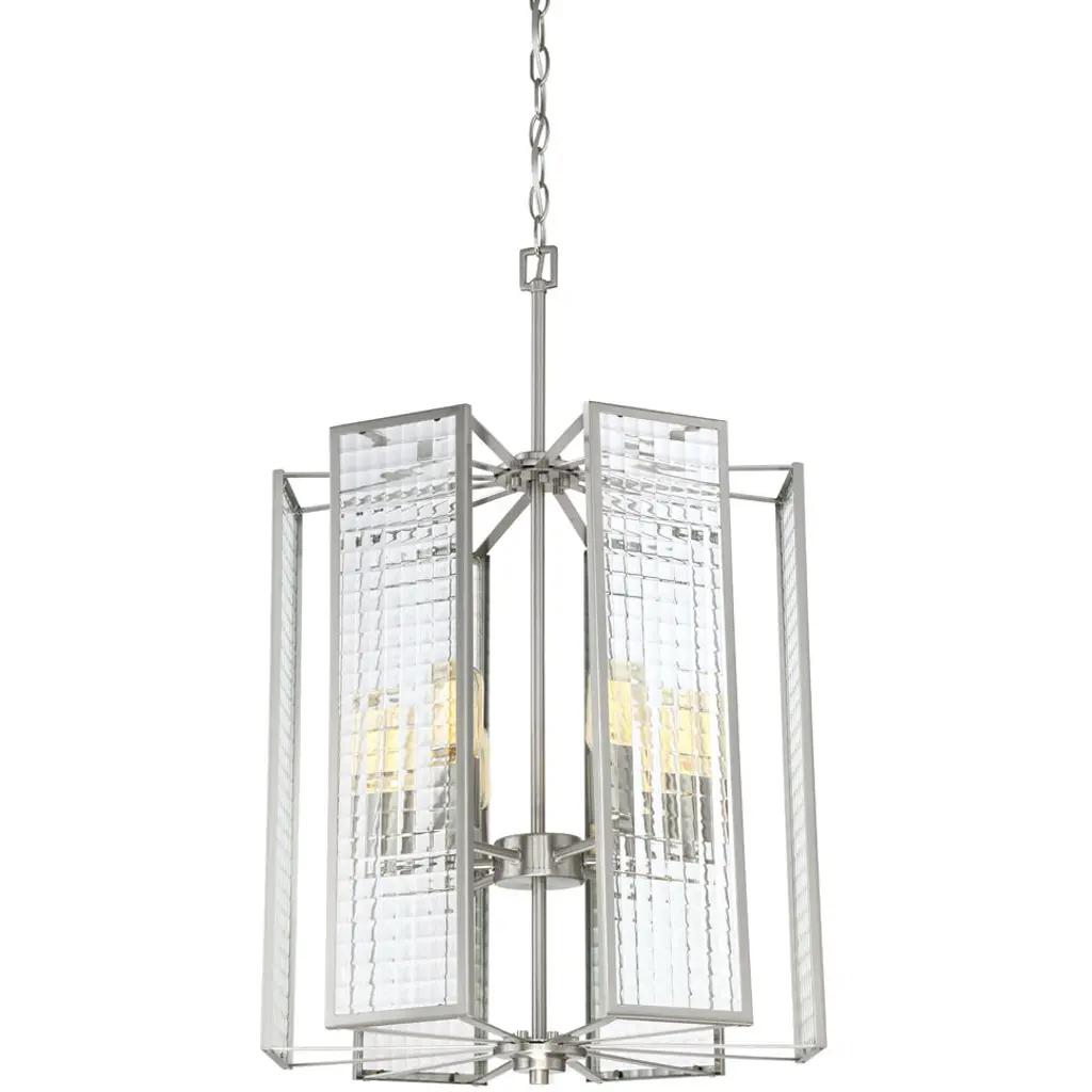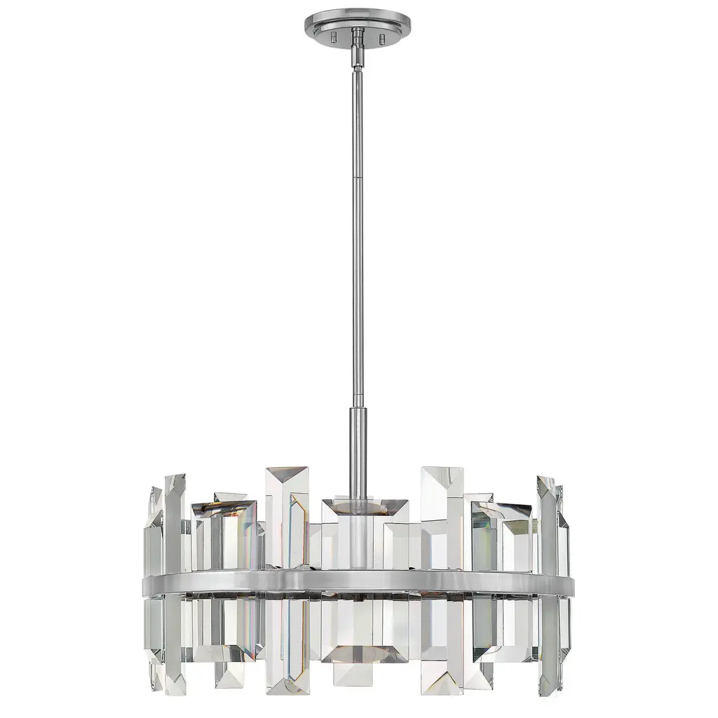 A luminescent crystal cubes create a high glam statement in the Carson Collection highlighting a sleek nickel based candle sleeves in the center. Magnificently modern, the fixture, adds the perfect amount of sophisticated statement to any space, and perfectly catches the light. Carson collection features a versatile modern / contemporary design. / A balanced blend of traditional and contemporary elements, featuring clean lines, neutral finishes, and subtle detailing, offering versatile designs that complement a variety of interiors. / Convertible, can be installed as a ceiling mount or chandelier. / Polished Nickel metal finish, perfect for modern & contemporary settings. / 16"W x 12"H x 16"D / 4 light 60- watt, E12 Candelabra base / Steel / Authorized for use in dry interior locations. Meets United States UL Underwriters Laboratories Product Safety Standards. / This open drum has a unique shape and chunky crystal accents. / Assembly Required: Yes / Canopy Included: Yes / Canopy Diame