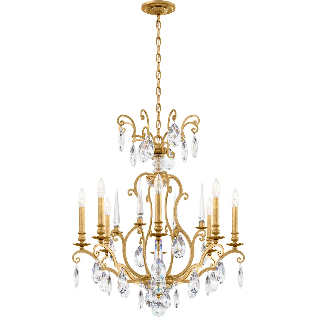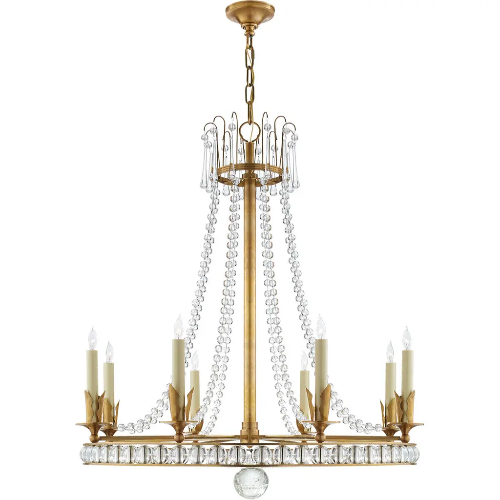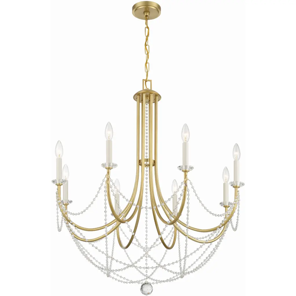The Maizey Collection is a testament to refined elegance and meticulous craftsmanship. Each piece is adorned with a lustrous gold finish, delicately supporting clear, smooth glass beads alongside faceted cut crystal drops, imparting a mesmerizing sparkle to any space. Accentuated with a distinctive sunburst emblem, this fixture serves as a radiant illuminator and captivating work of art. Maizey collection features a versatile transitional design. / A breezy, light-filled style that blends soft hues, natural materials, and nautical touches for a relaxed, seaside-inspired feel. / Sweeping arms dressed with strands of crystals. / Antique Gold metal finish is a popular choice with homeowners. The finish has a rich color and texture with warm undertones. / 28"W x 33.5"H x 28"D / 6 light 60- watt, E12 Candelabra base / Steel + Glass / Authorized for use in damp, high-humidity interior locations or protected exterior locations. Meets United States UL Underwriters Laboratories Product Safety