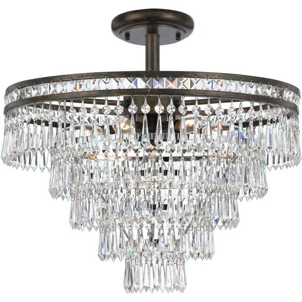 Dazzling with faceted cut crystal, the Mercer Collection sparkles from all angles. Especially if viewed from the bottom, the unique design forms a stunning metal floral design. The opulent crystal paired with the hand painted metal work allows this fixture to bring luxurious appeal to a variety of interior spaces. Mercer collection features a versatile transitional design. / Timeless designs with intricate metalwork, curved arms, crystal embellishments, and classic finishes, bringing a sense of warmth and heritage to any space. / Convertible, can be installed as a ceiling mount or chandelier. / Olde Silver metal finish is a warm grey with a subtle metallic sheen. This finish has a natural appearance of aged silver. / 20"W x 20.25"H x 20"D / 7 light 60- watt, E12 Candelabra base + E26 Medium base / Steel / Authorized for use in damp, high-humidity interior locations or protected exterior locations. Meets United States UL Underwriters Laboratories Product Safety Standards / Art deco mee