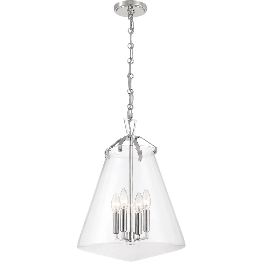 The Voss Collection is a sleek, enduring design with subtle angular details, offered in various finishes and sizes for your unique space. It�s clear glass cone-shaped pendant is closed on the bottom and fastened with metal on its open top. The patterned chain detail adds a touch of character to its streamlined design. The Voss Collection is not confined to a single style; it is a versatile design that suits a variety of spaces, from minimalist and modern to classic and eclectic. Voss collection features a versatile modern / contemporary design. / A balanced blend of traditional and contemporary elements, featuring clean lines, neutral finishes, and subtle detailing, offering versatile designs that complement a variety of interiors. / The top metal attachment to the glass easily unscrews for convenient cleaning and maintenance. / Polished Nickel metal finish, perfect for modern & contemporary settings. / 11"W x 14.75"H x 11"D / 3 light 60- watt, E12 Candelabra base / Steel + Glass / Au
