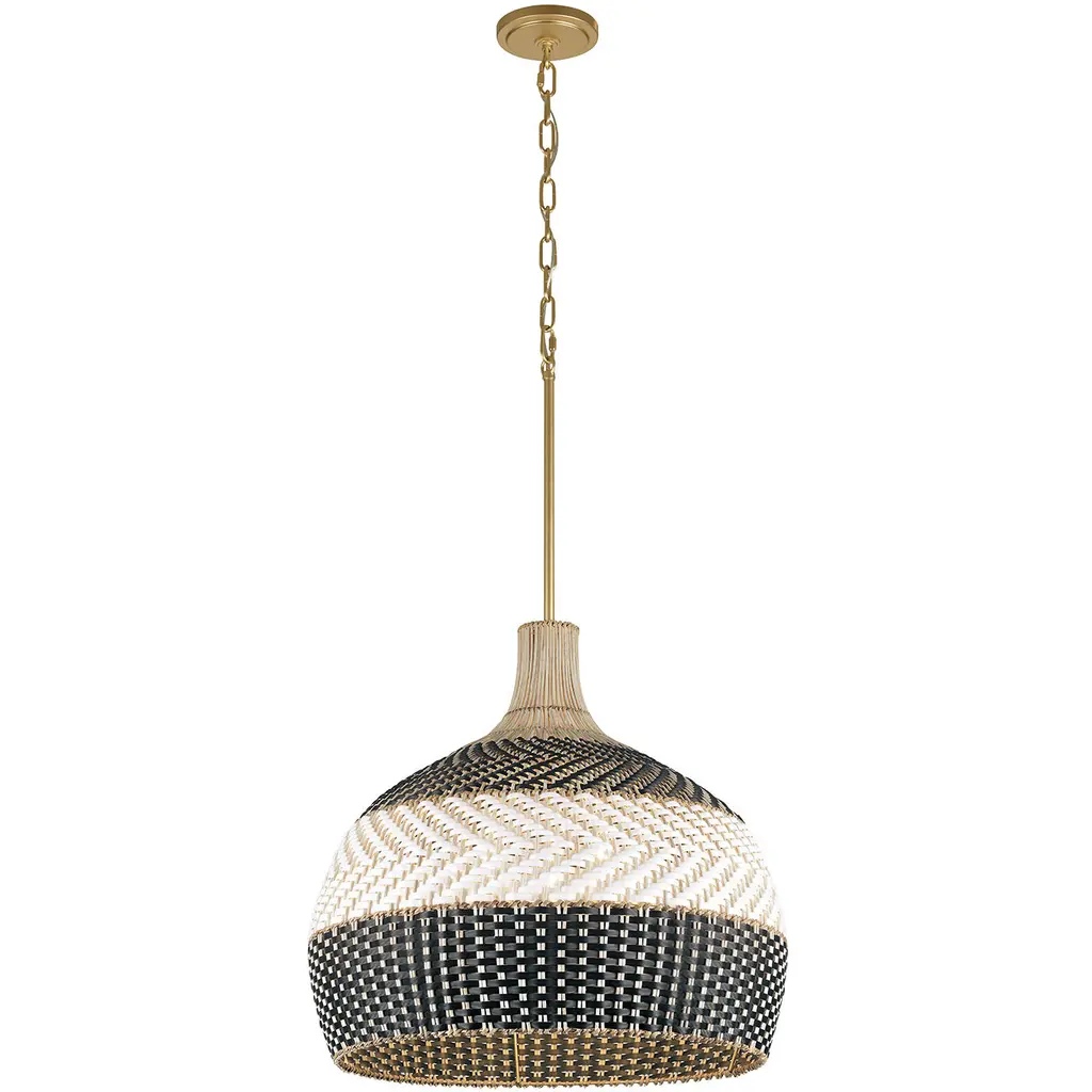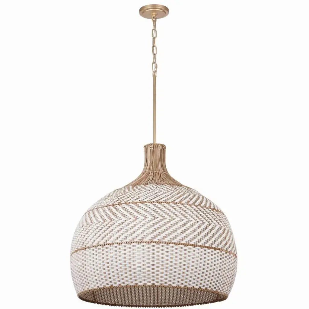 The Zanzibar Collection is an embodiment of laid-back luxe and thoughtful simplicity. By marrying the natural textures of natural rattan with white and/or black lanyard, the fixture introduces a striking color palette with a soft gold finish that instantly brings comfort and style to a living space Handcrafted with precision, the intricate weave introduces texture and depth to your d�cor. Whether suspended over a breakfast nook or in pairs above a kitchen island, the Zanzibar exudes an earthy, elegant charm that brings an artisanal touch to your decor. Zanzibar collection features a versatile farmhouse / rustic design. / A breezy, light-filled style that blends soft hues, natural materials, and nautical touches for a relaxed, seaside-inspired feel. / Two-toned with natural rattan and white lanyard. / Soft Gold metal tones showcase a light and airy feel that work well with transitional settings. / 26"W x 25.25"H x 26"D / 6 light 60- watt, E12 Candelabra base / Steel + Rattan / Authoriz