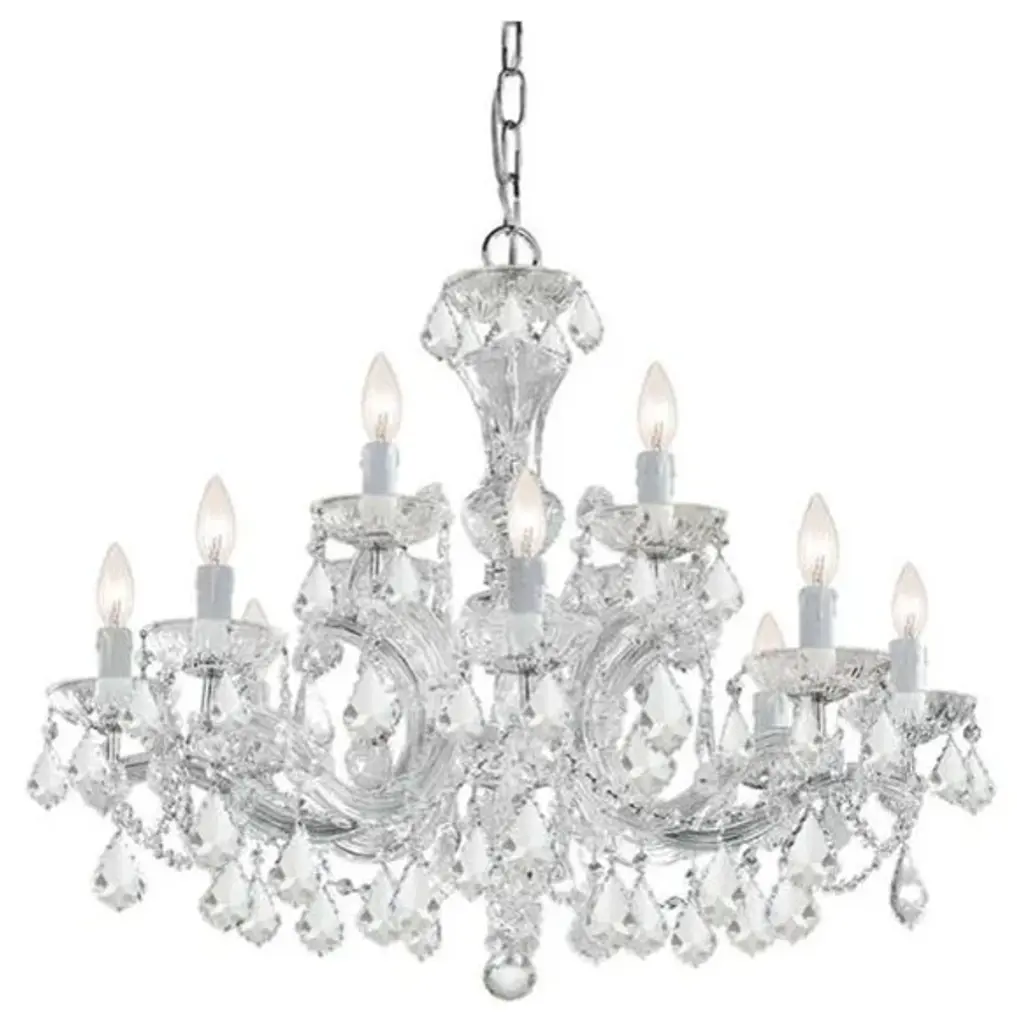 For centuries, Maria Theresa style of crystal chandeliers has been a sign of wealth, style, and class. In keeping with the time honored traditions of our European artisans, Crystorama's Maria Theresa collection offers a variety of finishes and crystal combinations.Maria Theresa Chandelier Draped in Swarovski Elements CrystalPrimary Material: GlassFinish: Polished ChromeCrystal Type: Swarovski ElementsOverall Dimensions: 30"(W) x 23"(H); Overall Height: 95"Chain/ Rod Length: 72"Wire Length: 120"Number of Lights 1: 8Wattage 1: 60Number of Lights 2: 4Wattage 2: 60