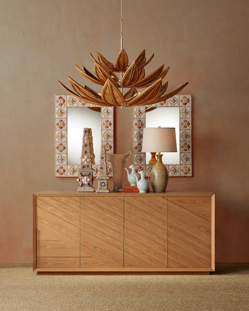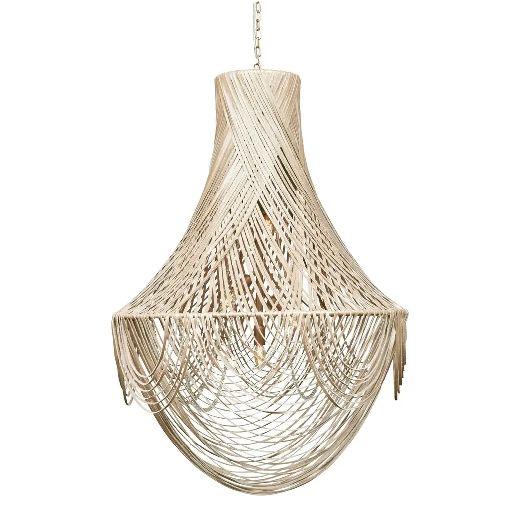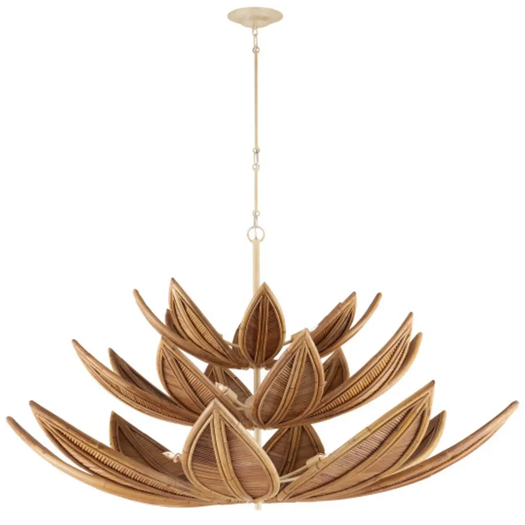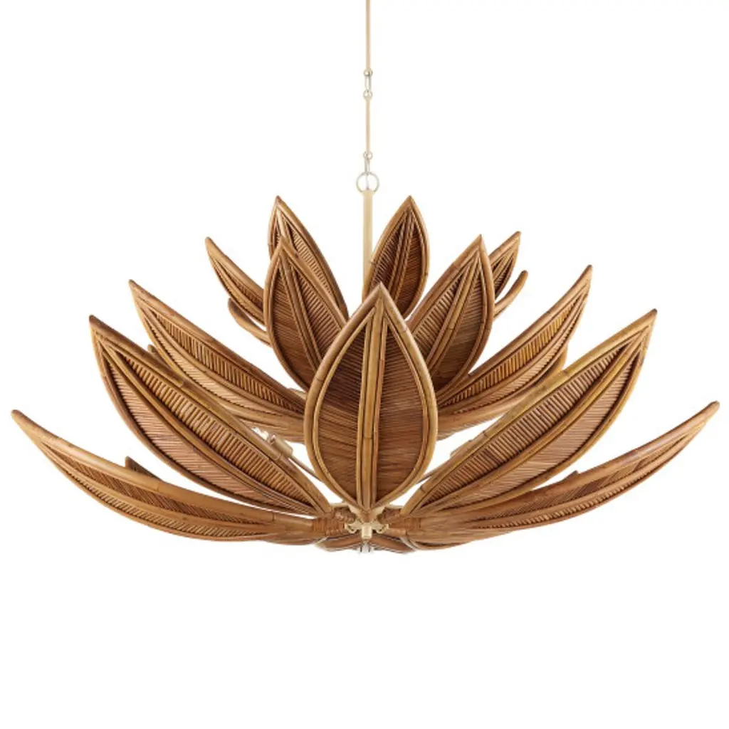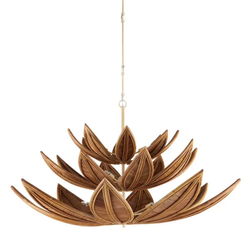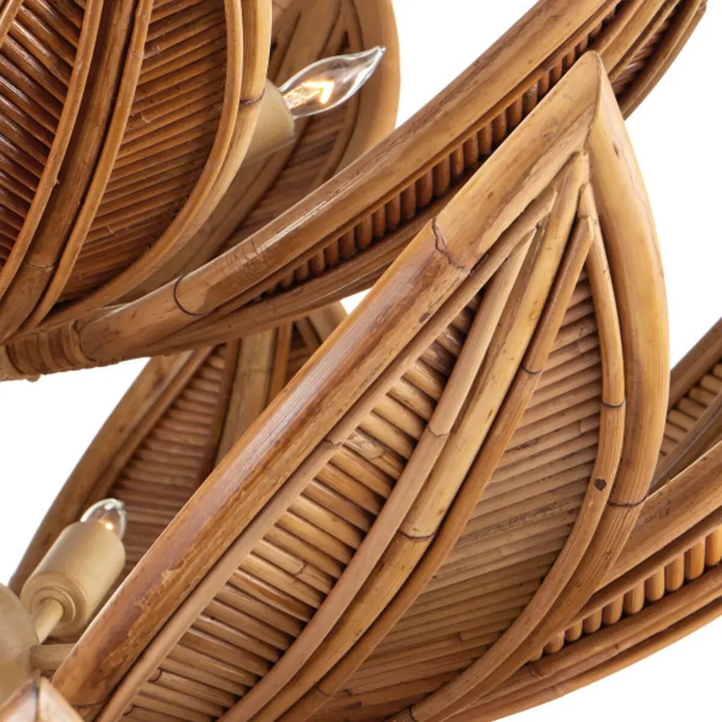 The Cubana Chandelier collection features a sculptural arrangement of hand-crafted rattan leaves that arch upward, allowing the bulbs to nestle within and cast a warm, reflected glow. Each leaf is formed from rattan in varying widths, meticulously shaped and patterned by artisans to create a layered, organic texture. The natural material is paired with a wrought iron frame that complements the earthy tones. Adjustable with the use of an included chain/rod kit/cable, with additional chain/rods/cable available for purchase if a longer drop is needed.