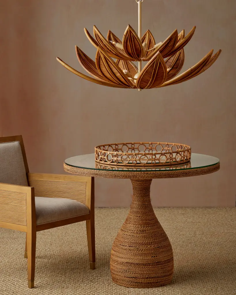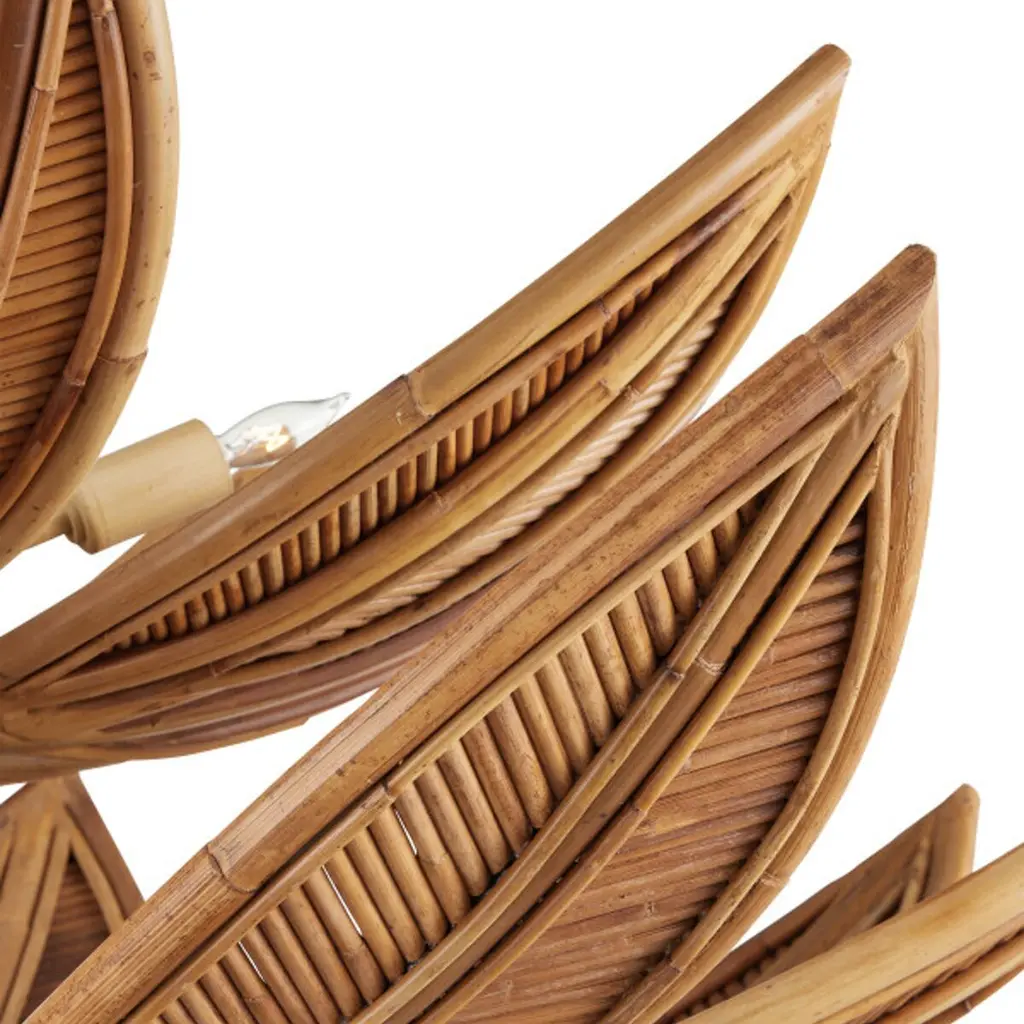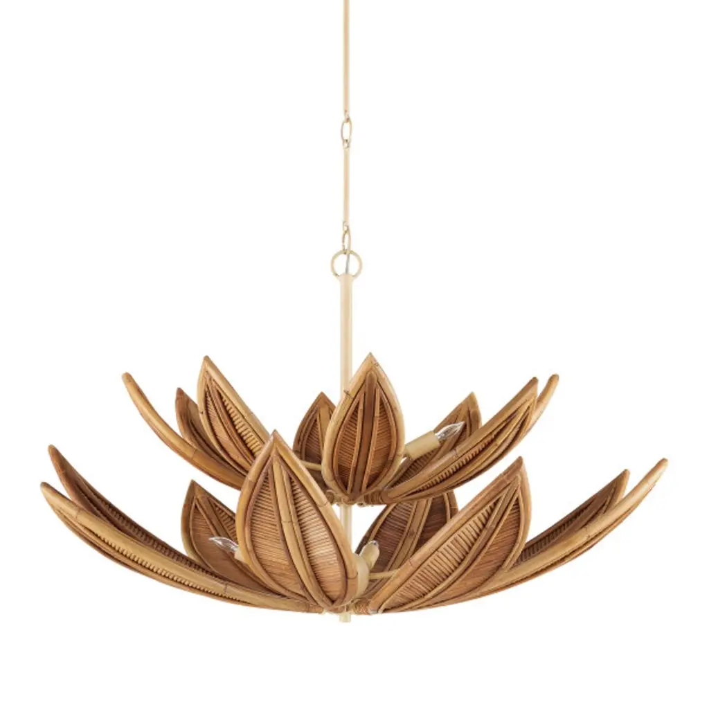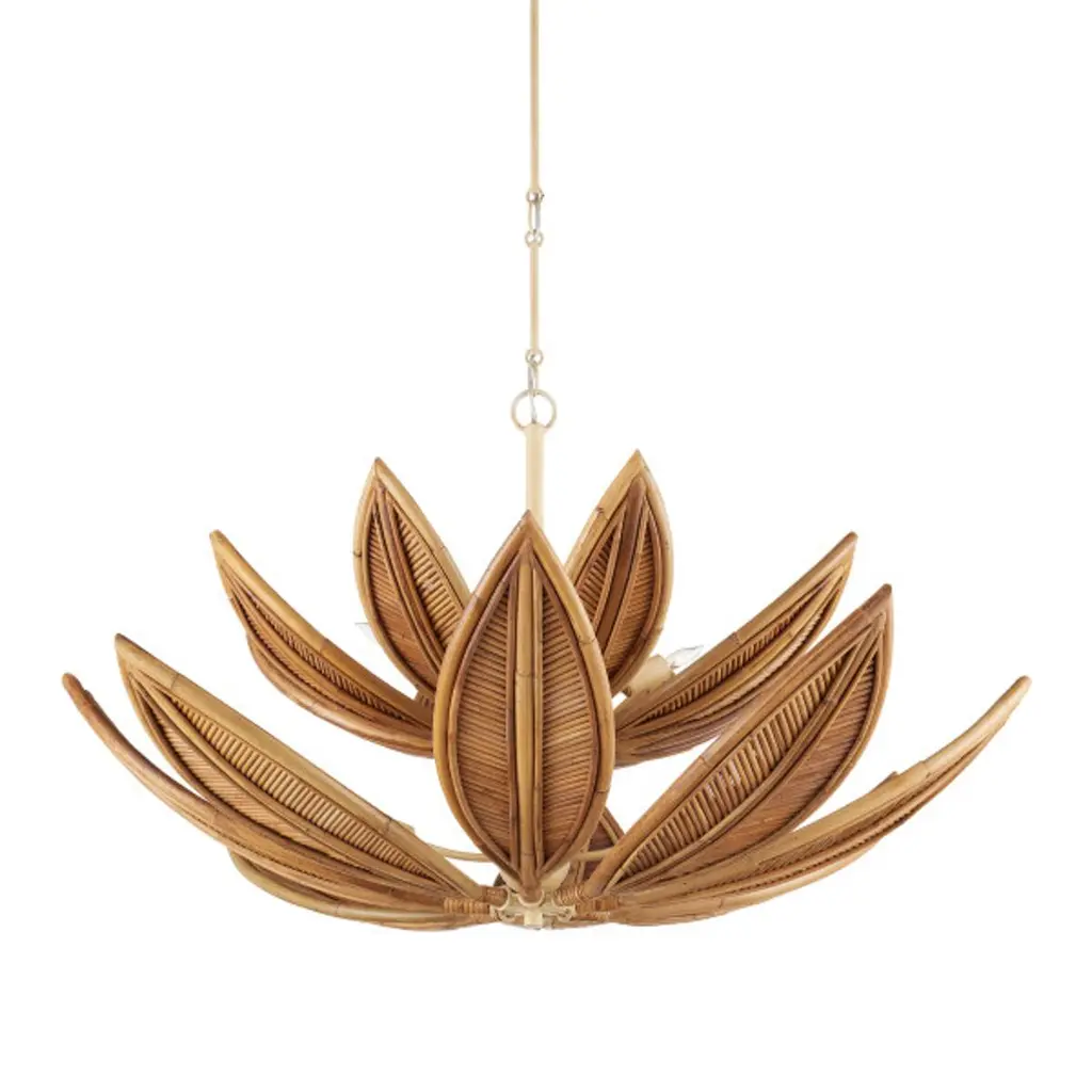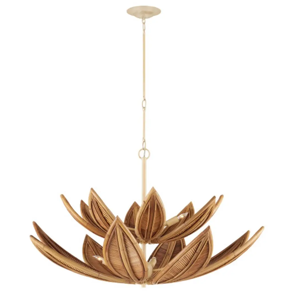 The Cubana Chandelier collection features a sculptural arrangement of hand-crafted rattan leaves that arch upward, allowing the bulbs to nestle within and cast a warm, reflected glow. Each leaf is formed from rattan in varying widths, meticulously shaped and patterned by artisans to create a layered, organic texture. The natural material is paired with a wrought iron frame that complements the earthy tones. Adjustable with the use of an included chain/rod kit/cable, with additional chain/rods/cable available for purchase if a longer drop is needed.
