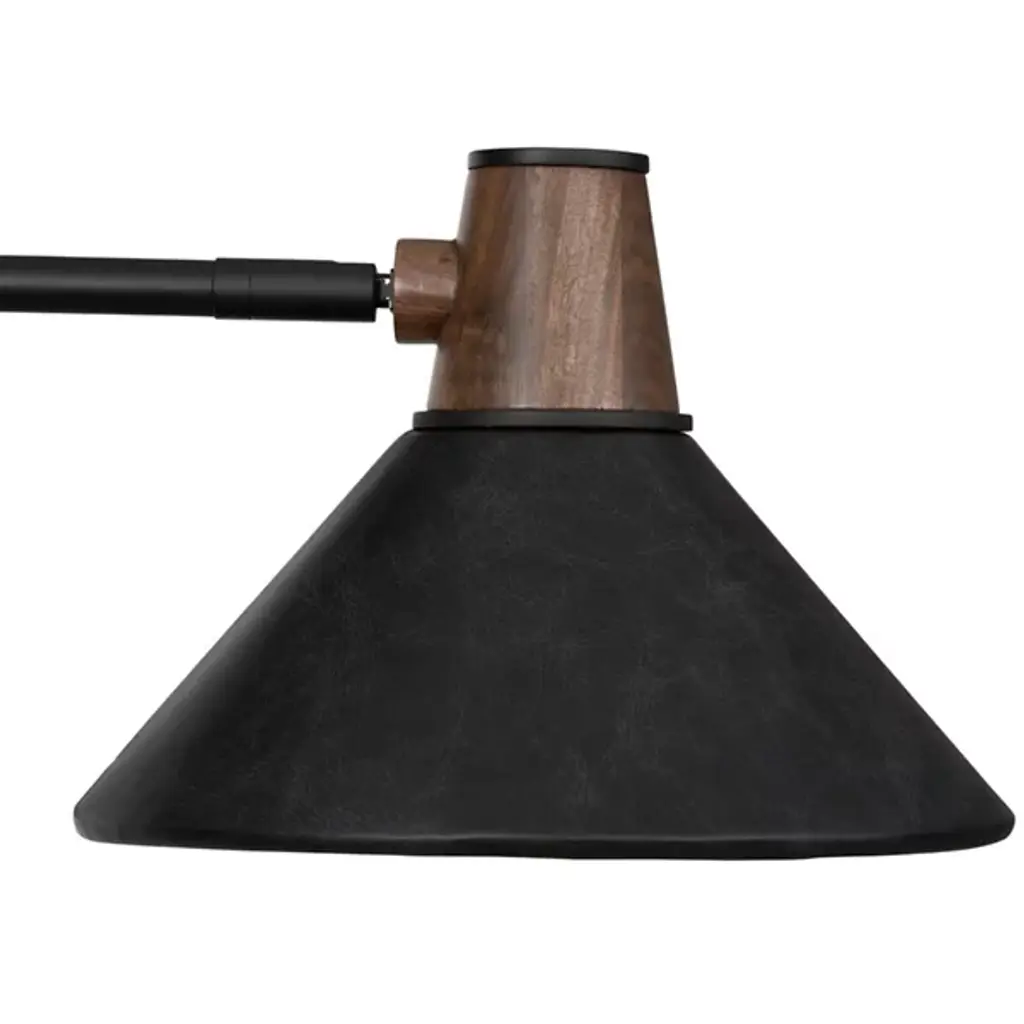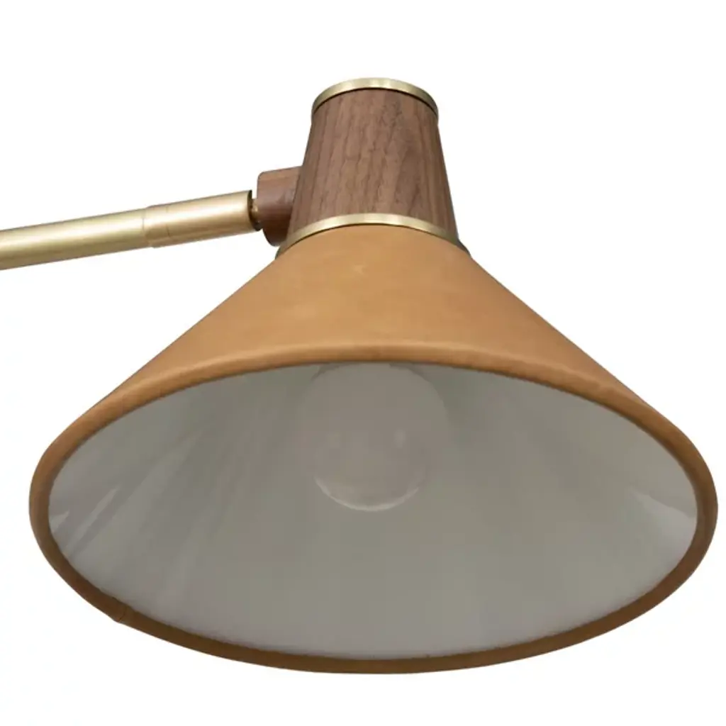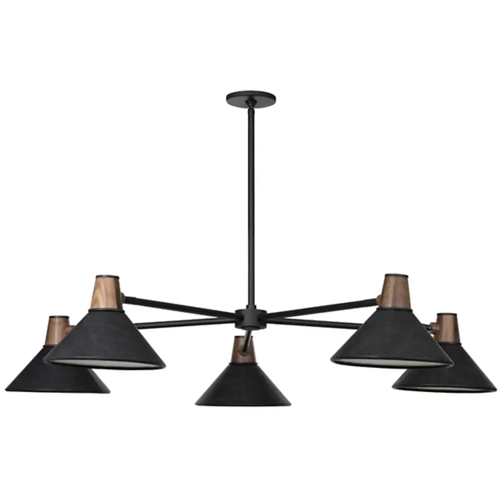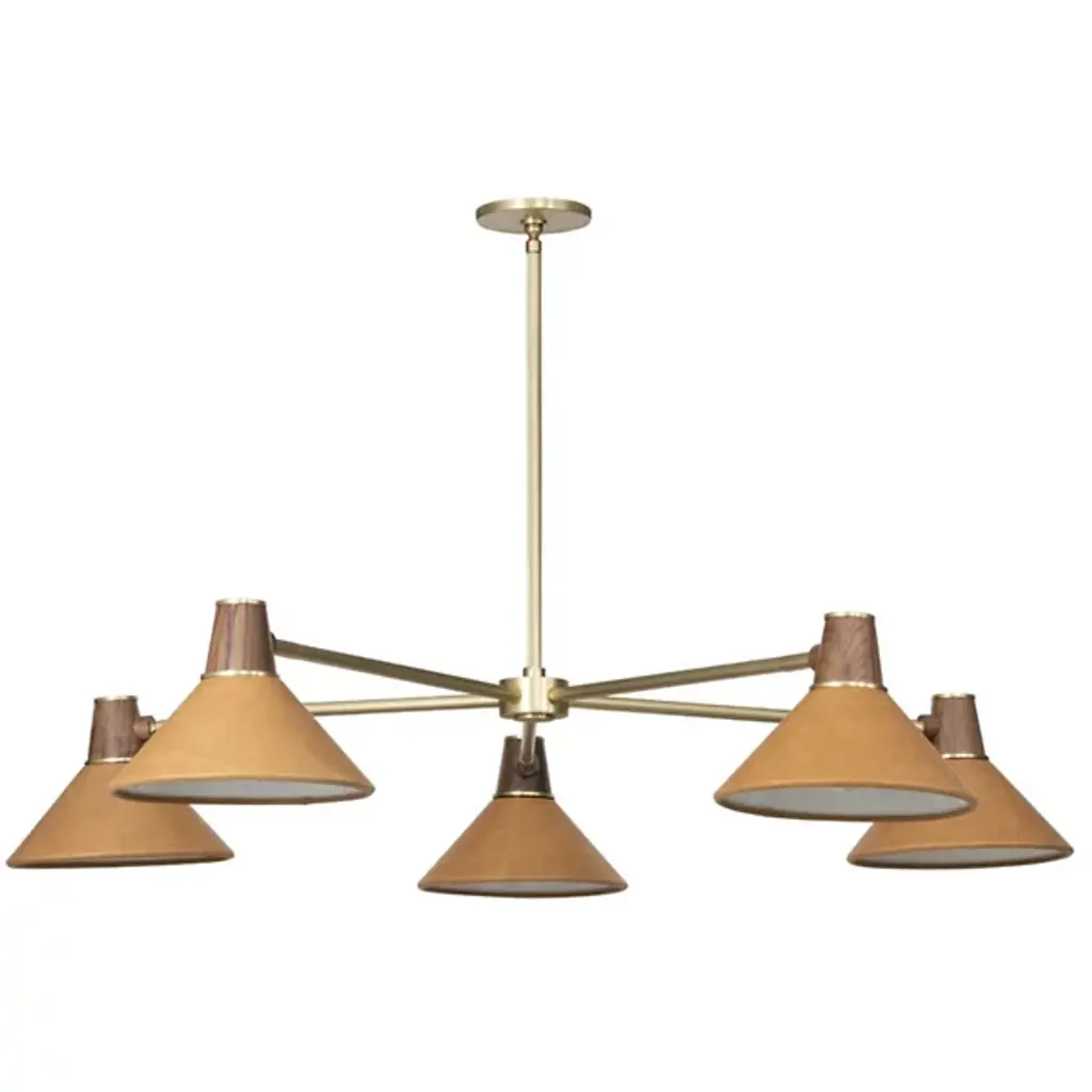 The Cullen Chandelier from Four Hands presents a tasteful midcentury-modern character. A stylish pendant that descends from a circular canopy along a slim downrod sends out horizontal arms to lamping placed inside conical shades surfaced in top-grain leather and backed by knobs of solid wood. The rustic textures contrast well with the smooth metal structure, with the sleek shade interiors dispatching a mix of reflected radiance and focused downlight.
