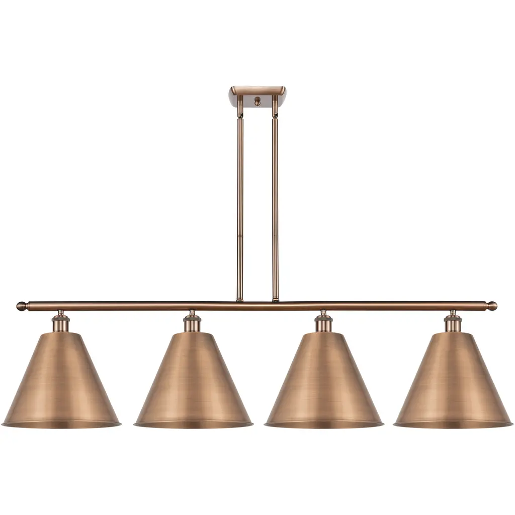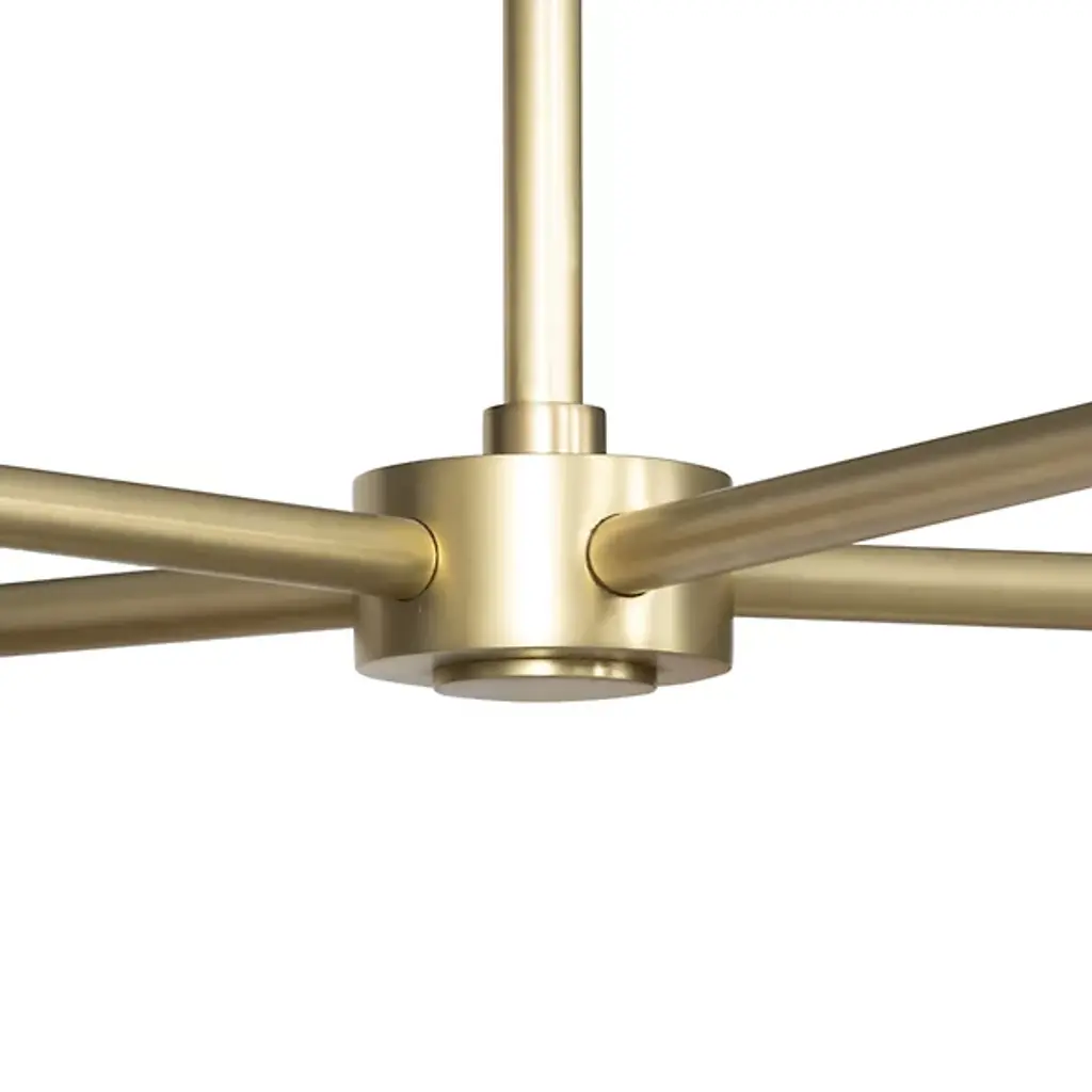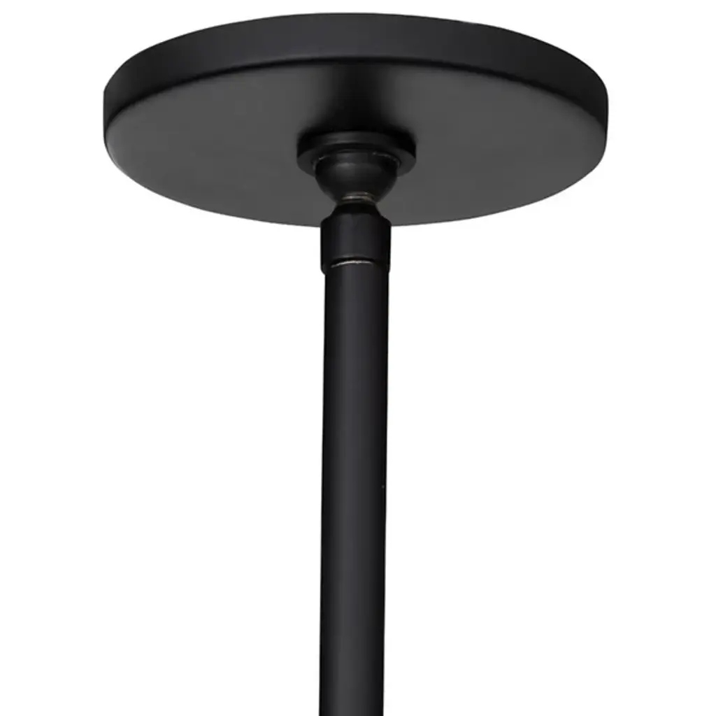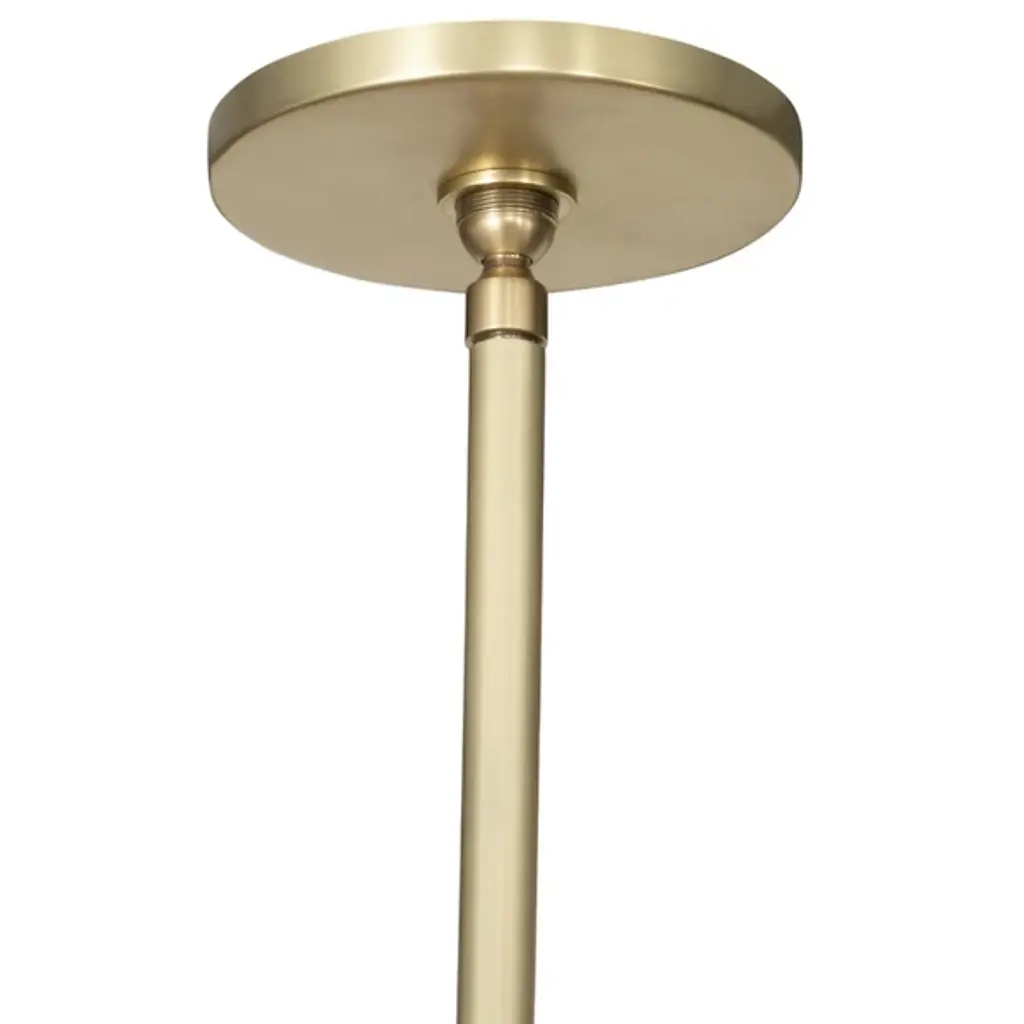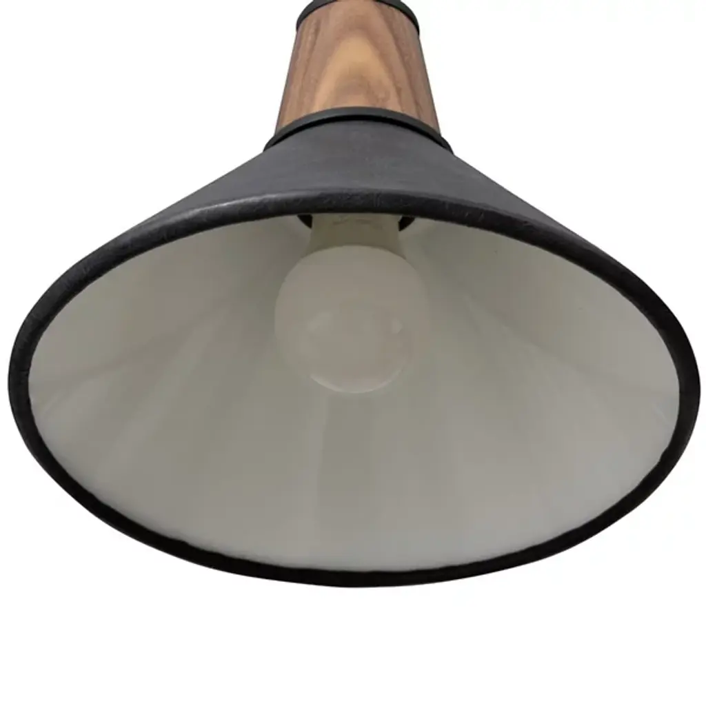The Cullen Chandelier from Four Hands presents a tasteful midcentury-modern character. A stylish pendant that descends from a circular canopy along a slim downrod sends out horizontal arms to lamping placed inside conical shades surfaced in top-grain leather and backed by knobs of solid wood. The rustic textures contrast well with the smooth metal structure, with the sleek shade interiors dispatching a mix of reflected radiance and focused downlight.