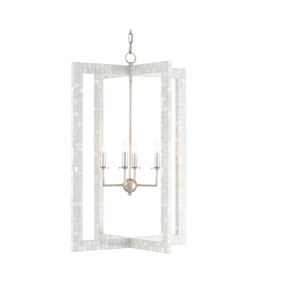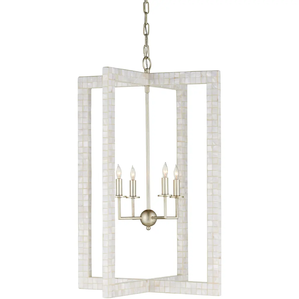 With thin rectangles covered in hand-applied mother-of-pearl mosaic, our Arietta Chandelier is an example of the talent our finish artisans have when it comes to handcrafted surfaces. The metal that has been treated to a contemporary silver leaf finish enhances the glow of the fixture when the four lights illuminate. T