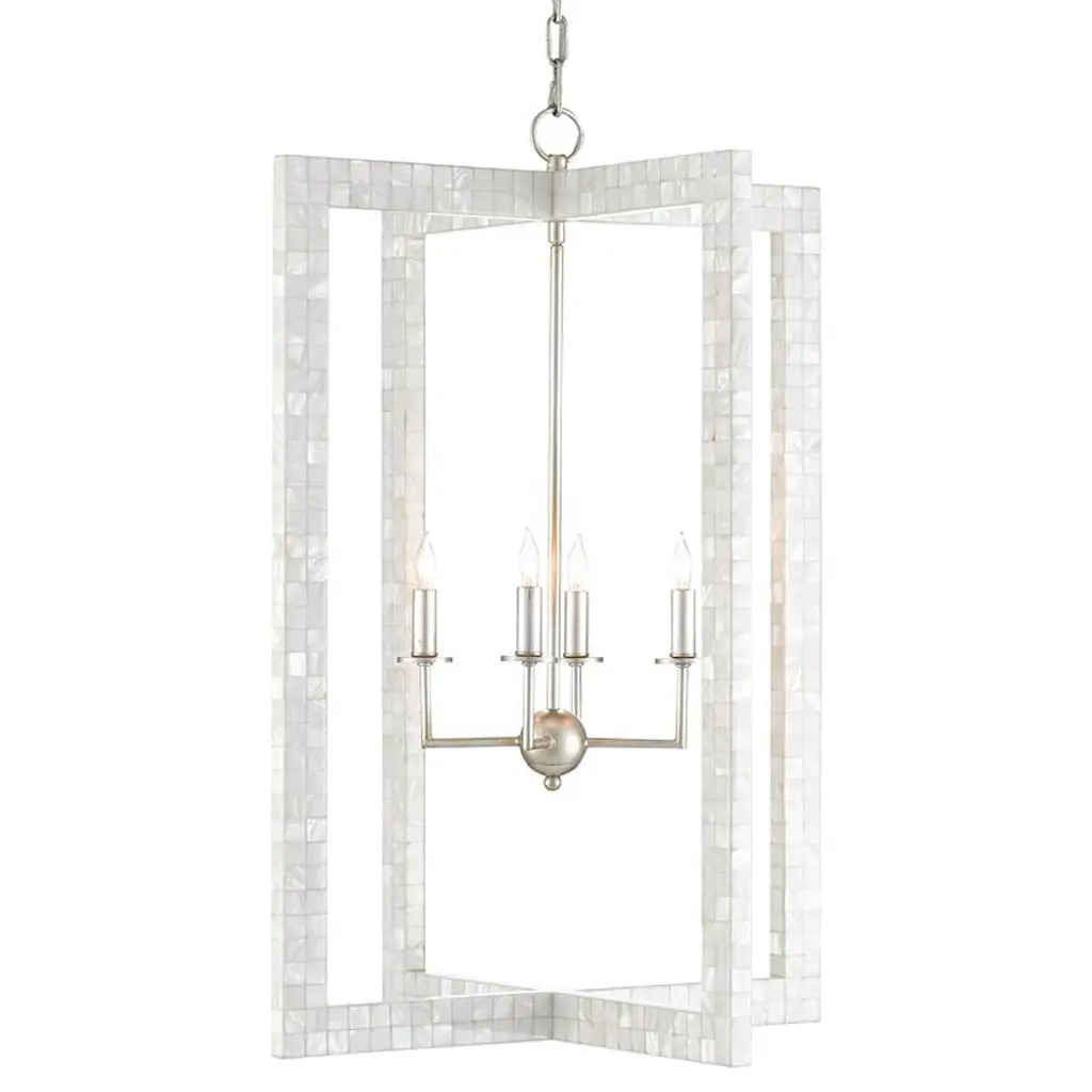 With thin rectangles covered in hand-applied mother-of-pearl mosaic, our Arietta Chandelier is an example of the talent our finish artisans have when it comes to handcrafted surfaces. The metal that has been treated to a contemporary silver leaf finish enhances the glow of the fixture when the four lights illuminate. This is one of our silver chandeliers that will bring an uptick in sophistication to the space it enlivens. Finish: Mother of Pearl/Contemporary Silver Leaf Materials: Mosaic Mother of Pearl/Metal Overall: 32.25"h x 22"w x 22"d Adjustable Height: 38.75" to 106.75" Weight: 22 lb Lights: 4 Watts per Socket/Item: 60/240 Voltage: 120v Socket: E12 Suggested Bulb: B Torpedo Tip Chain Included: 6' Contemporary Silver Leaf Free Shipping in the U.S. Tax Free!