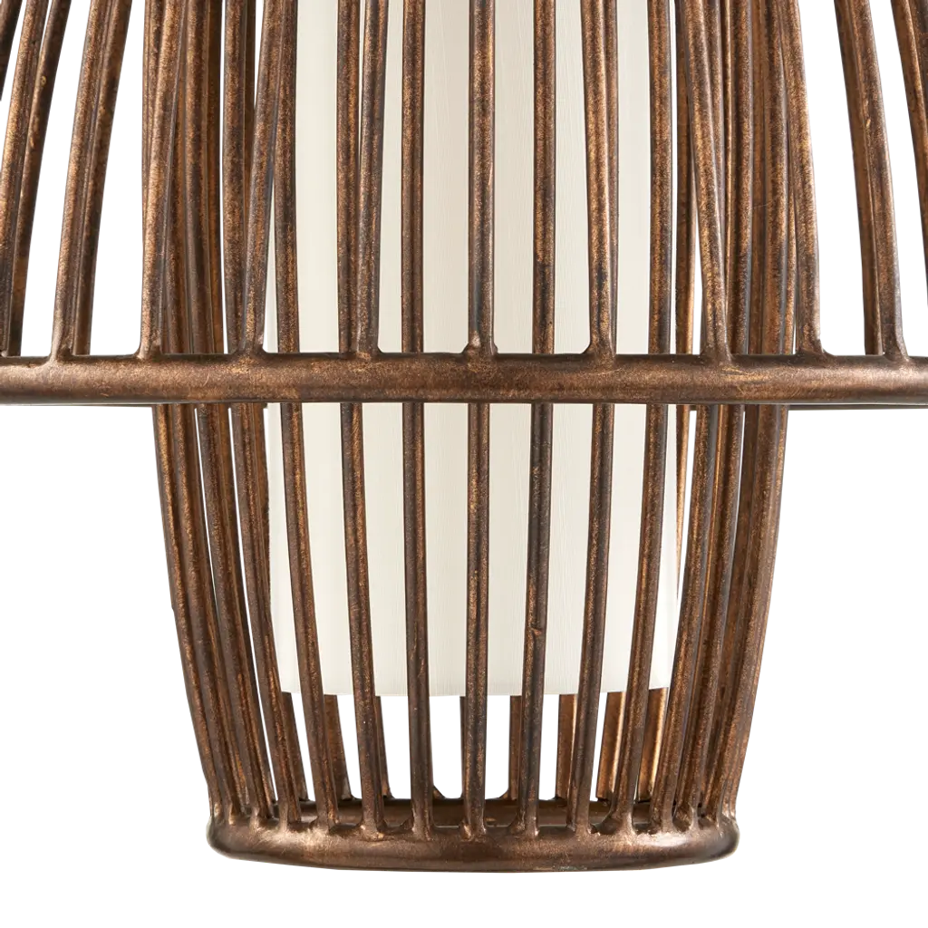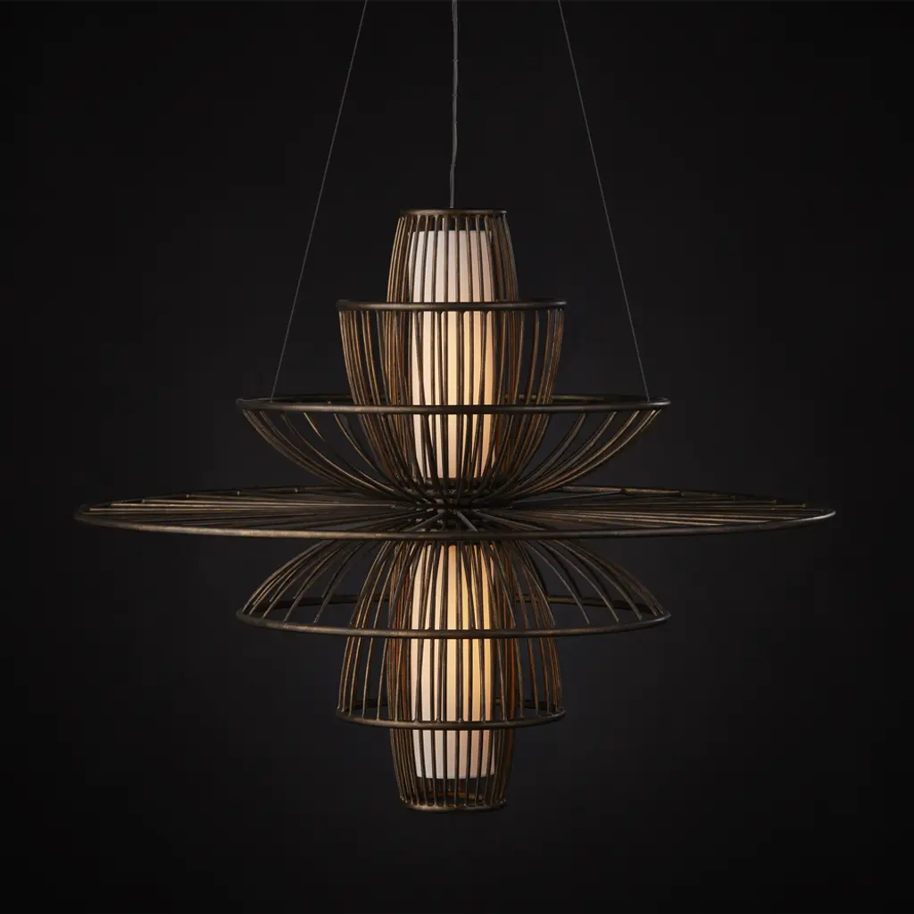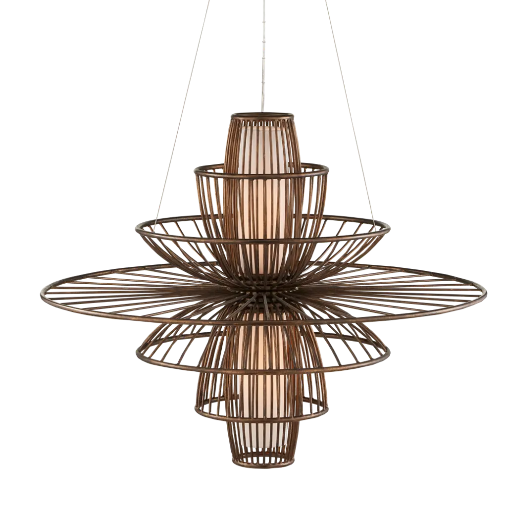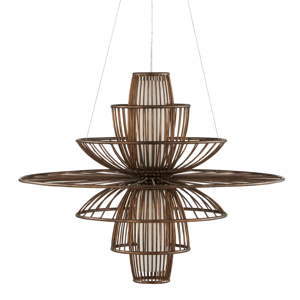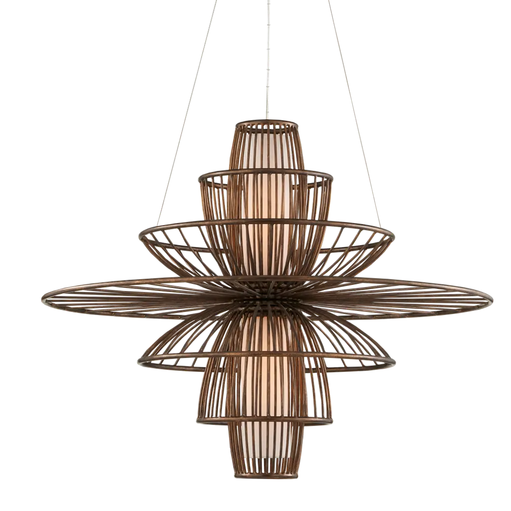 Made of steel in a Cupertino finish, the Benjiro Chandelier was designed by Ian Thornton. The off-white fabric shades fitted into the inner-most cylinders soften the glow of the LED bulbs. Inspired by mid-century modern shapes with a bit of a space-aged twist, Ian tapped into the famed era when wicker and macrame shapes with exploding profiles were all the rage. The dark brown chandelier hangs on aircraft cable to create the illusion it is floating. Adjustable: Yes Adjustable Height Minimum: 45 Adjustable Height Maximum: 144 Canopy Diameter: 6 Convertible to Semi-Flush Mount: No Lights: 2 Maximum Watts per Socket: 10 Socket Type: E26 Shade Detail: Off-White Shantung Care Instructions: Wipe with clean cloth
