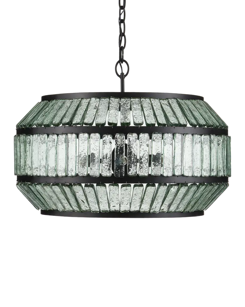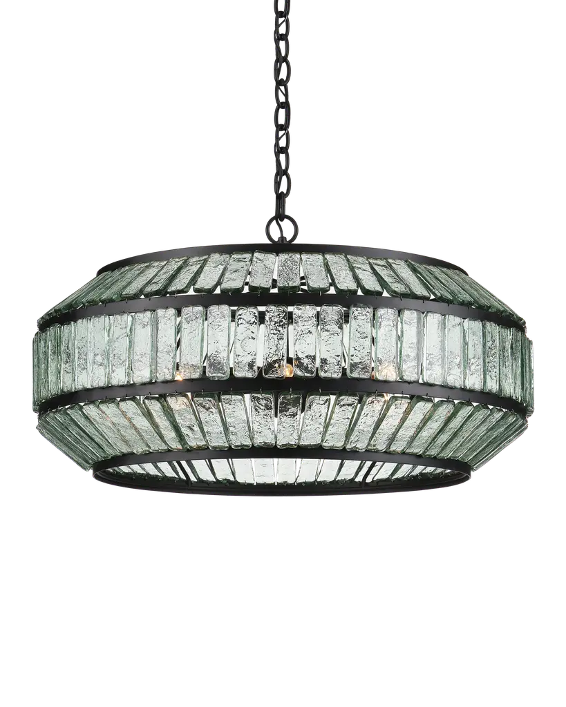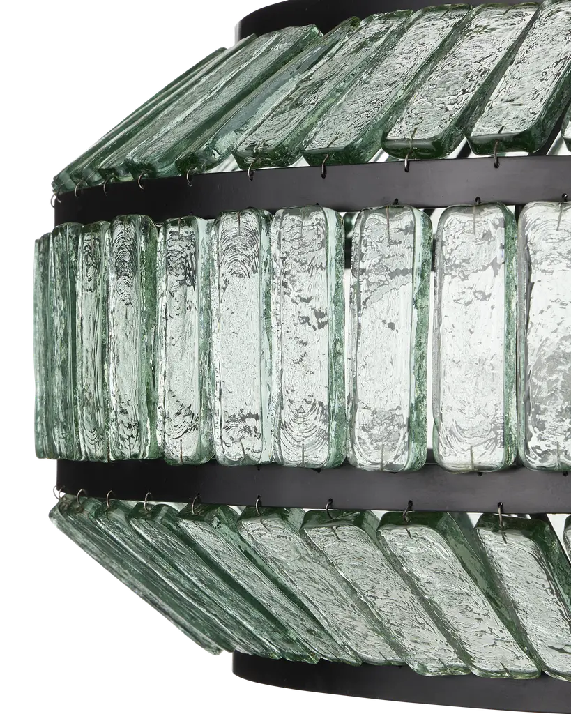 The Centurion Chandelier has elongated recycled glass panes that are unobtrusively fitted into wrought iron rings in a satin black finish. The thinness of the wire that fastens them makes this design feel streamlined and the wavy surfaces of the pieces of glass make it luminous. This black chandelier is stylistically suited to modern farmhouse, traditional, and transitional interiors. It hangs from an aircraft cable, which makes the design seem to float. Adjustable from 23.5" to 115.5" with use of included chain/rod kit/cable. If your space calls for a longer drop, additional chain/rods/cable is available for purchase. Wipe clean with a soft, dry cloth or static duster. Always avoid the use of harsh chemicals or abrasive cleaners as they may cause damage to the item's finish. Due to the use of natural materials, handmade craftsmanship, or hand finishing, expect some color variances. Hand crafted pieces may have slight size differences.