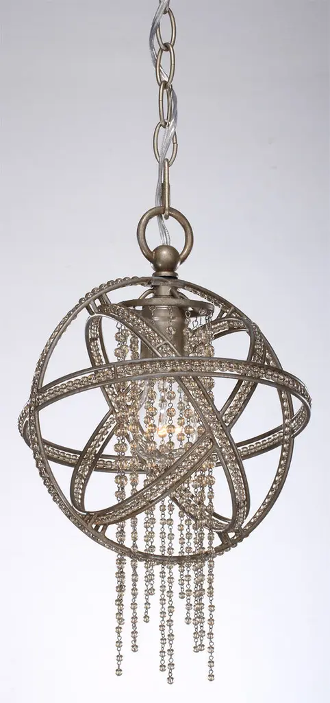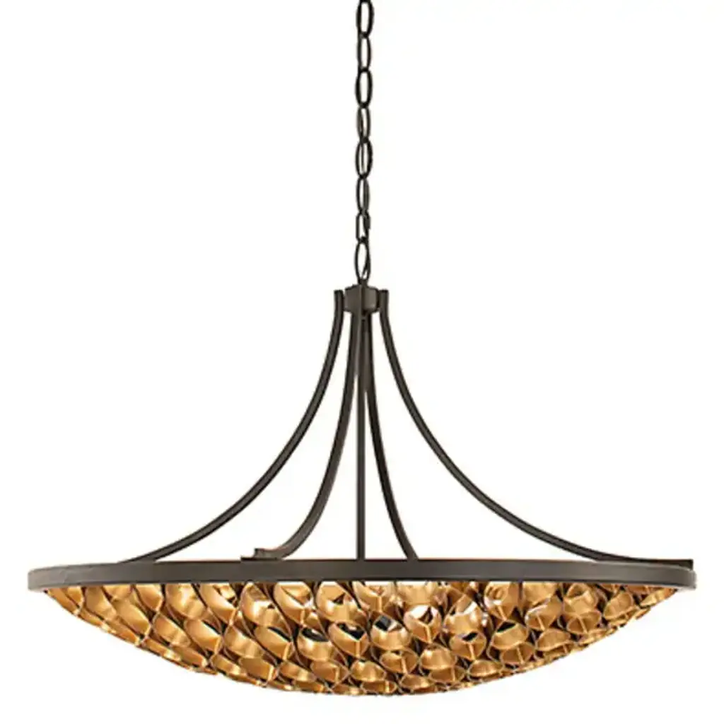 This unique scallop pattern transforms the bell-shaped Eduardo chandelier from typical to exceptional, the effect created when strands of thin iron wires are wrapped continuously around the circular form and swaged from its top canopy. Welded onto the striated metal strips, which have been left natural, are hints of brass that glint like gold when light strikes them. The six-light Eduardo Chandelier is a chic fixture that swings effortlessly from masculine to feminine design styles. Finish: Natural Iron/Brass Materials: Iron Overall: 31.5"h x 30.25"dia. Weight: 31 lb Lights: 6 Watts per Socket/Item: 60/360 Voltage: 120v Socket: E12 Suggested Bulb: B Torpedo Tip Light Direction: Ambient Chain Included: 6' Natural Iron Cord: 13' Silver Canopy: 6"DIA Canopy Shape: Round Free shipping in the U.S.