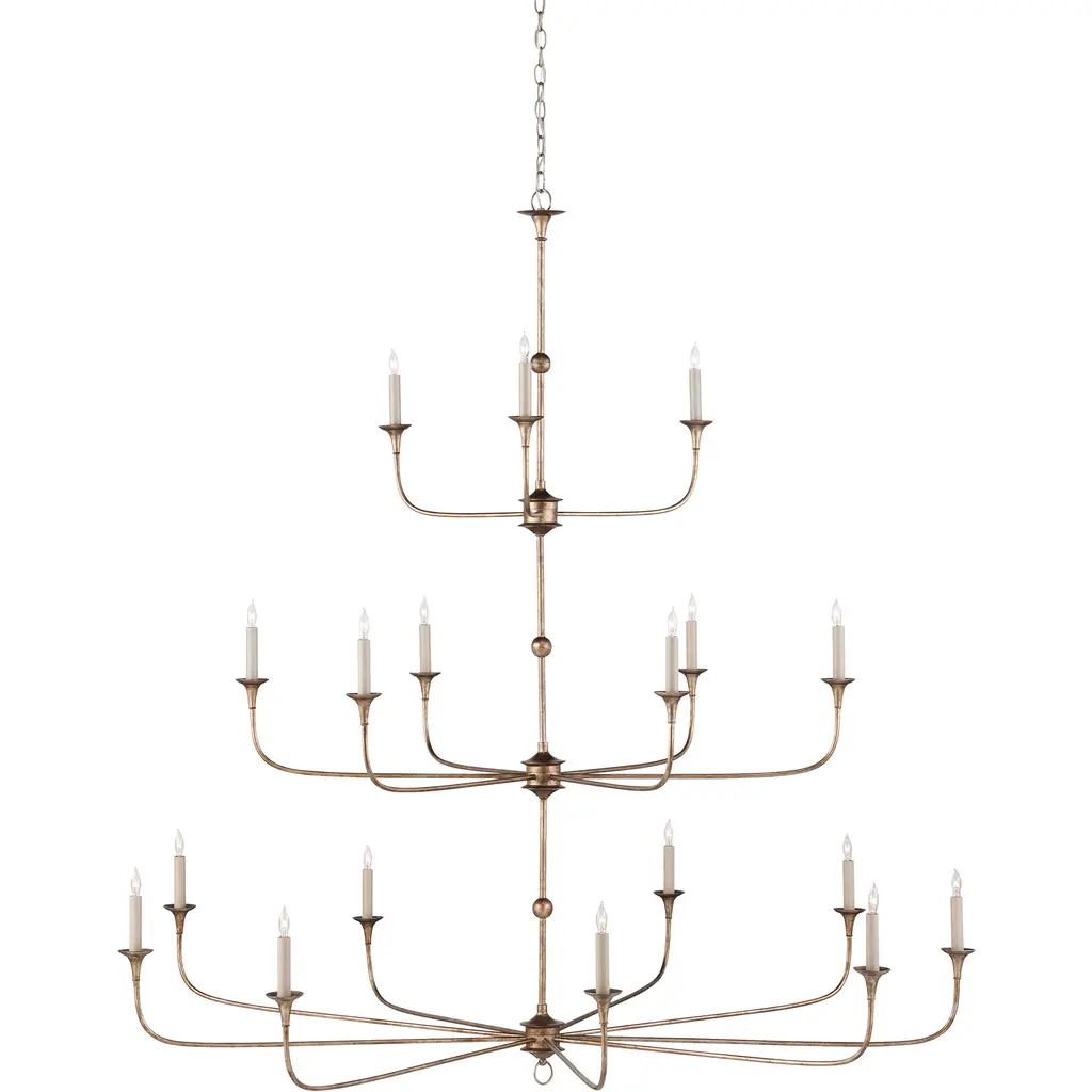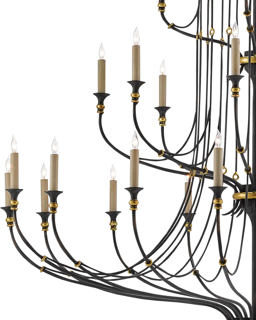 With a sweeping open form based on influences as diverse as Federal style and French neoclassicism, the Folgate Grande Chandelier is surprisingly large in scale given its airy appearance. The 28-light black chandelier is made of wrought iron in a French black finish, which is then enlivened by gold leaf accents. Adjustable from 68" to 150" with use of included chain/rod kit/cable. If your space calls for a longer drop, additional chain/rods/cable is available for purchase. Wipe clean with a soft, dry cloth or static duster. Always avoid the use of harsh chemicals or abrasive cleaners as they may cause damage to the item's finish. Due to the use of natural materials, handmade craftsmanship, or hand finishing, expect some color variances. Hand crafted pieces may have slight size differences.