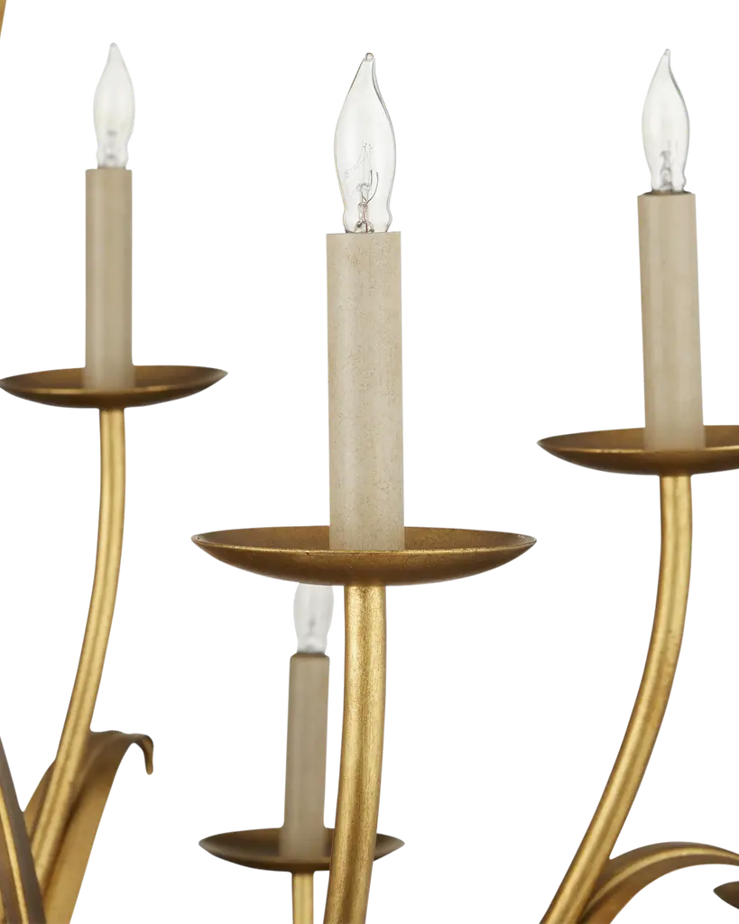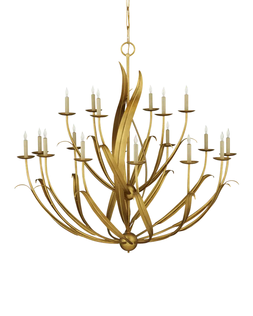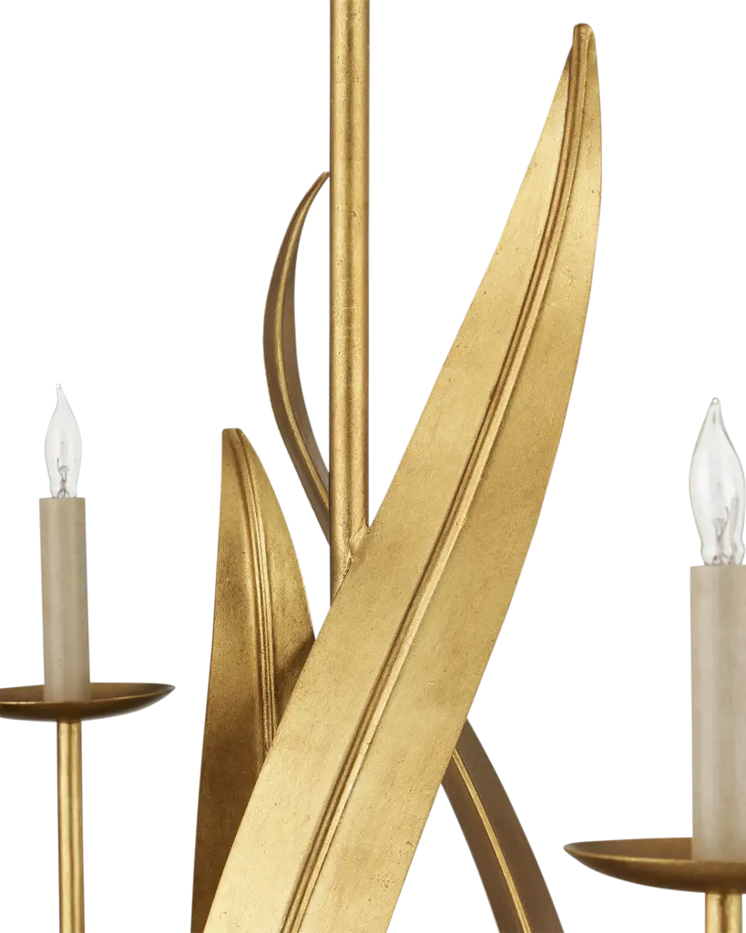 The swirl of long, slender leaves wave as if being stirred by summer breezes on the Menefee Large Gold Chandelier. The hand-applied antique gold leaf finish makes the wrought iron gleam on this transitional, nature-inspired form, whether the lights are switched on or not. This fixture is a statement piece at 50-inches in diameter, so it is perfect for statuesque foyers, open great rooms, or any room with high ceilings and/or expansive floor plans. Adjustable from 53.25" to 121.25" with use of included chain/rod kit/cable. If your space calls for a longer drop, additional chain/rods/cable is available for purchase. Wipe clean with a soft, dry cloth or static duster. Always avoid the use of harsh chemicals or abrasive cleaners as they may cause damage to the item's finish. Due to the use of natural materials, handmade craftsmanship, or hand finishing, expect some color variances. Hand crafted pieces may have slight size differences.
