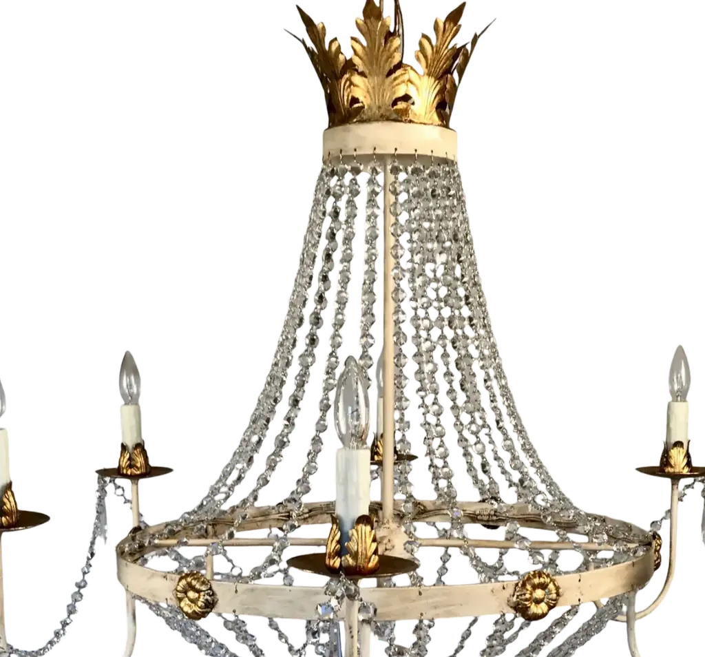 The "Flynn" chandelier is a stunning, made-to-order masterpiece that combines the elegance of white-painted metal with the richness of gold leaf and the dazzling beauty of crystal draping. This six-arm chandelier offers a sophisticated blend of classic and contemporary elements that elevate any interior space. The frame of the "Flynn" chandelier features a soft, white-painted finish that provides a refined, understated backdrop for the ornate gold leaf accents. Each of the six gracefully curved arms is adorned with gold leaf detailing, adding a touch of opulence to the overall design. The contrast between the matte white paint and the shimmering gold leaf creates a harmonious balance of luxury and subtlety. Suspended from each arm are delicate strands of hand-cut crystal draping, which cascade elegantly between the arms and from the central structure. The six arms hold candle-style lights, each perched atop a gilded bobeche, evoking a sense of old-world charm while providing warm, ambient lighting. The "Flynn" chandelier’s design is perfect for adding a touch of grandeur to formal dining rooms, elegant foyers, or living spaces.