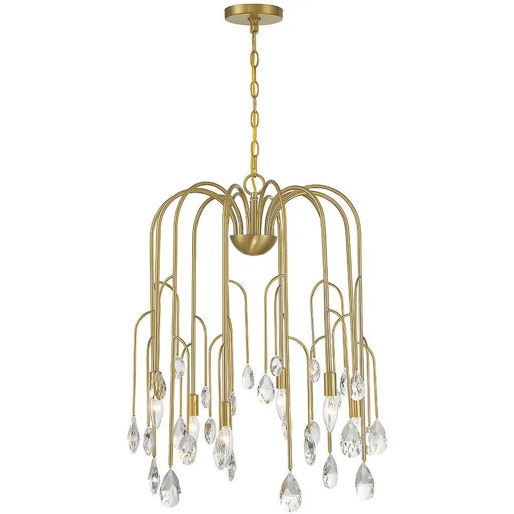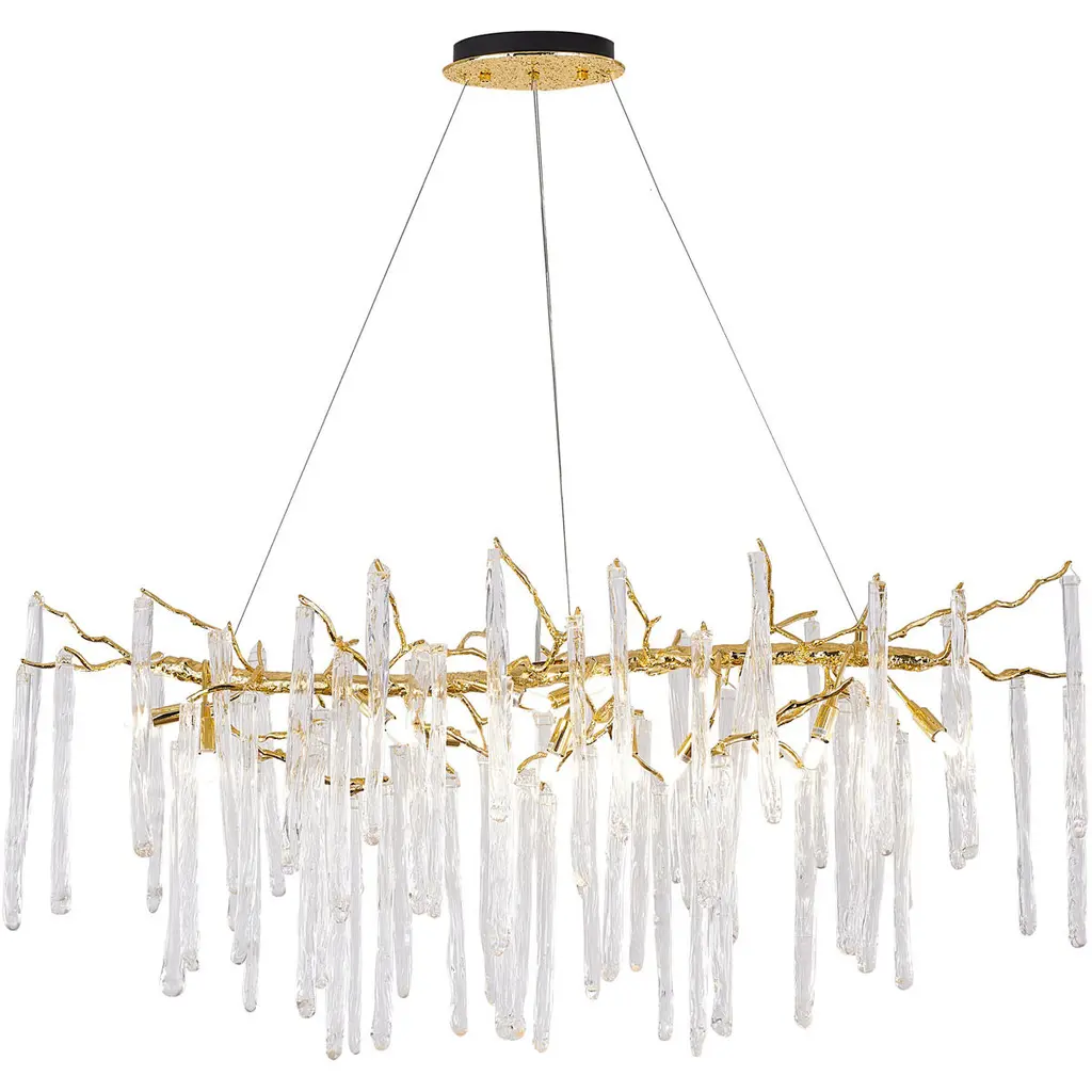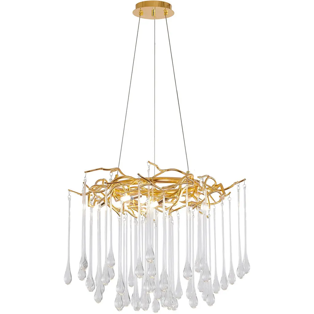 Your velvet modern chairs and this oversized Anita 12 Light Chandelier will create an ambiance that's indulgent and beautiful. This breathtaking down chandelier features clear teardrop crystals dramatically dripping from a golden tree branch sculpture. Add this transitional down chandelier to your dining room or living room for a luxurious look
