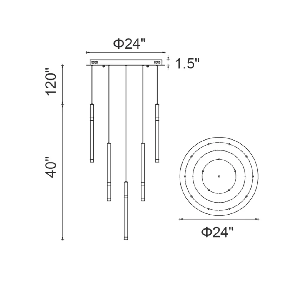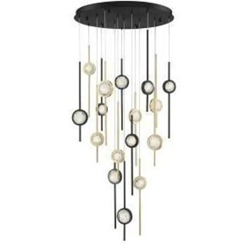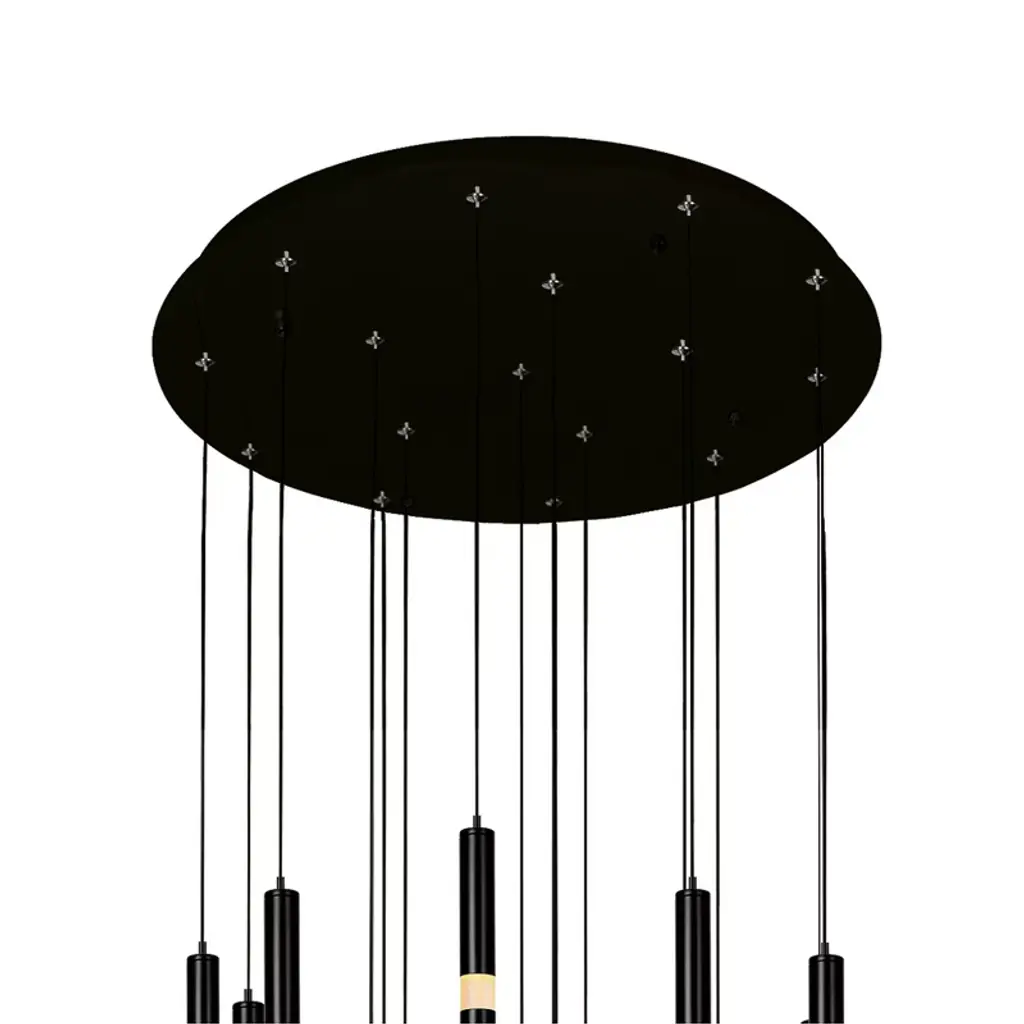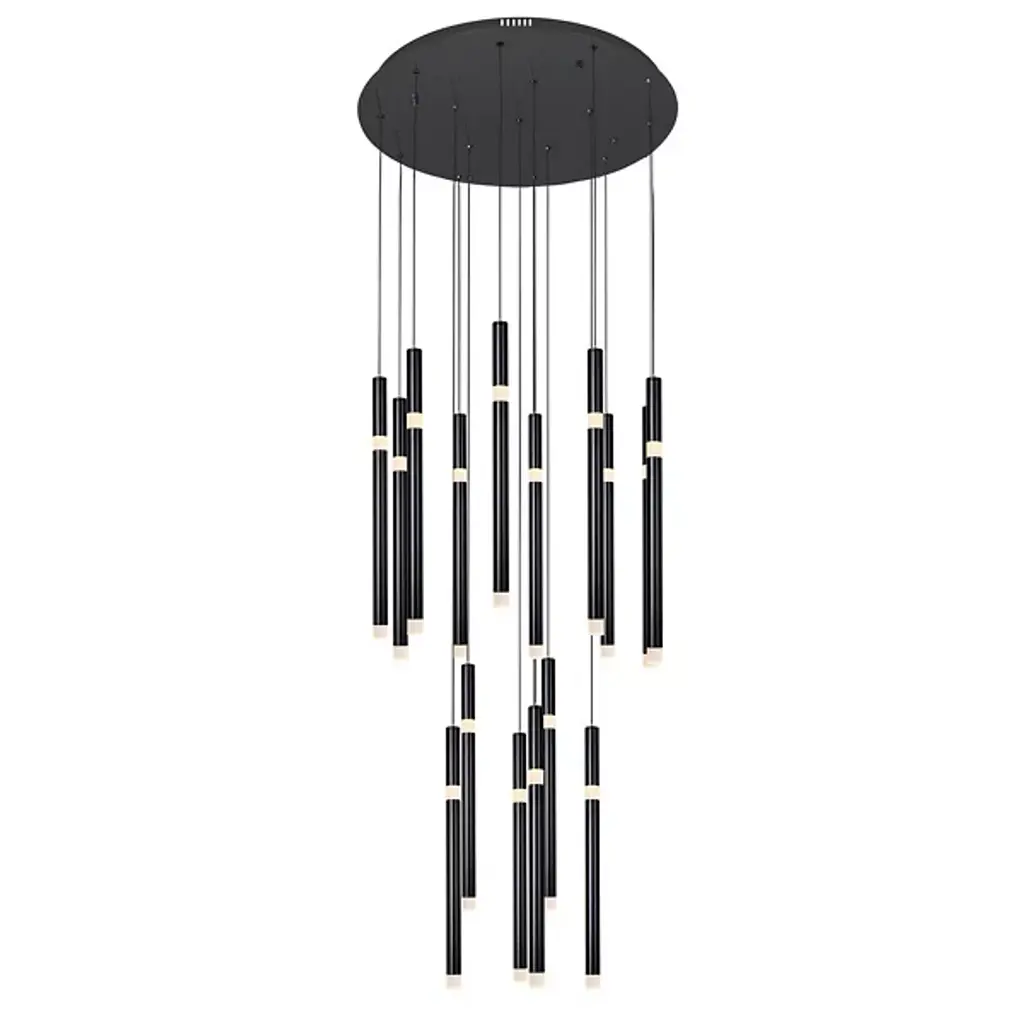 The Flute 16 Light Chandelier is a non-conventional light fixture. It features a 24 inch black canopy holding 15 slim bulbs that you can suspend at different heights. Perfect for a high ceiling, in the living room, dining, or bedroom, this modern chandelier will provide you with illumination and style that's easy on the eyes