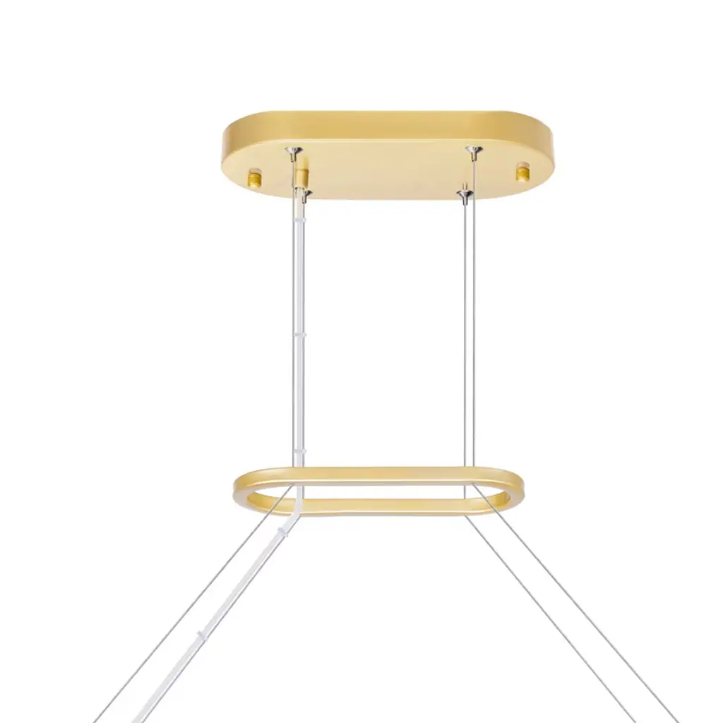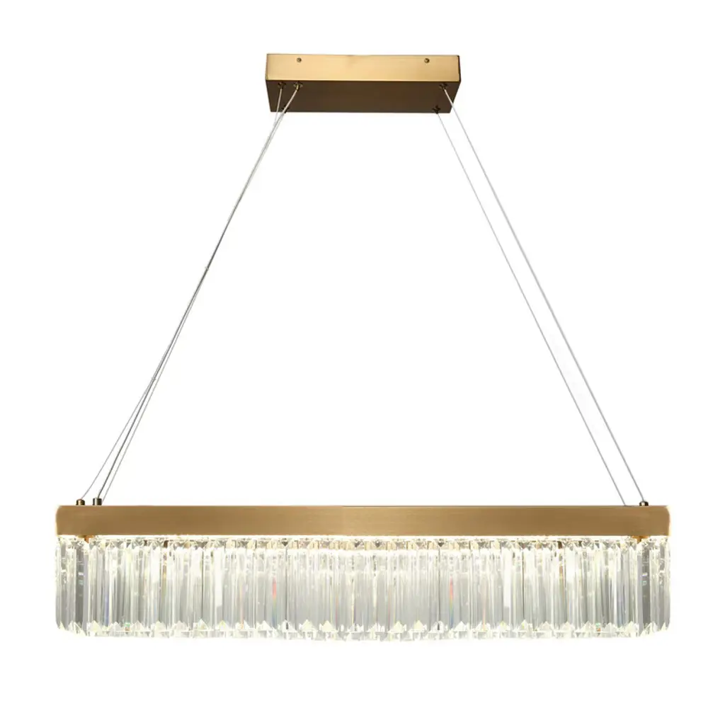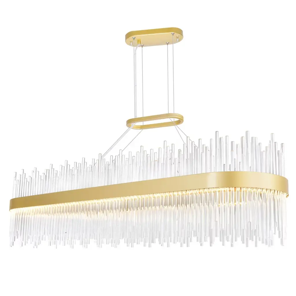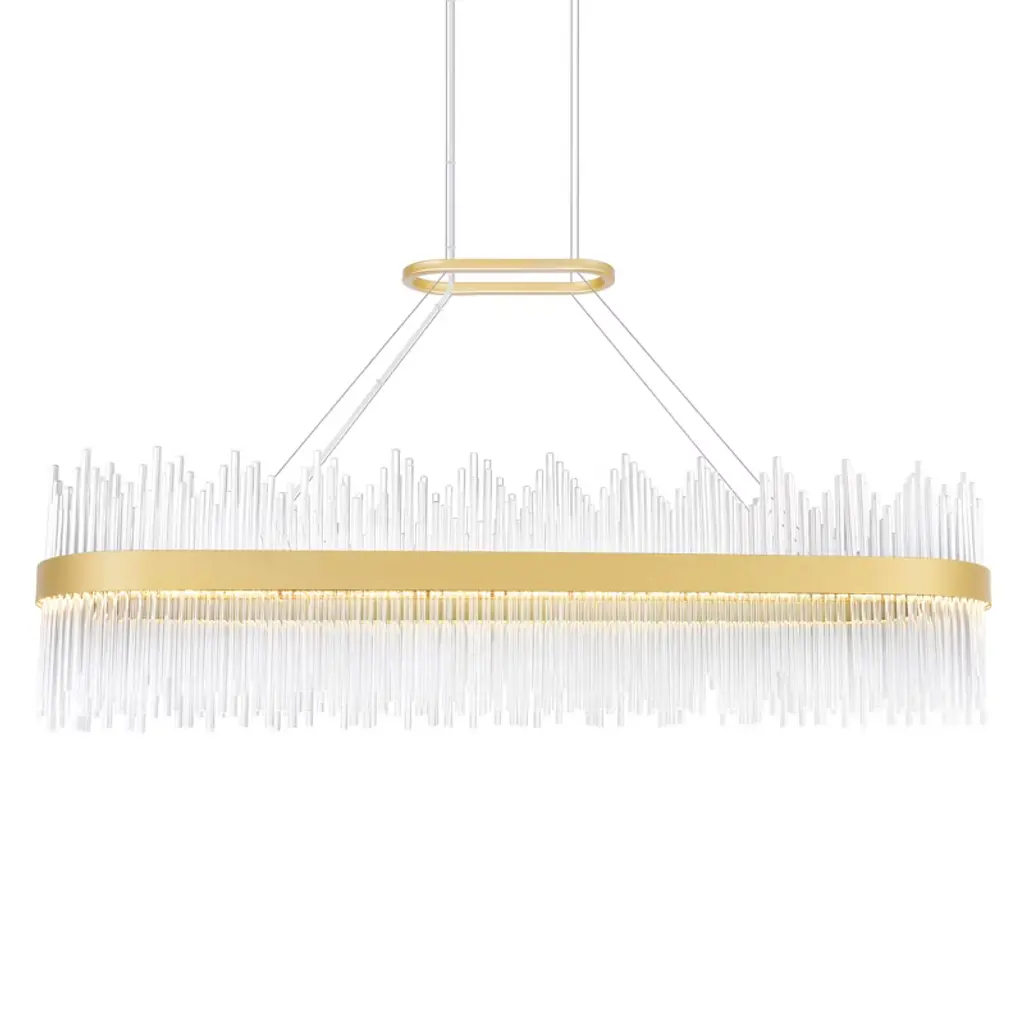 The Genevieve 47 inch LED Chandelier in Medallion Gold will undoubtedly update your decor. This transitional island/pool table light features a golden racetrack frame holding a graceful assembly of clear crystals. Offering you a glistening display of light, this elegant chandelier is sure to bring a wow factor to your dining room, large gourmet kitchen, or contemporary entertainment room