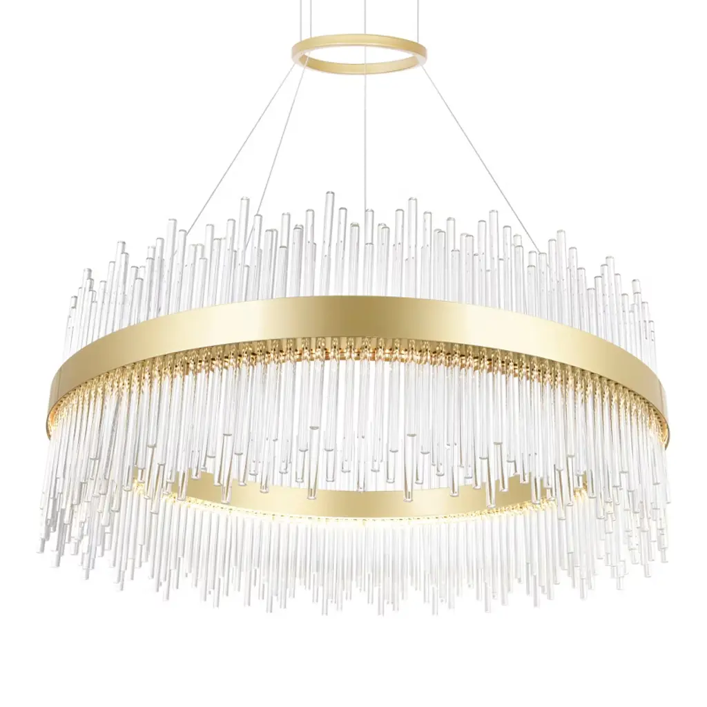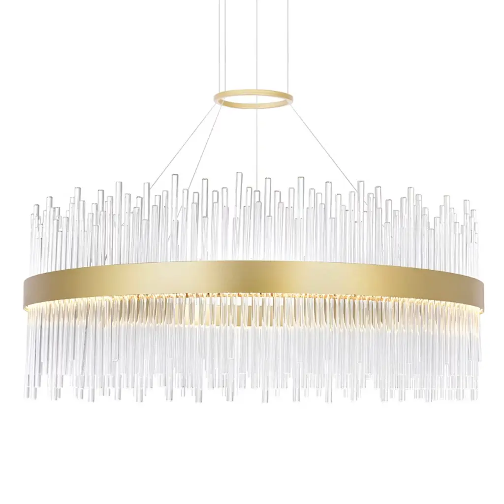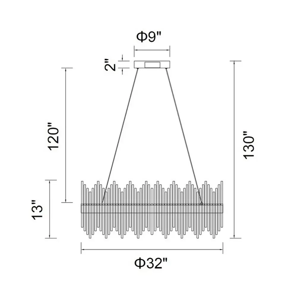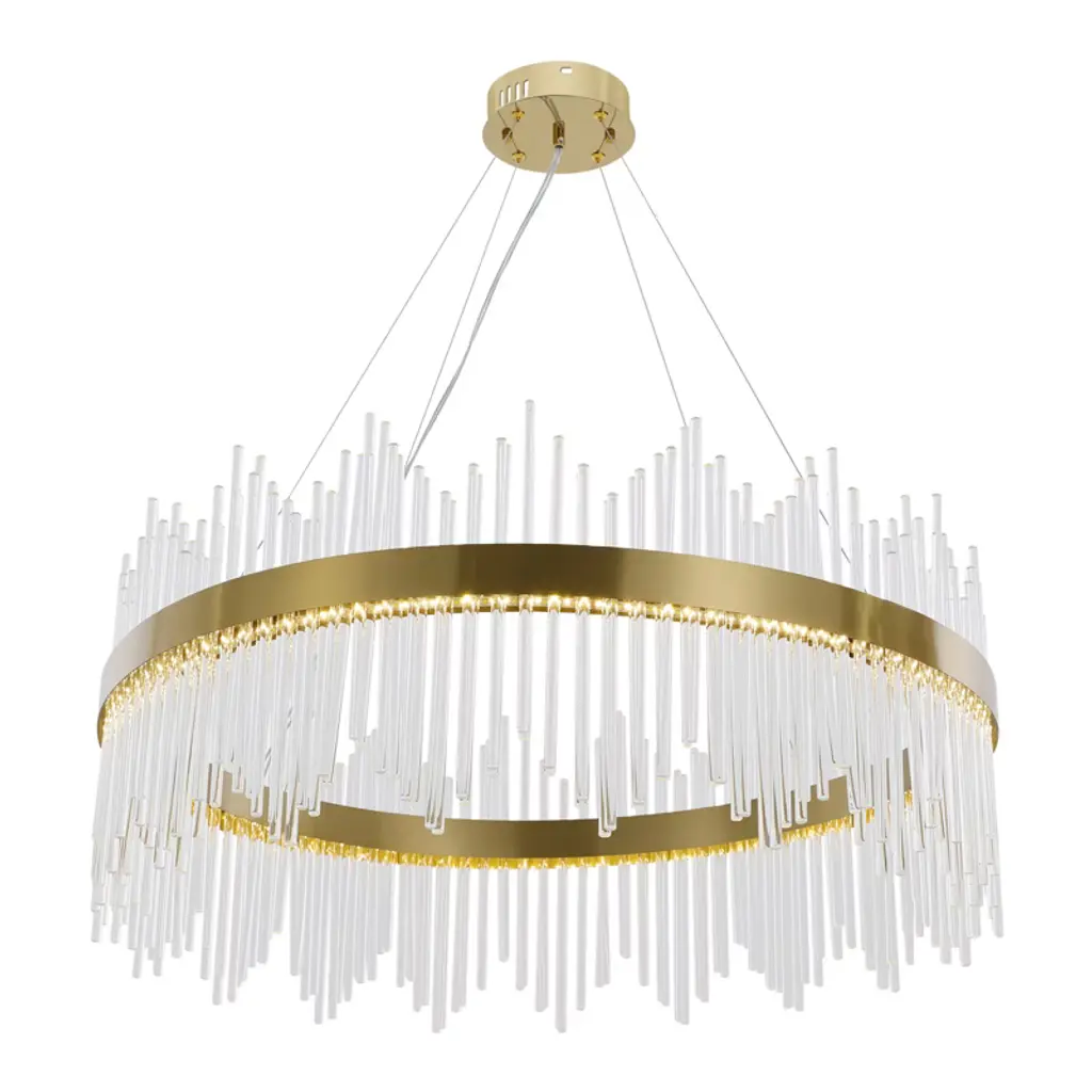 Slim clear crystal rods in varying heights make up the luxurious appeal of this Genevieve 32 inch LED Chandelier. This oversized round light fixture in medallion gold finish will give your home a seamless blend of brilliance and style. Best paired with a tufted and curved headboard or a clean-lined neutral sofa, this transitional LED chandelier will give your space a punchy mix of classic and contemporary