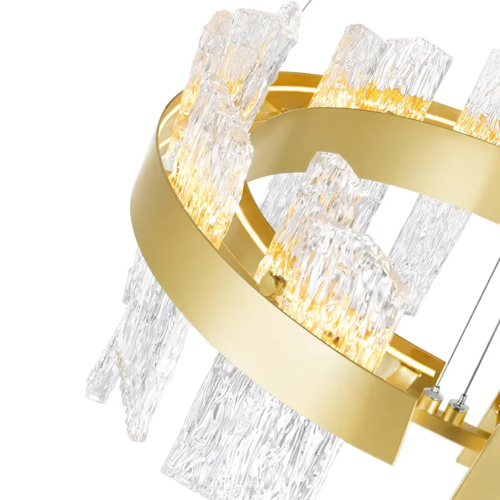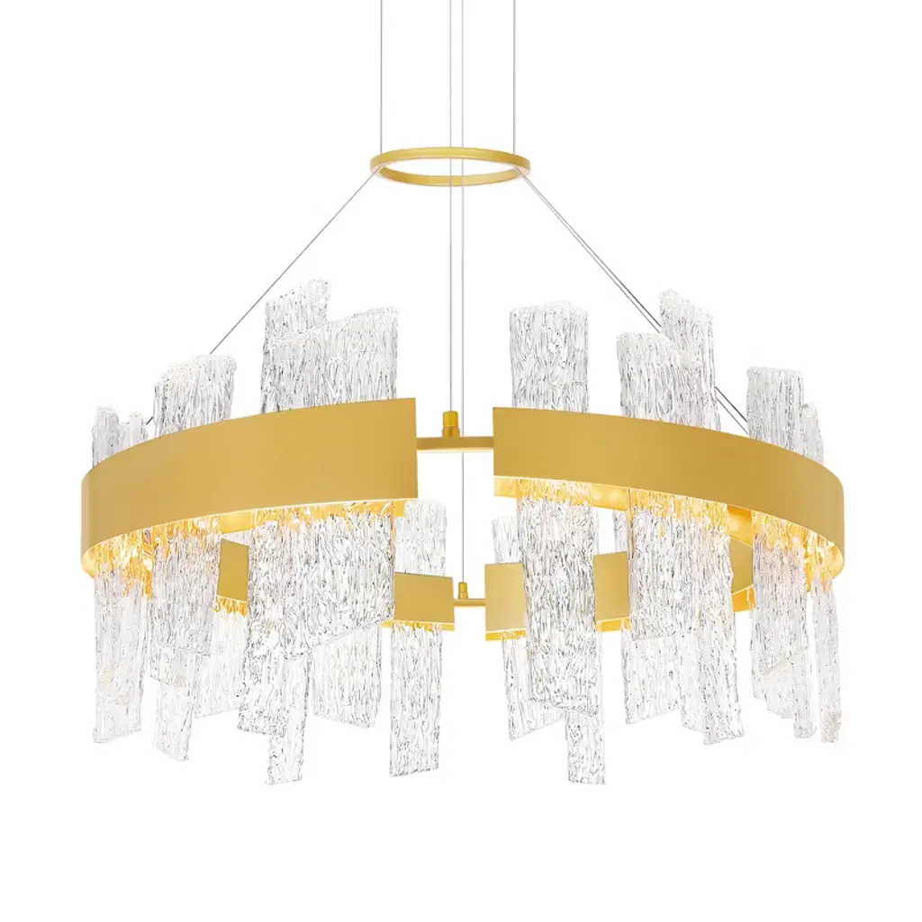 Give your dining room a modern glam glow with the Guadiana 32 inch Round Satin Gold LED Chandelier. This light source is designed with a black metal band embellished with narrow panels of clear textured glass. The overall look is simple yet luxurious which is perfect when you want to give your modern interiors a little sprucing up while still maintaining that air of minimalism