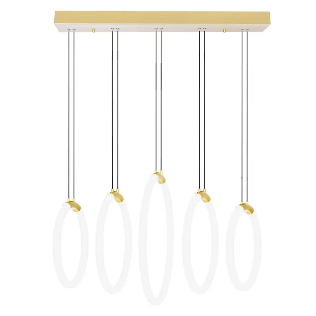 Circle your space with chic illumination and a bit of geometric flair through this Satin Gold Hoops 5 Light LED Chandelier.