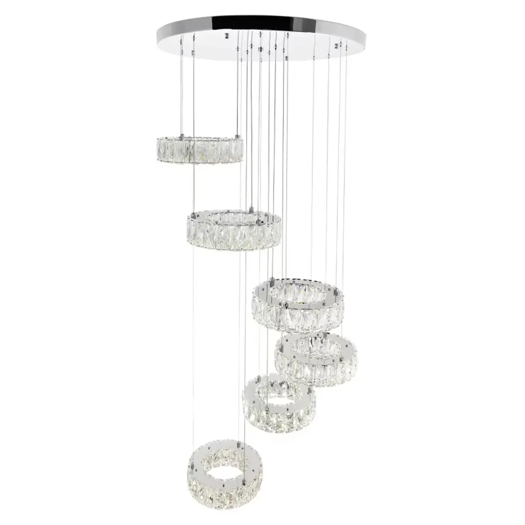Soften the hard surfaces and edges in your home with the presence of this Madeline 6 Ring LED Chandelier. Ready to balance angles are xix 10 inch by 3 inch crystal rings that cascade from a round chrome canopy. Position this in the stairwell, foyer, in your high-ceiling living room, or anywhere that needs a shot of glamour
