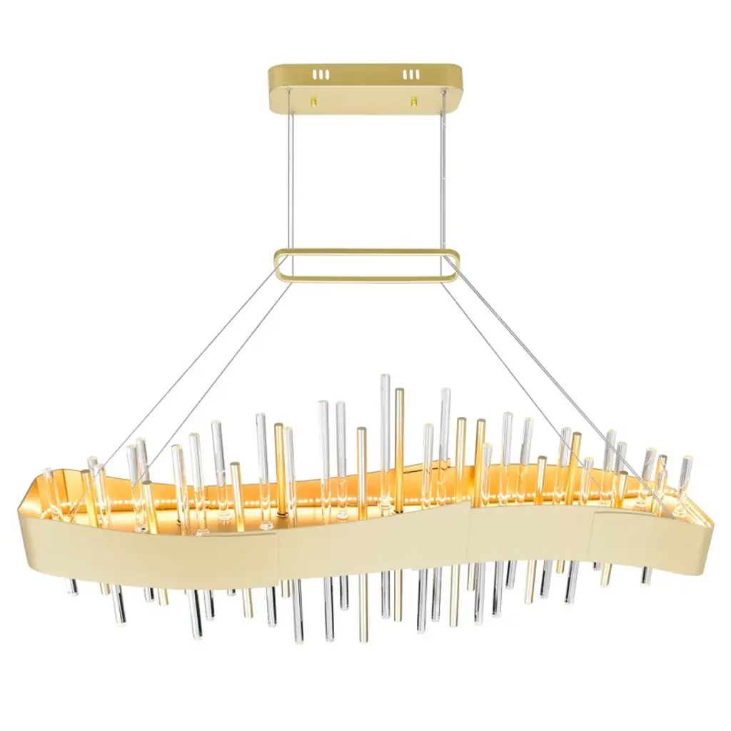 The Millipede 40 inch LED Chandelier in Satin Gold is here to help define the ambiance in your space. This modern interior lighting option features a curvy rectangular metal base adorned on its top and bottom edges with clear and gold glass tubes. As it diffuses a luxe glow, its subtle sculptural look also sets the design tone in the space