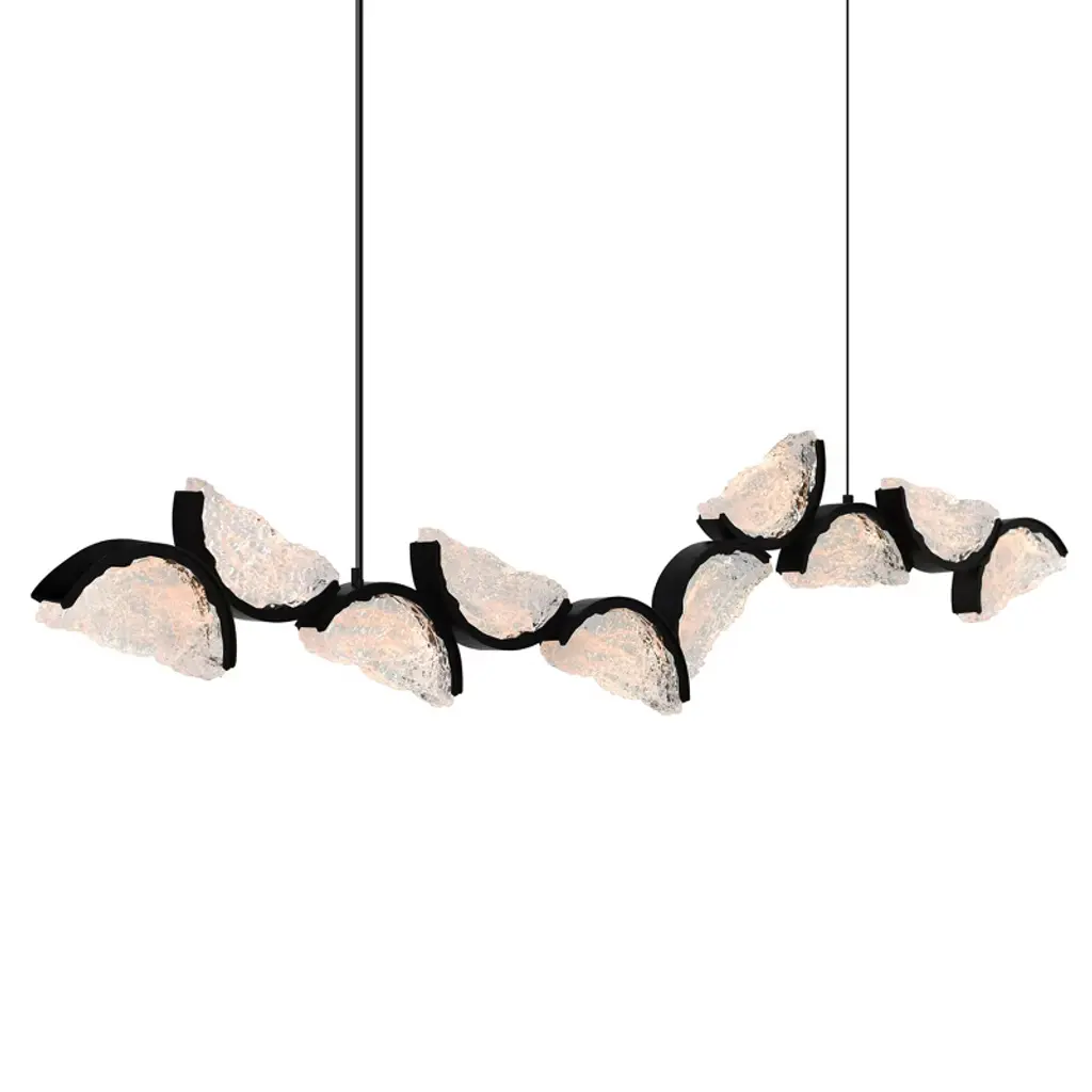 Introducing the Moon Integrated LED Chandelier, a breathtaking centerpiece that combines modern elegance with artisanal craftsmanship. This stunning chandelier features a sleek black finish, adding a touch of bold sophistication to any room. Its crescent-shaped panels, made from handcrafted glass, are intricately textured to capture the glowing essence of the moon, casting a warm, ambient light throughout your space. Each glass piece is uniquely crafted, ensuring every chandelier is a one-of-a-kind work of art. The contrast between the refined black finish and the luminous, handcrafted glass creates a striking visual impact, making the Moon Chandelier the perfect statement piece for dining rooms, living spaces, or grand entryways. Illuminate your home with the celestial beauty of this extraordinary chandelier, where craftsmanship meets cosmic elegance