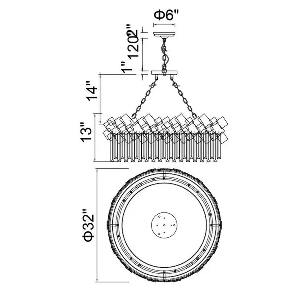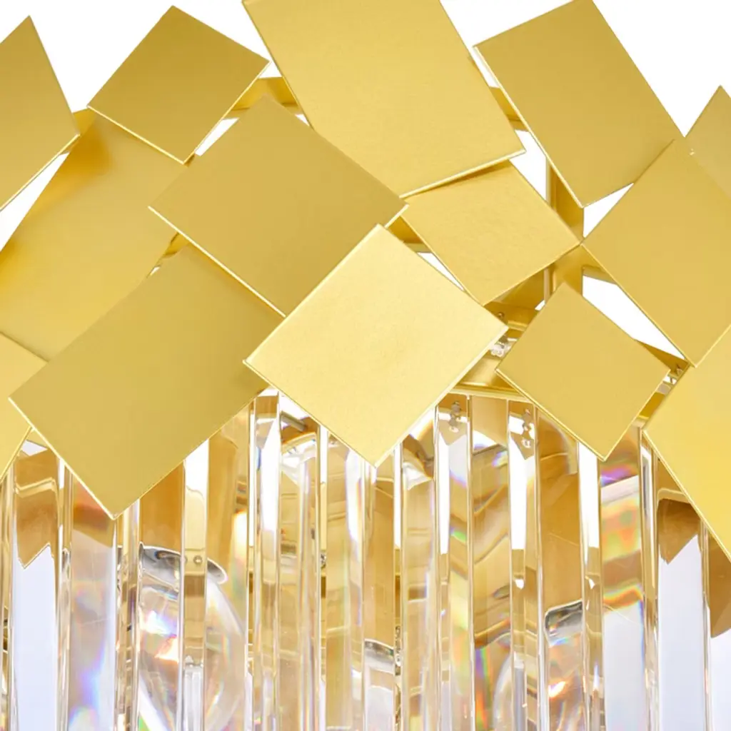 Transform an uninspiring space into a room you never want to leave by installing the Panache 8 Light Chandelier in Medallion Gold. This down chandelier is designed with a golden drum shade held by a golden chain. The 32 inch circular frame is covered with patches of metal square and rectangular cut-outs in medallion gold finish. Dripping from the round golden frame are clear crystal prisms that reflect the light provided by eight candelabra-based bulbs