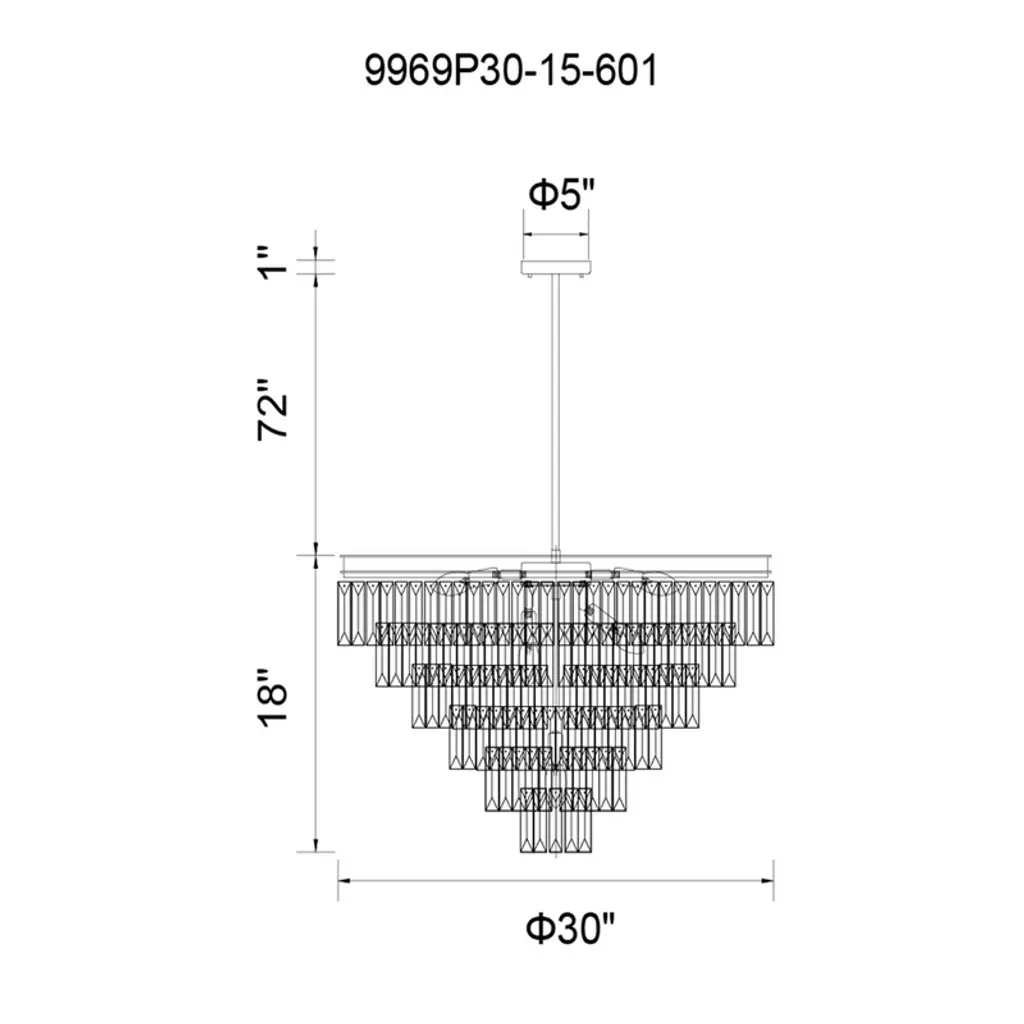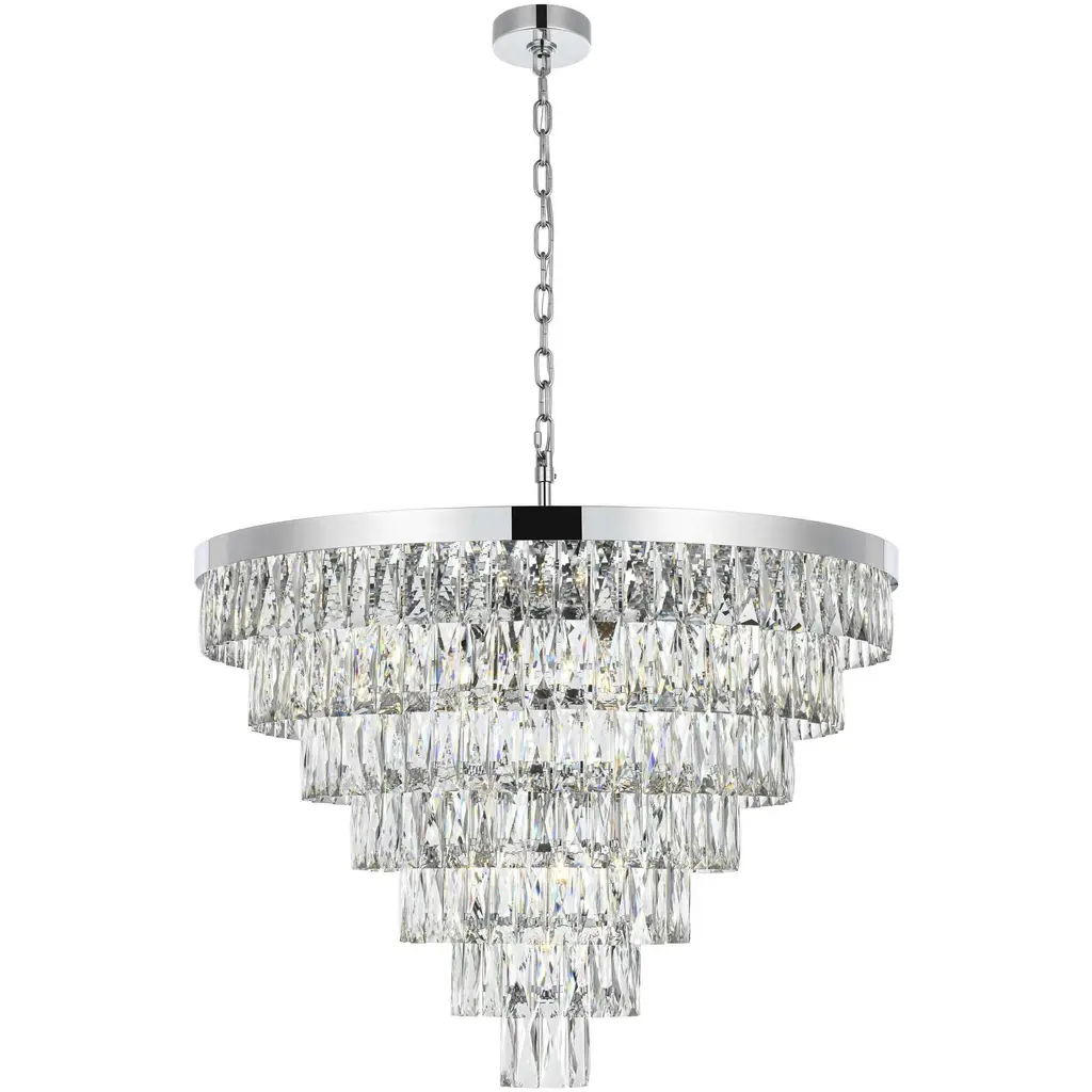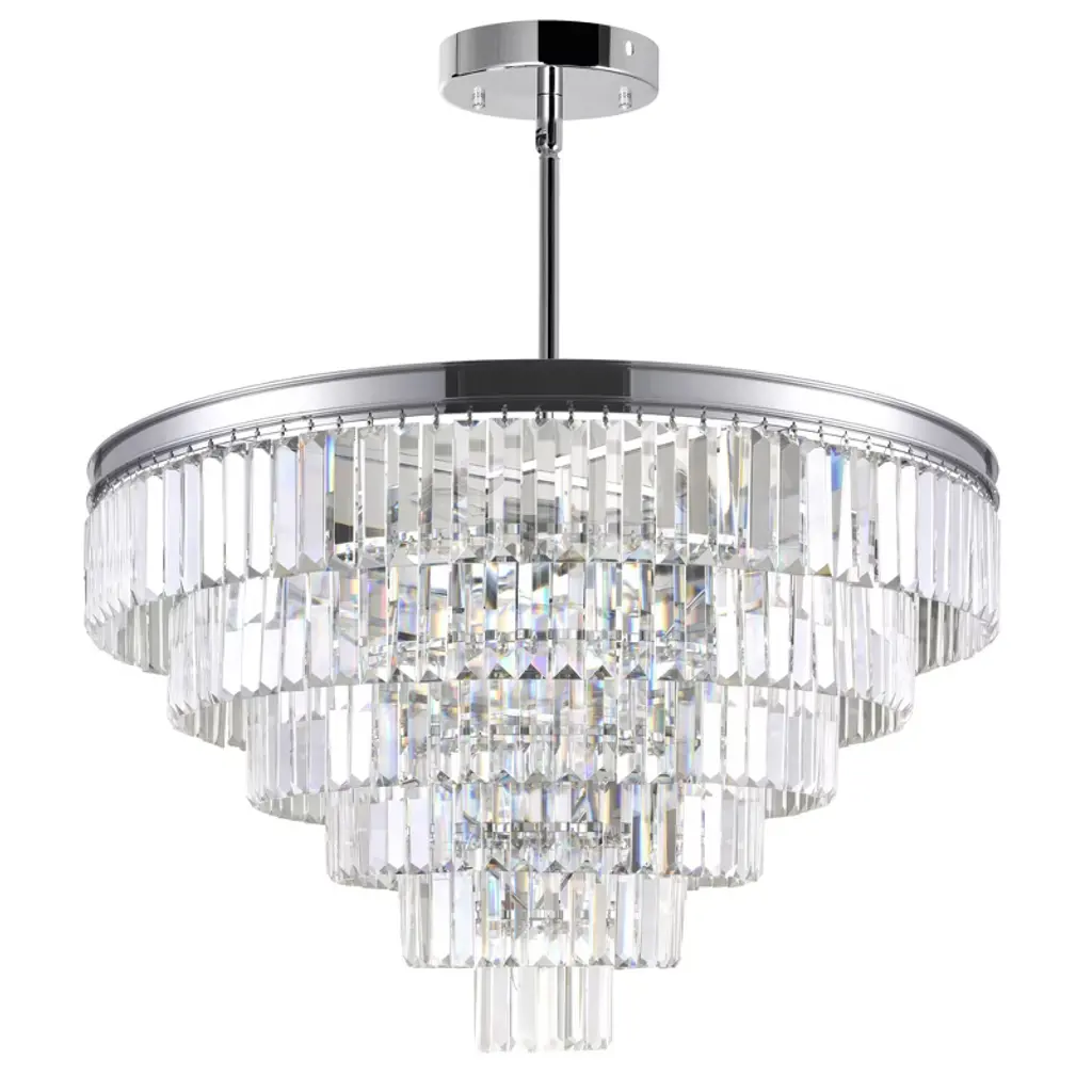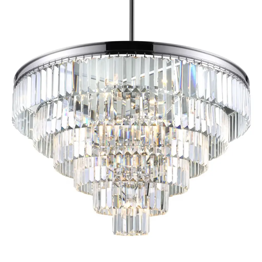 The Weiss 15 Light Chandelier in Chrome features exquisite crystal tiers creating a stunning traditional design that exudes a modern flair. This large 30 inch down chandelier has that glam factor that will make your space look upscale in an instant. Make your interiors look brighter and feel a lot bigger with the presence of this ultra-gorgeous chandelier.