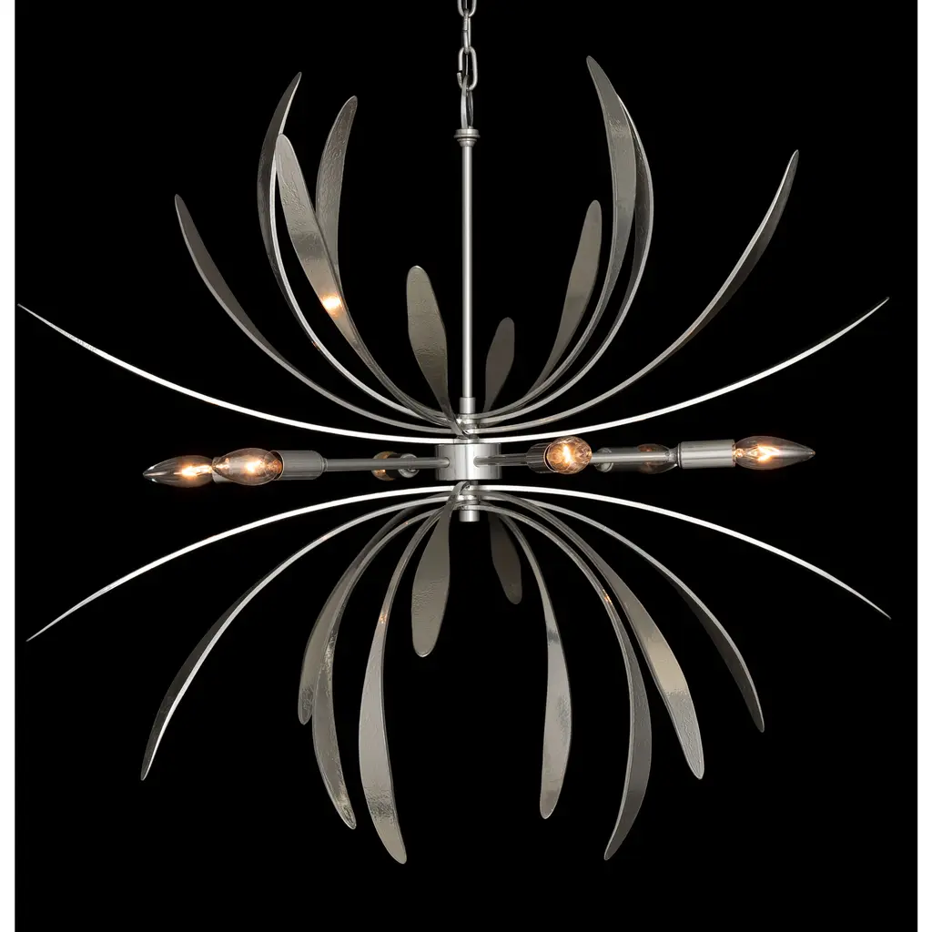 True to the beauty of its namesake flower, the Dahlia Chandelier provides a sculptural botanic aesthetic. Handcrafted forged steel “petals” flare outward from the center and are illuminated by 6 exposed bulbs. As versatile as it is stylish, the Dahlia Chandelier is available in your choice of finishes, making it the perfect pick for living room, dining or entryway lighting. Also available in a larger version.