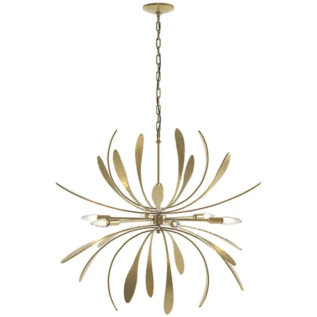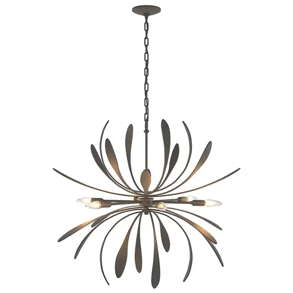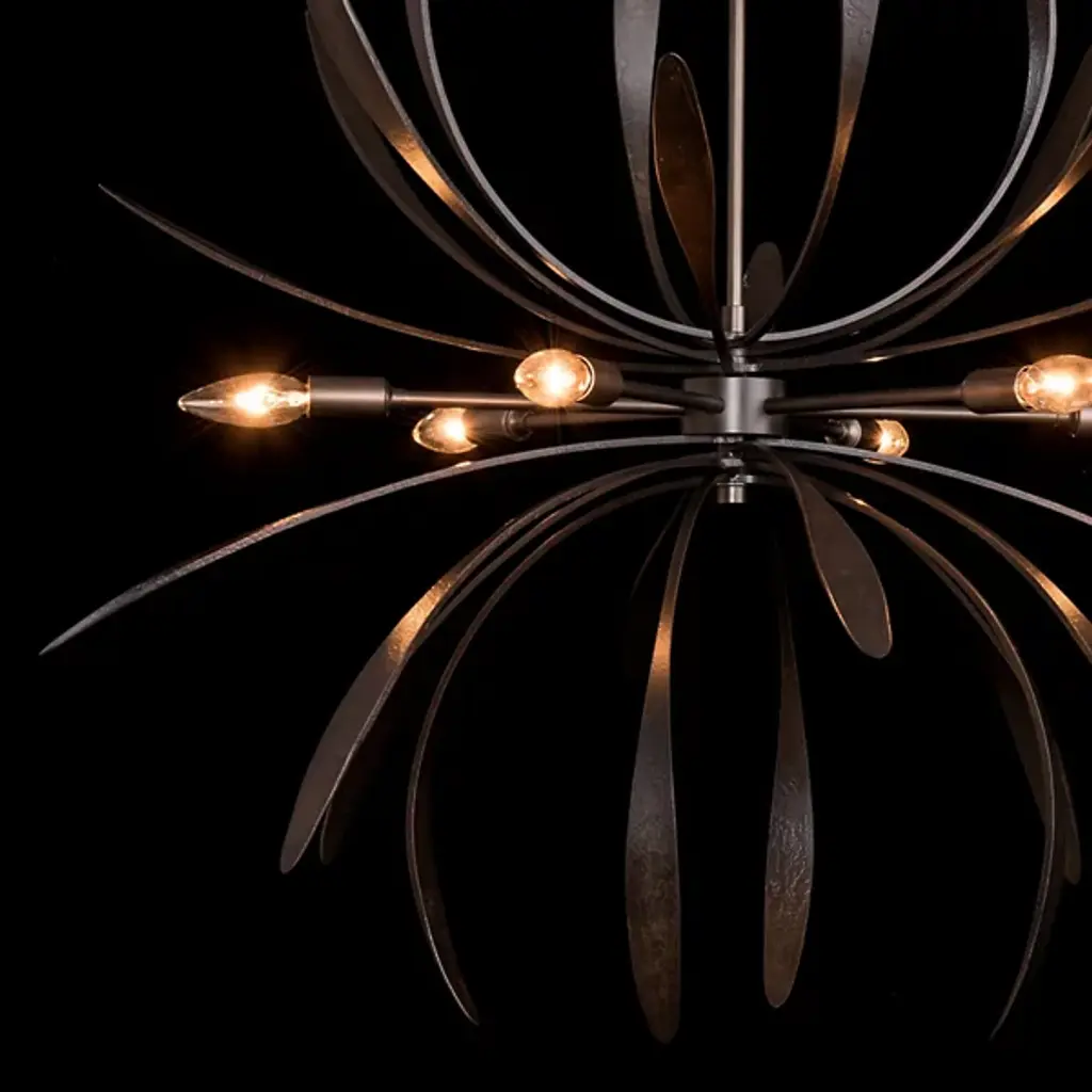 The Dahlia Chandelier by Hubbardton Forge presents a dynamic form that is named after a type of flower. Starting with hand forged metal, the numerous "petals" sprout from the center, and are complemented with exposed bulbs. Each petal is handmade by a skilled craftsman in a studio in Vermont, and must meet meticulous specifications. Use in an entryway to greet guests or in a living or dining room as a modern alternative to the standard chandelier.