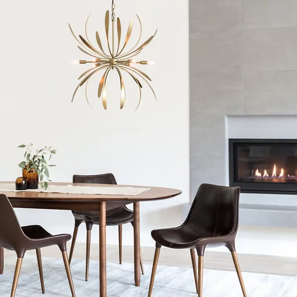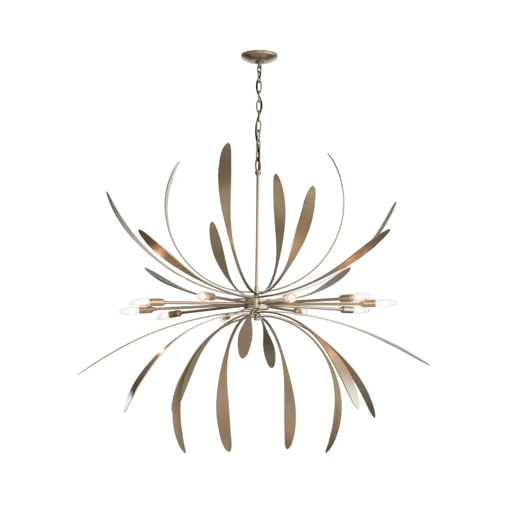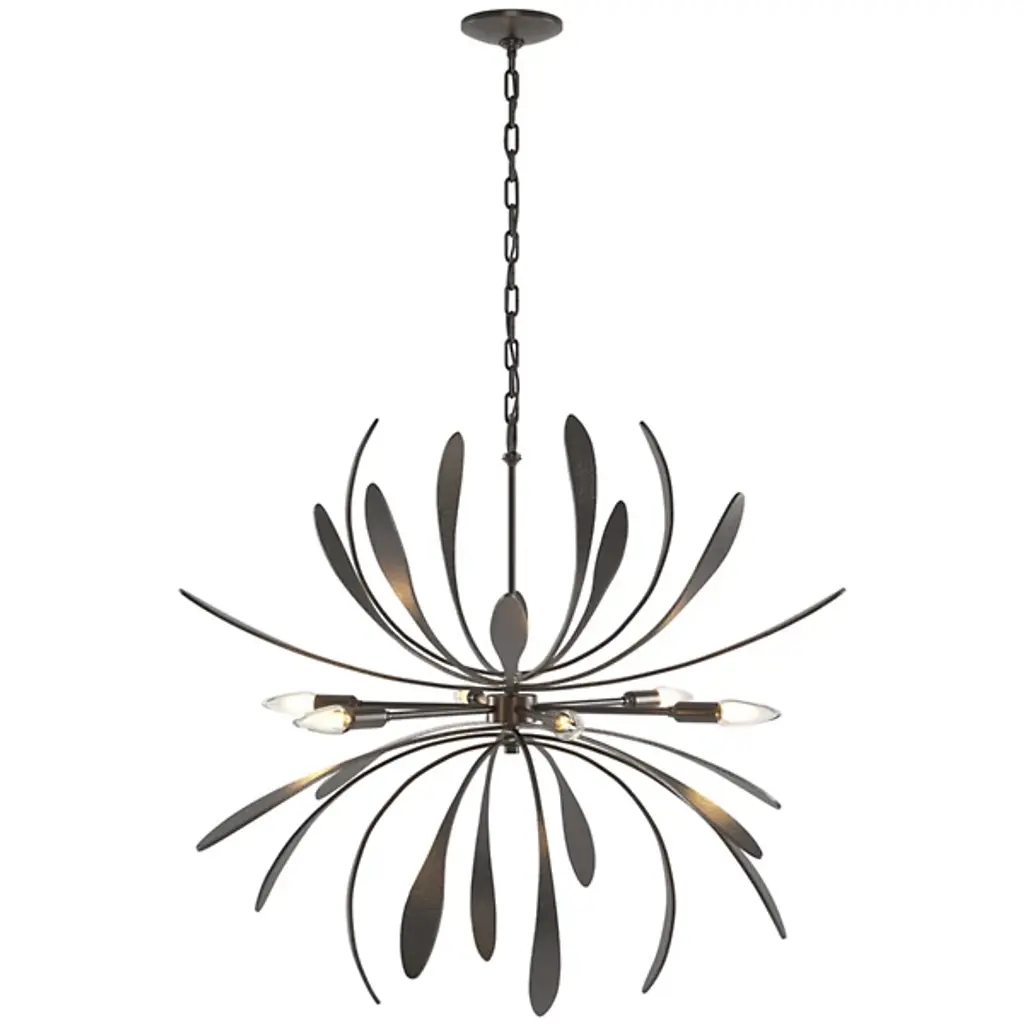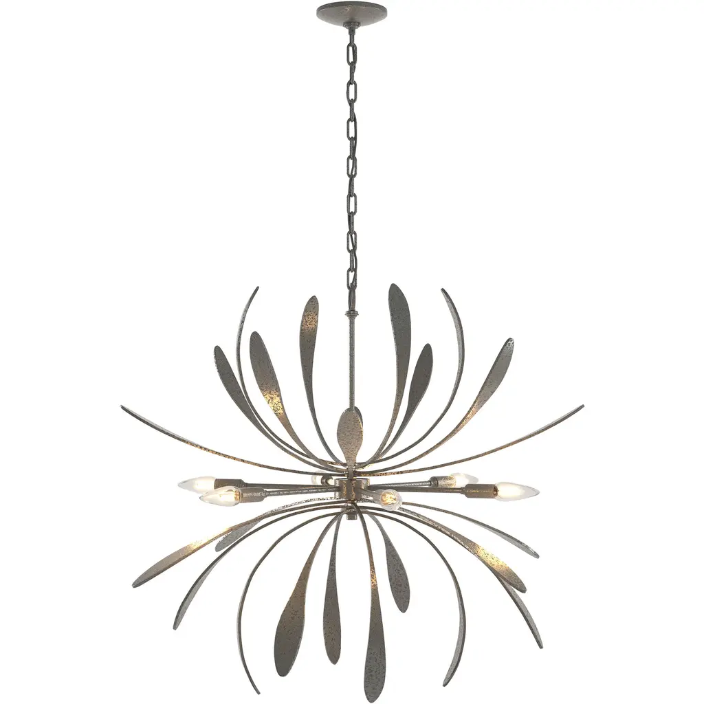 The Dahlia Chandelier by Hubbardton Forge presents a dynamic form that is named after a type of flower. Starting with hand forged metal, the numerous "petals" sprout from the center, and are complemented with exposed bulbs. Each petal is handmade by a skilled craftsman in a studio in Vermont, and must meet meticulous specifications. Use in an entryway to greet guests or in a living or dining room as a modern alternative to the standard chandelier.