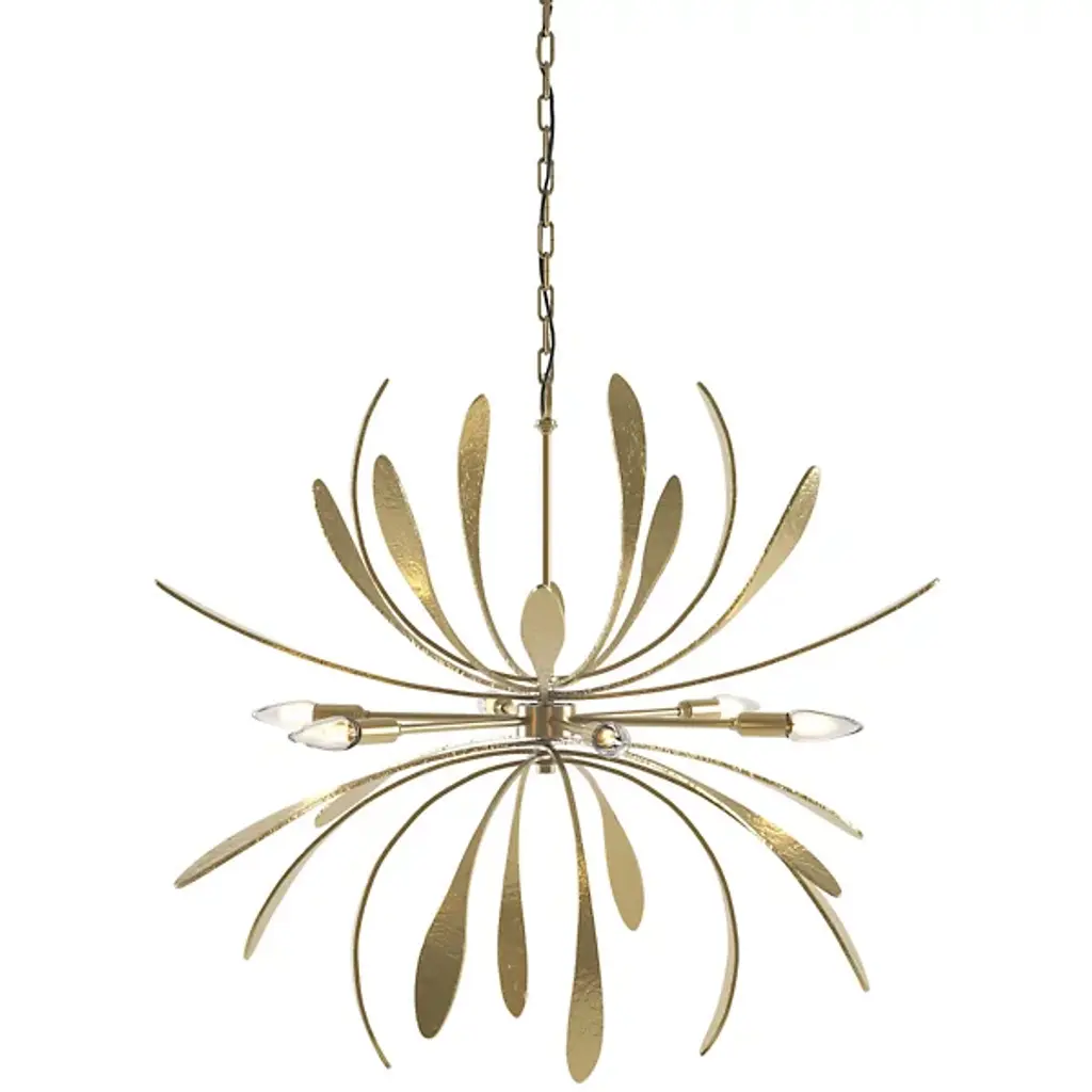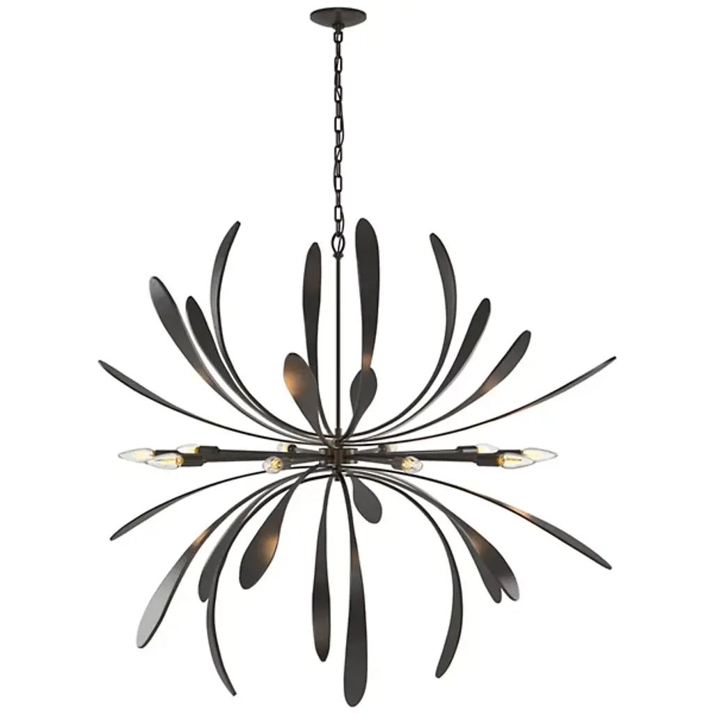 The Dahlia Chandelier by Hubbardton Forge presents a dynamic form that is named after a type of flower. Starting with hand forged metal, the numerous "petals" sprout from the center, and are complemented with exposed bulbs. Each petal is handmade by a skilled craftsman in a studio in Vermont, and must meet meticulous specifications. Use in an entryway to greet guests or in a living or dining room as a modern alternative to the standard chandelier.
