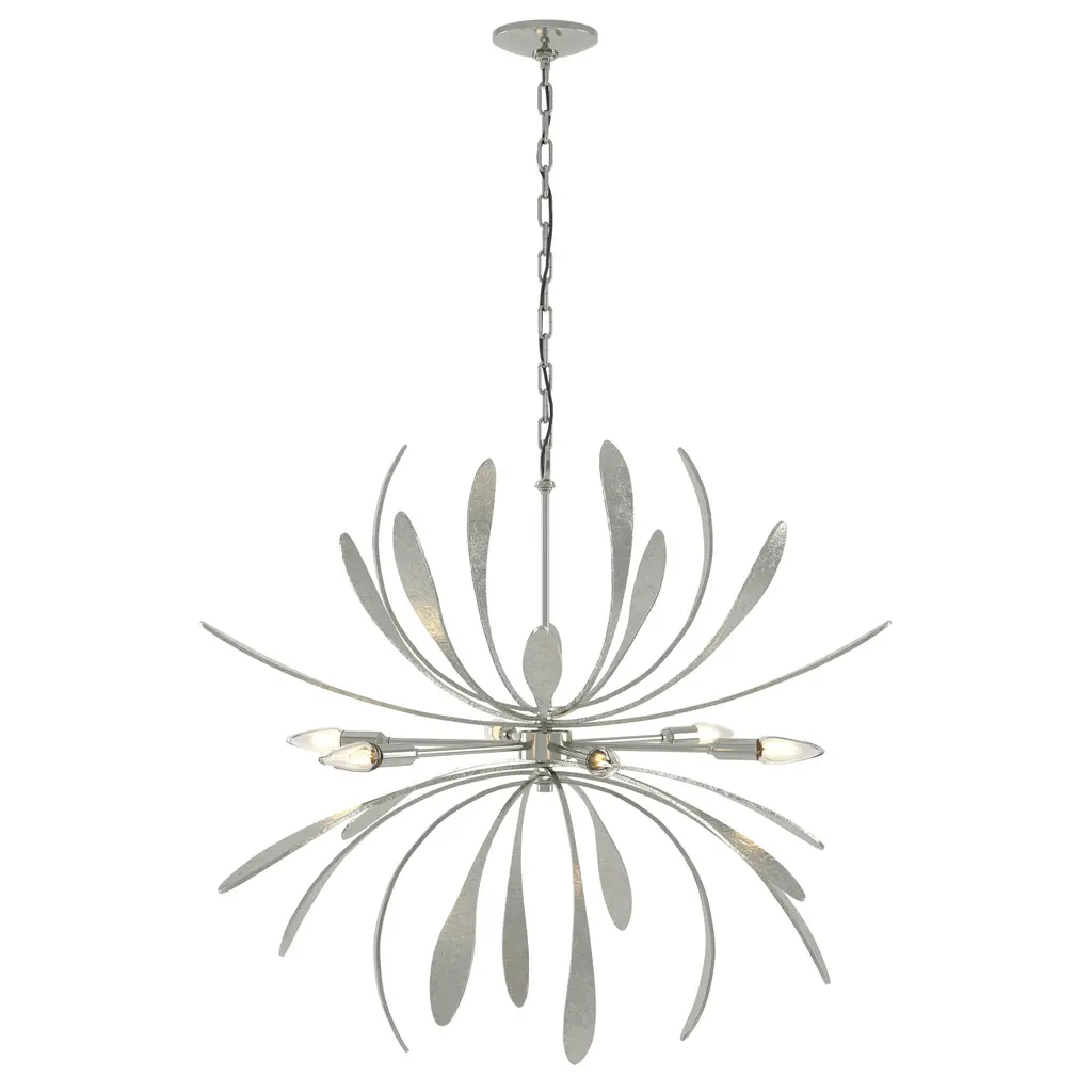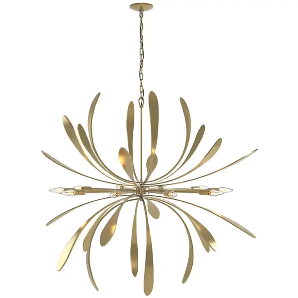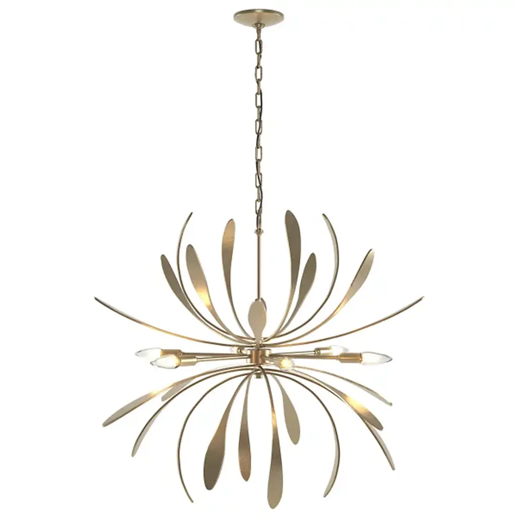The Dahlia Chandelier by Hubbardton Forge presents a dynamic form that is named after a type of flower. Starting with hand forged metal, the numerous "petals" sprout from the center, and are complemented with exposed bulbs. Each petal is handmade by a skilled craftsman in a studio in Vermont, and must meet meticulous specifications. Use in an entryway to greet guests or in a living or dining room as a modern alternative to the standard chandelier.