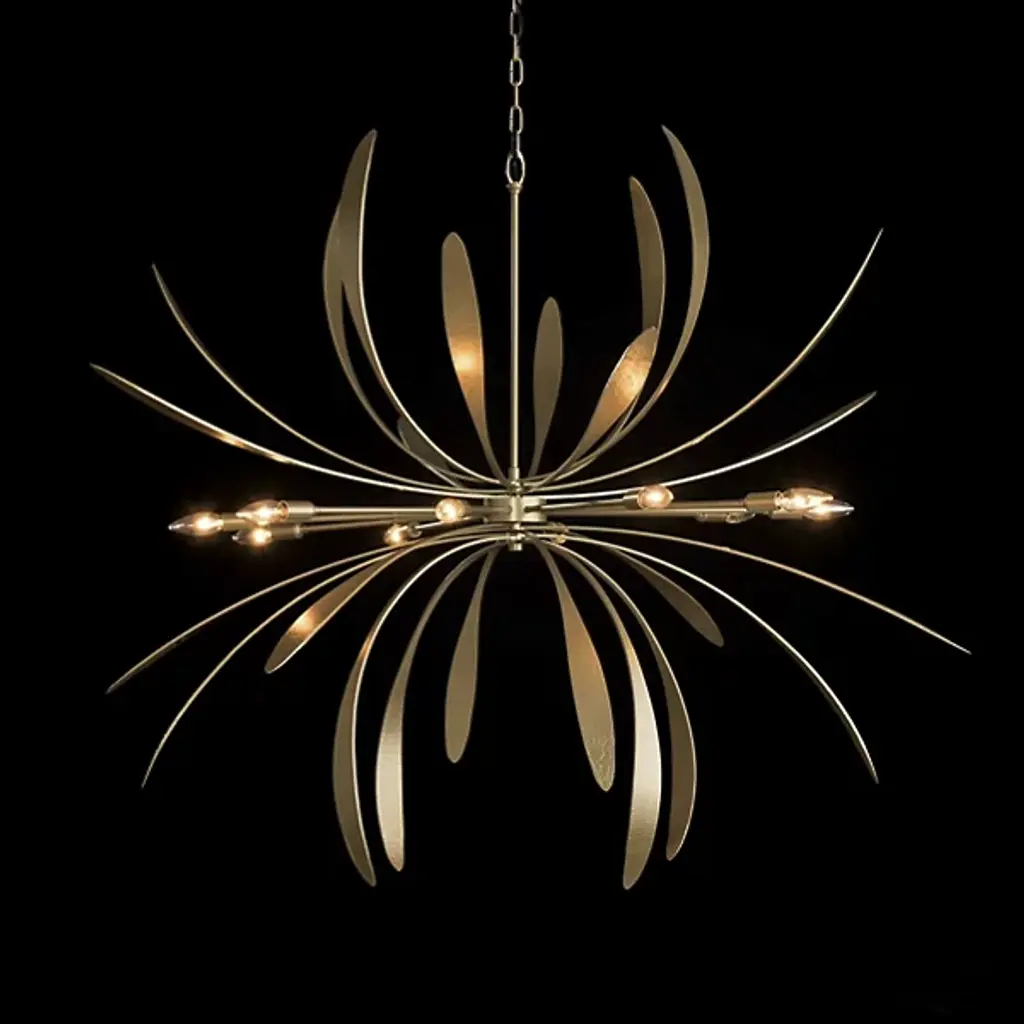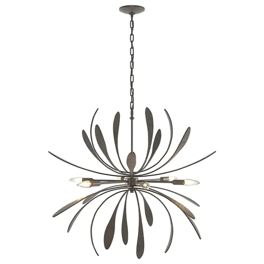 The Dahlia Chandelier by Hubbardton Forge presents a dynamic form that is named after a type of flower. Starting with hand forged metal, the numerous "petals" sprout from the center, and are complemented with exposed bulbs. Each petal is handmade by a skilled craftsman in a studio in Vermont, and must meet meticulous specifications. Use in an entryway to greet guests or in a living or dining room as a modern alternative to the standard chandelier.