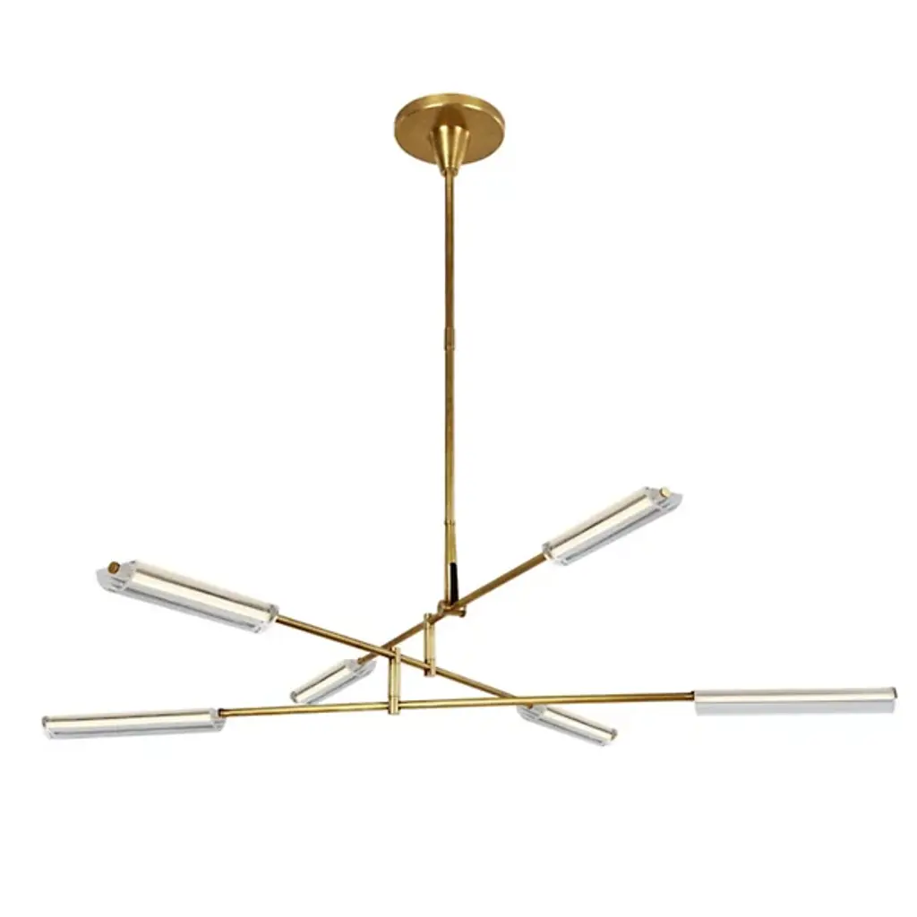 Transform the atmosphere of your favorite room with the Daley LED Chandelier from Visual Comfort Signature, formerly known as Visual Comfort, With an open and abstract silhouette, this piece provides an even and welcoming layer of light. A single downrod made of shining metal connects to a rounded ceiling plate and drops from it, upholding three matching, angled rods that are each adorned with a pair of lengthy LEDs. The light from the LEDs ensure a steady and encompassing flow whenever in use.