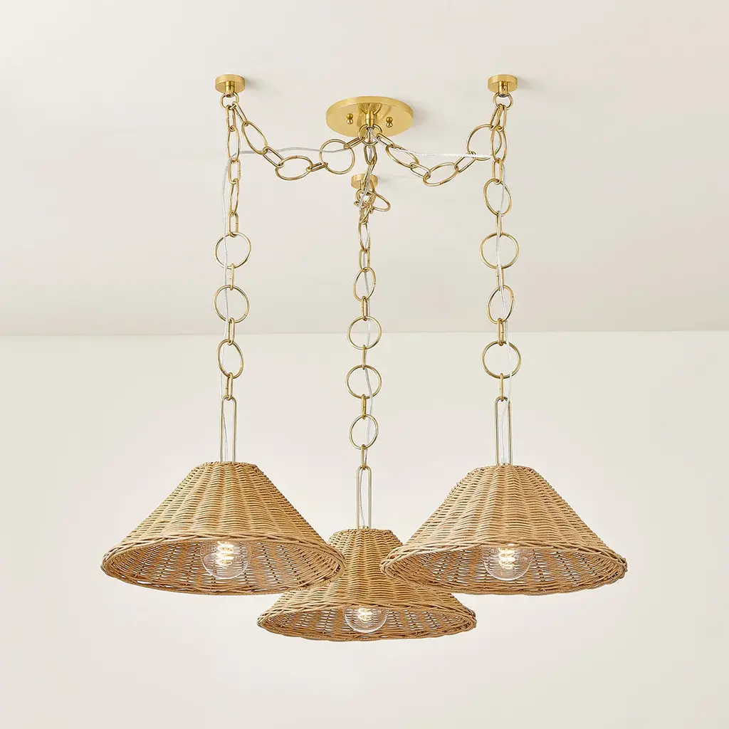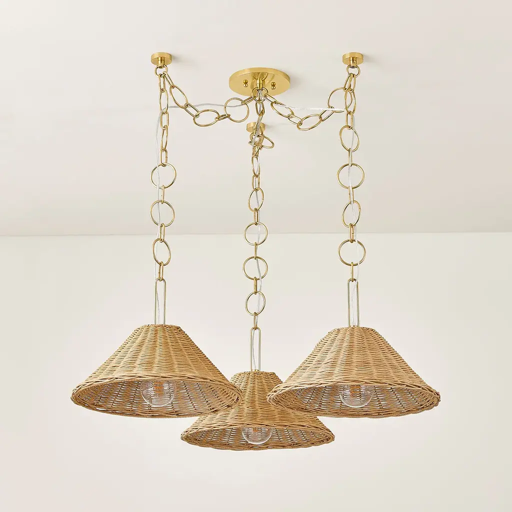 "Updating a classic silhouette with contemporary materiality, Dalia features a large, tapered shade woven from rattan wicker. The refined metal work is finished in Aged Brass, adding a timeless, vintage quality to the fixture. Available as a 1-light sconce or 3-light chandelier, Dalia introduces a pop of texture and style to any space. *Due to the one-of-a-kind nature of the medium, exact colors and patterns may vary slightly from the image shown."