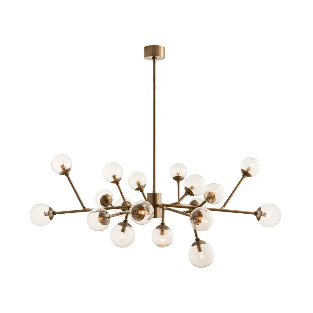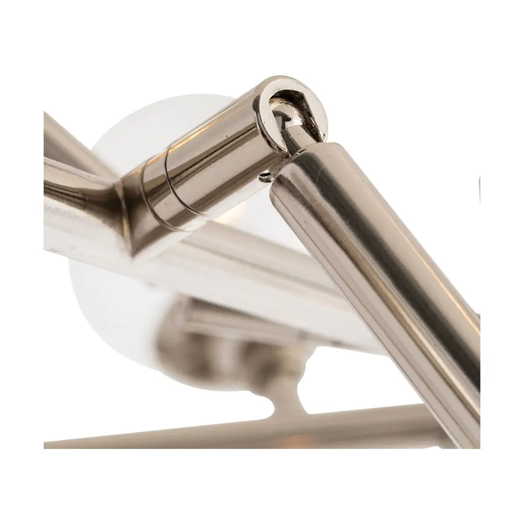 The Dallas chandelier, one of our most popular designs, is now available in polished nickel. This 18-light midcentury-inspired design features clear glass spheres and 12 of 18 arms are adjustable, making this the perfect piece for hands-on clients. Shown with small clear tubular bulbs. Certified for damp locations and intended for interior use. Additional pipe available PIPE-100. Bulb cannot exceed 3" in length due to globe size.