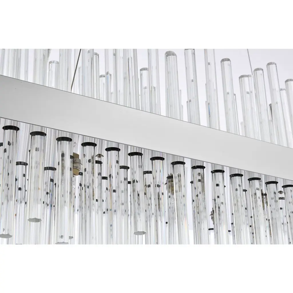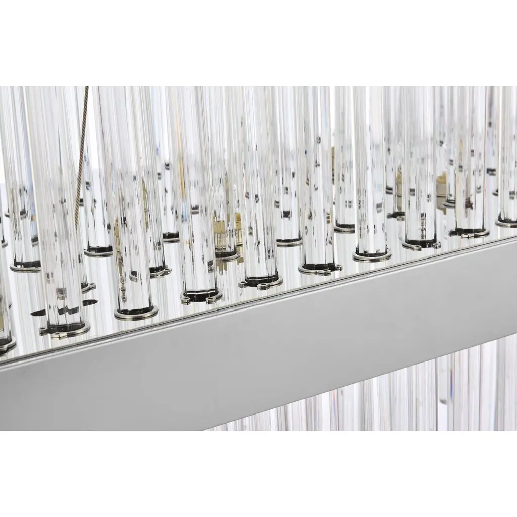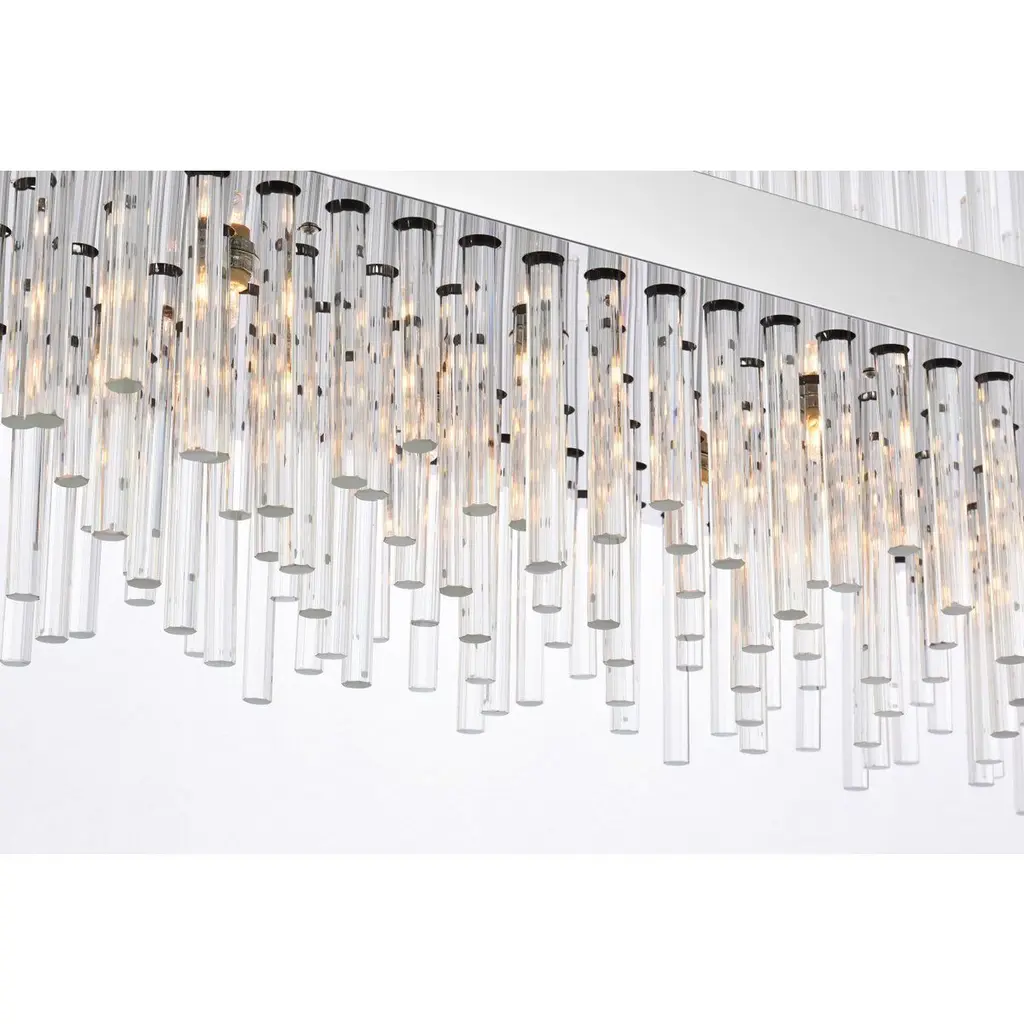 This stately fixture combines timeless elegance with modern and attractive sophistication. The delicate juxtaposition of upright and hanging clear glass rods creates a truly stunning visual statement, seamlessly woven together within a sleek bold metal frame. This expressive piece would be a welcomed and treasured addition to a wide range of modern residential styles.