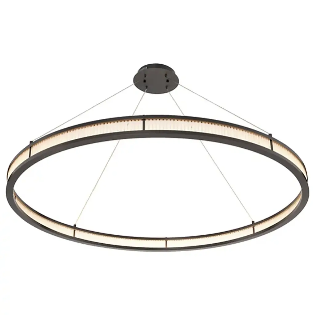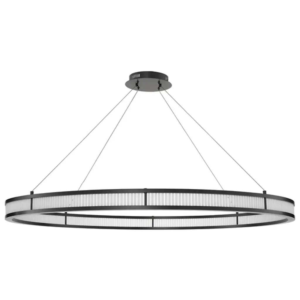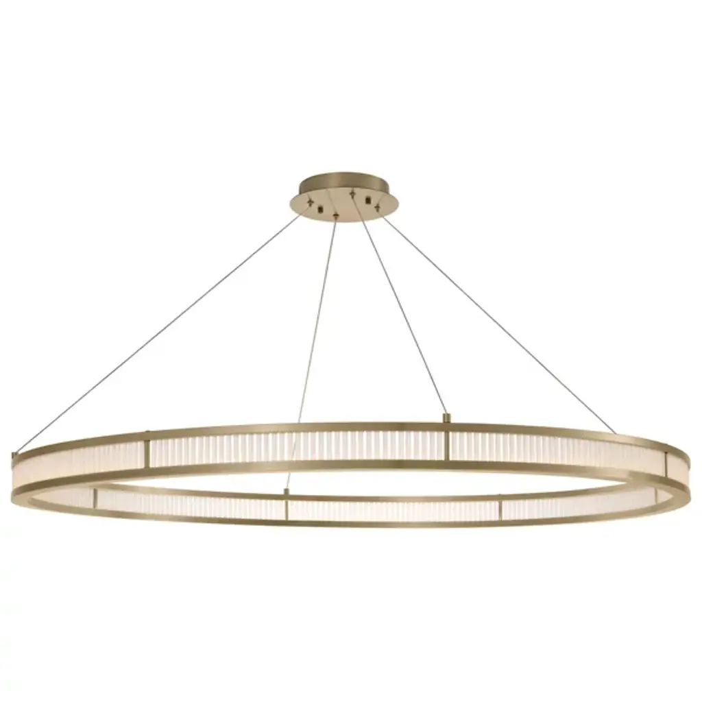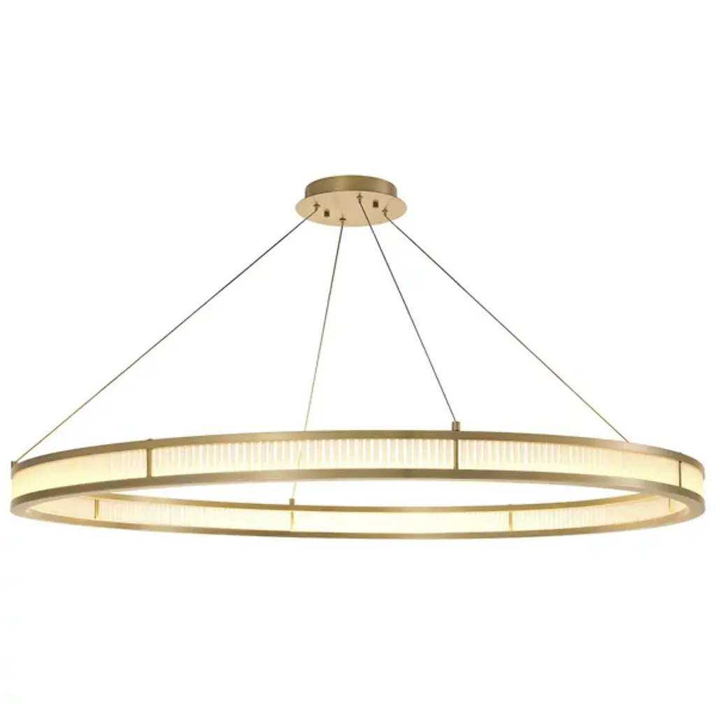 Make a memorable addition to large gathering spaces with the Damien LED Chandelier from Eichholtz. An open and elegant structure descending from a stepped disc ceiling mount via slim, strong cables, it uses a broad two-tier metal ring structure to support LED lamping inside it, gentled by evenly spaced rods of frosted glass secured just inside the outer rim of each ring. The translucent glass takes on a glow of its own, suffusing its surroundings with an elegant and lasting ambiance.