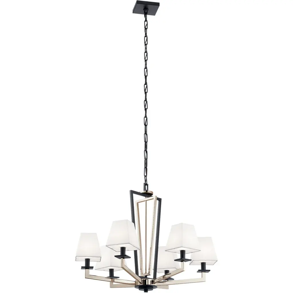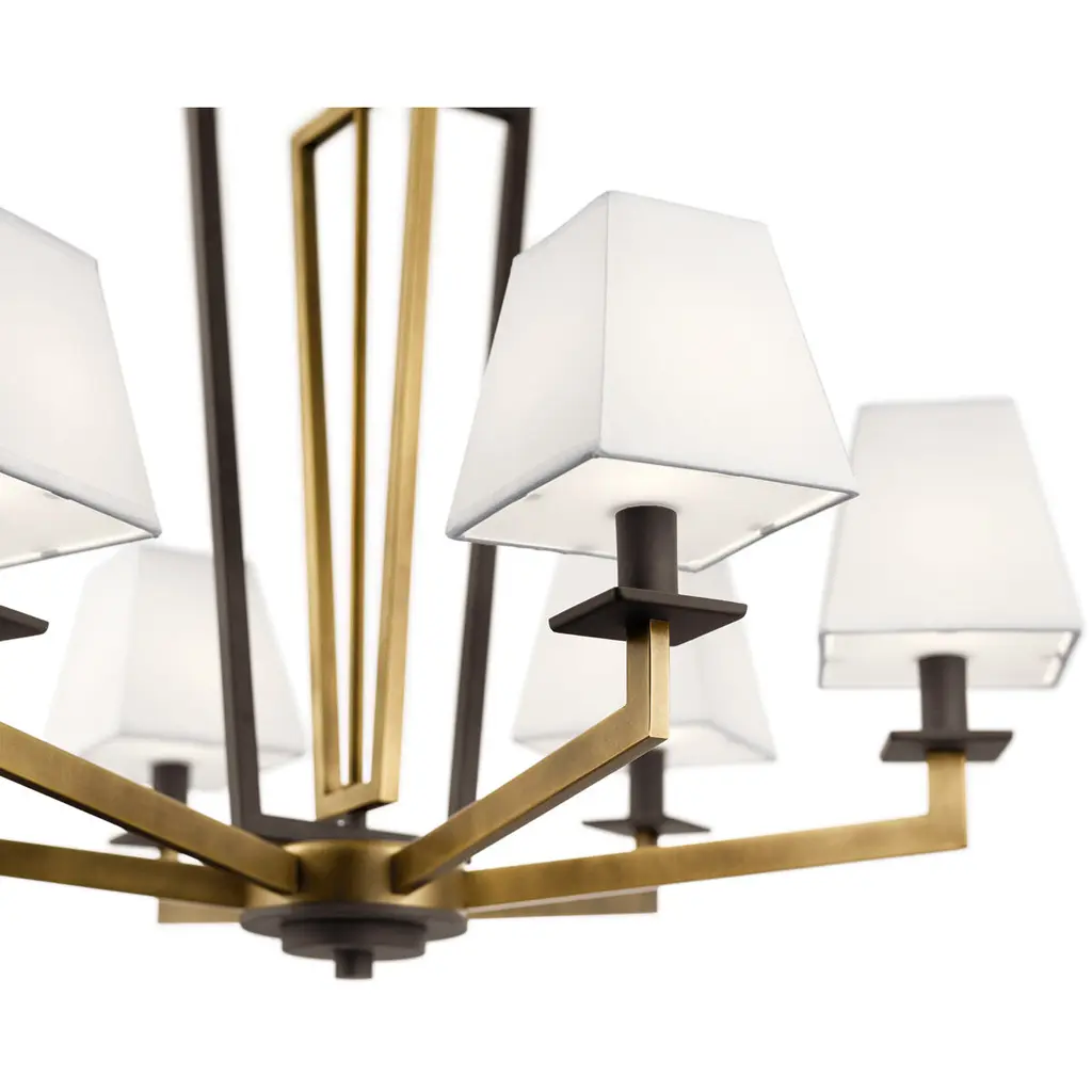 Featuring square lines and cascading chain accents, the Dancar 6-light chandelier with Natural Brass finish flows nicely with soft contemporary spaces. The Dancar's square, white microfiber shades, and satin etched diffuser glass provide a warm and relaxed tone to any room.