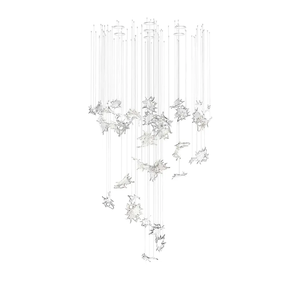 One of the most famous designs from Lasvit, the Dancing Leaves Chandelier is a sculptural luminary evoking the movement of leaves in the wind, floating and eventually flying away. Each installation is crafted from dozens of meticulously crafted glass components, each sculpted by a master glassmaker. Perfect as a dining room, living room, or entryway statement piece, this chandelier is lit by an external lighting source for a sparkling display of craftsmanship and beauty. Highlights