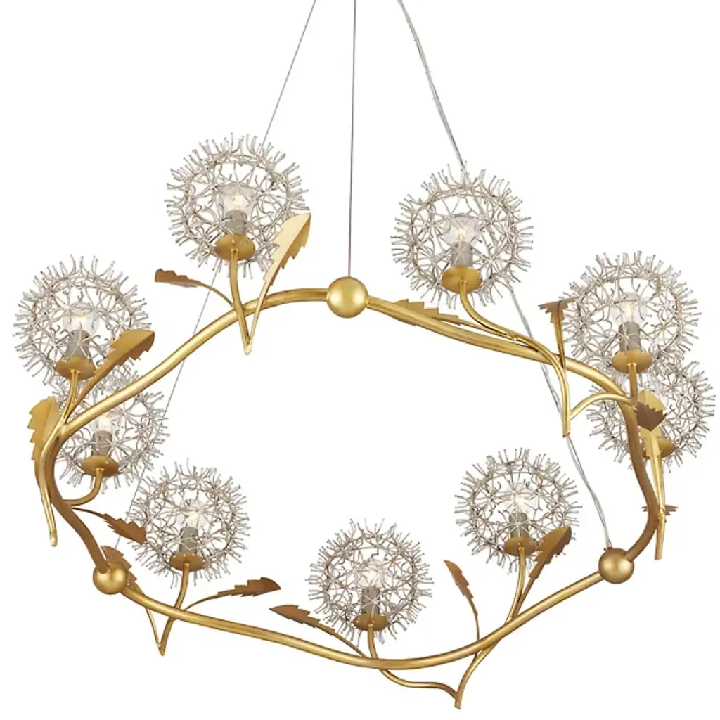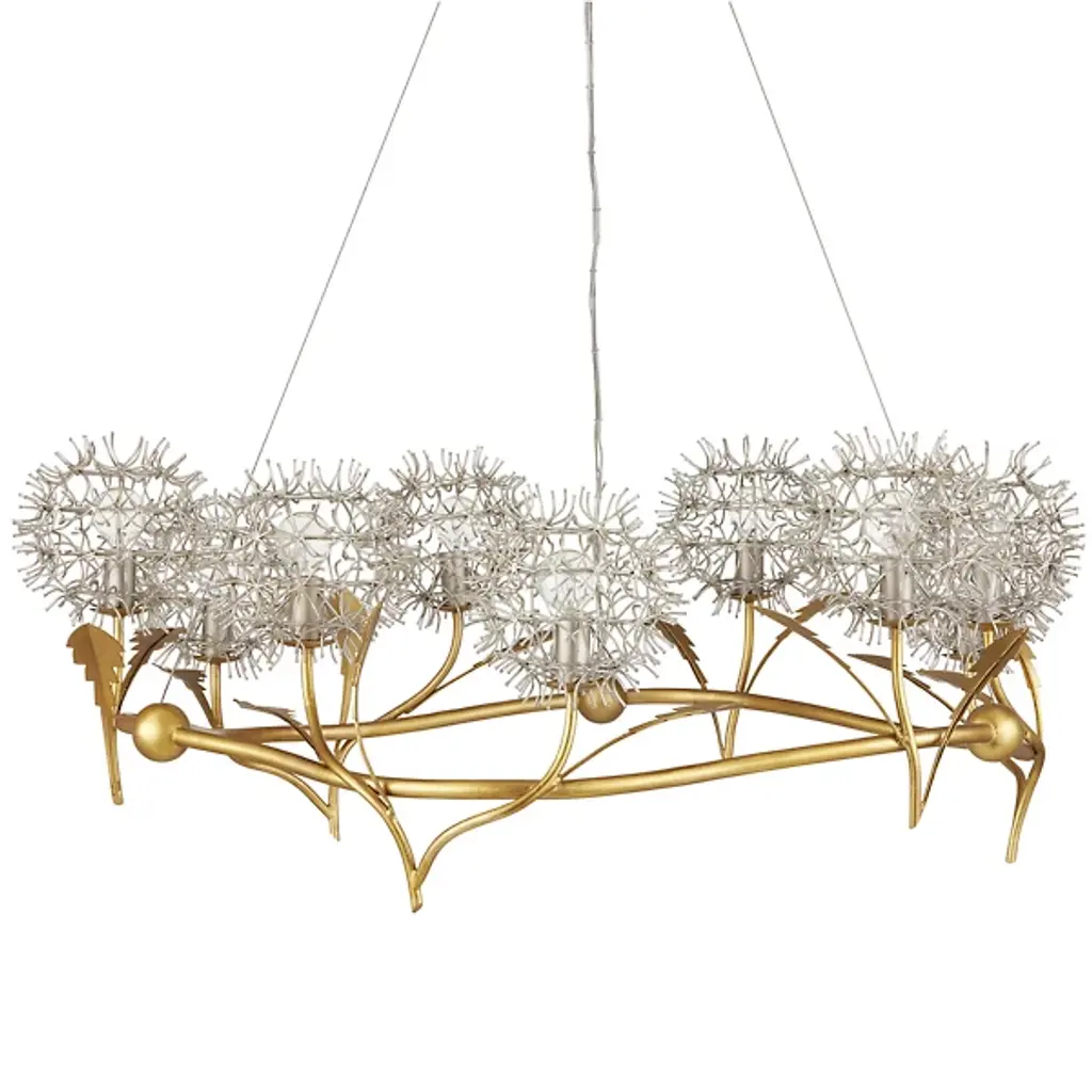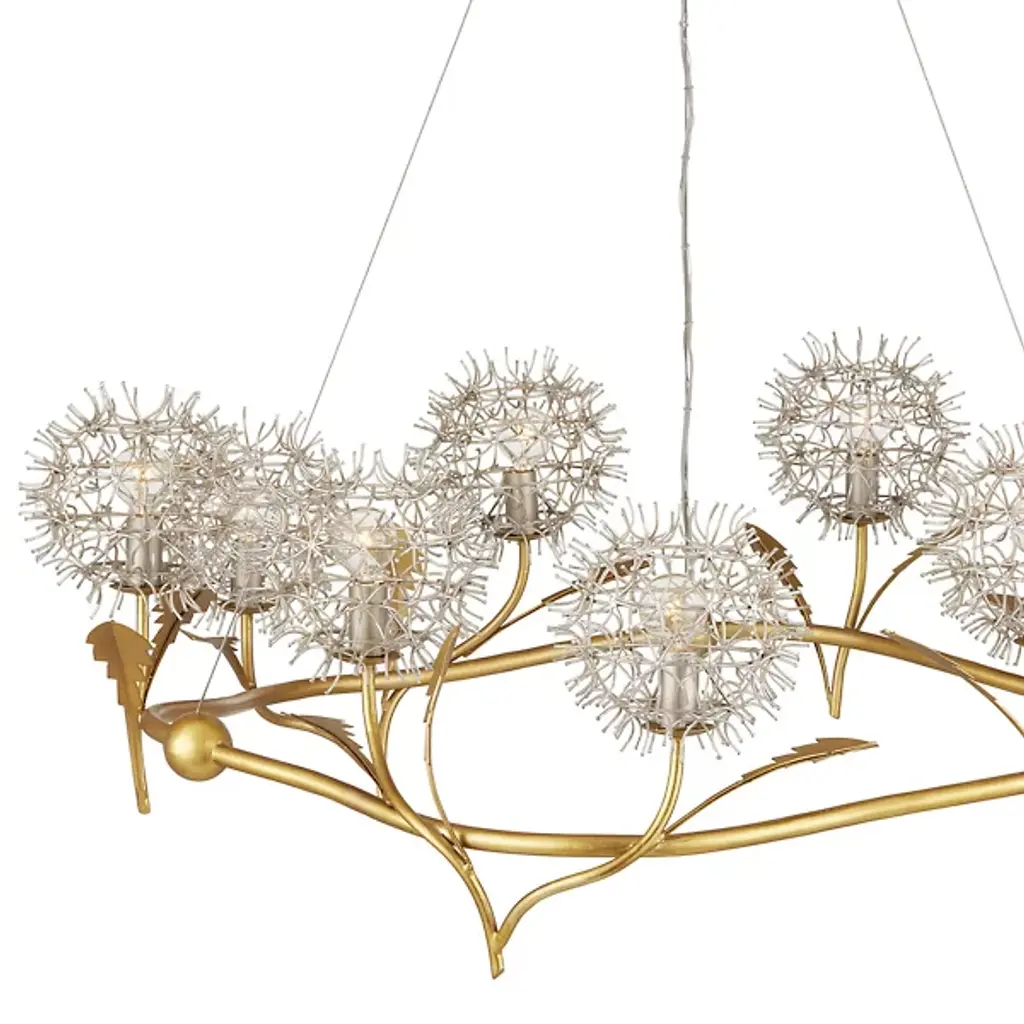 Introducing the Dandelion Chandelier from Currey & Company presents a magnificent masterpiece that honors its namesake flower. The chandelier showcases a masterful composition of puff balls crafted from bent and welded nails—an intricate and labor-intensive process. Made of wrought iron, the chandelier's undulant rings, orb accents, and leaves radiate with a contemporary gold leaf finish, while the floral elements boast an exquisite mix of contemporary silver leaf and contemporary silver finishes. This exceptional piece eloquently expresses nature's splendor, infusing your space with a celebration of its beauty and artistry.