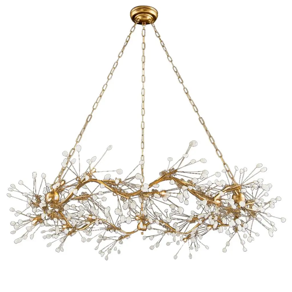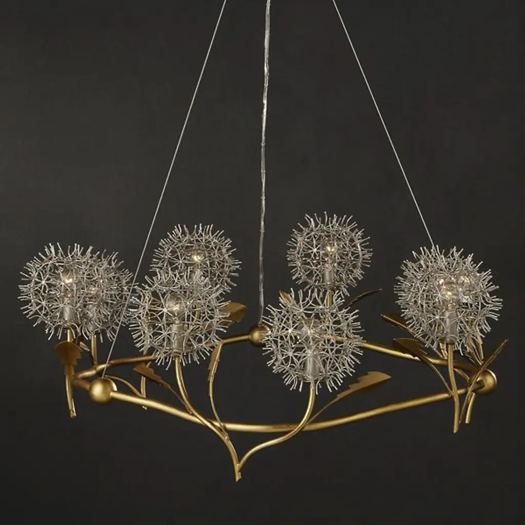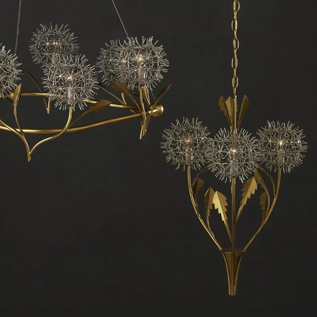 Introducing the Dandelion Chandelier from Currey & Company presents a magnificent masterpiece that honors its namesake flower. The chandelier showcases a masterful composition of puff balls crafted from bent and welded nails—an intricate and labor-intensive process. Made of wrought iron, the chandelier's undulant rings, orb accents, and leaves radiate with a contemporary gold leaf finish, while the floral elements boast an exquisite mix of contemporary silver leaf and contemporary silver finishes. This exceptional piece eloquently expresses nature's splendor, infusing your space with a celebration of its beauty and artistry.