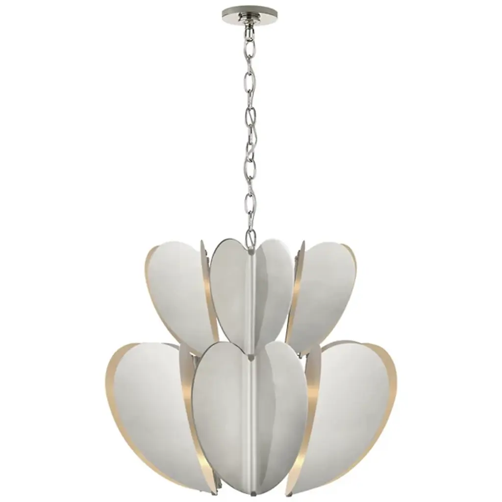 The Danes 2-Tier Chandelier by Visual Comfort Signature, formerly known as Visual Comfort, has a dynamic, layered look that is suspended by a classic linked chain. Dressed up with a lovely finish, a collection of neatly formed metal leaves that are reminiscent of hearts shield a set of candelabras within them, creating a two-tiered arrangement that captures the eye. Elegant and striking with its simple, balanced composition, this chandelier is a bright and beautiful addition to rooms.