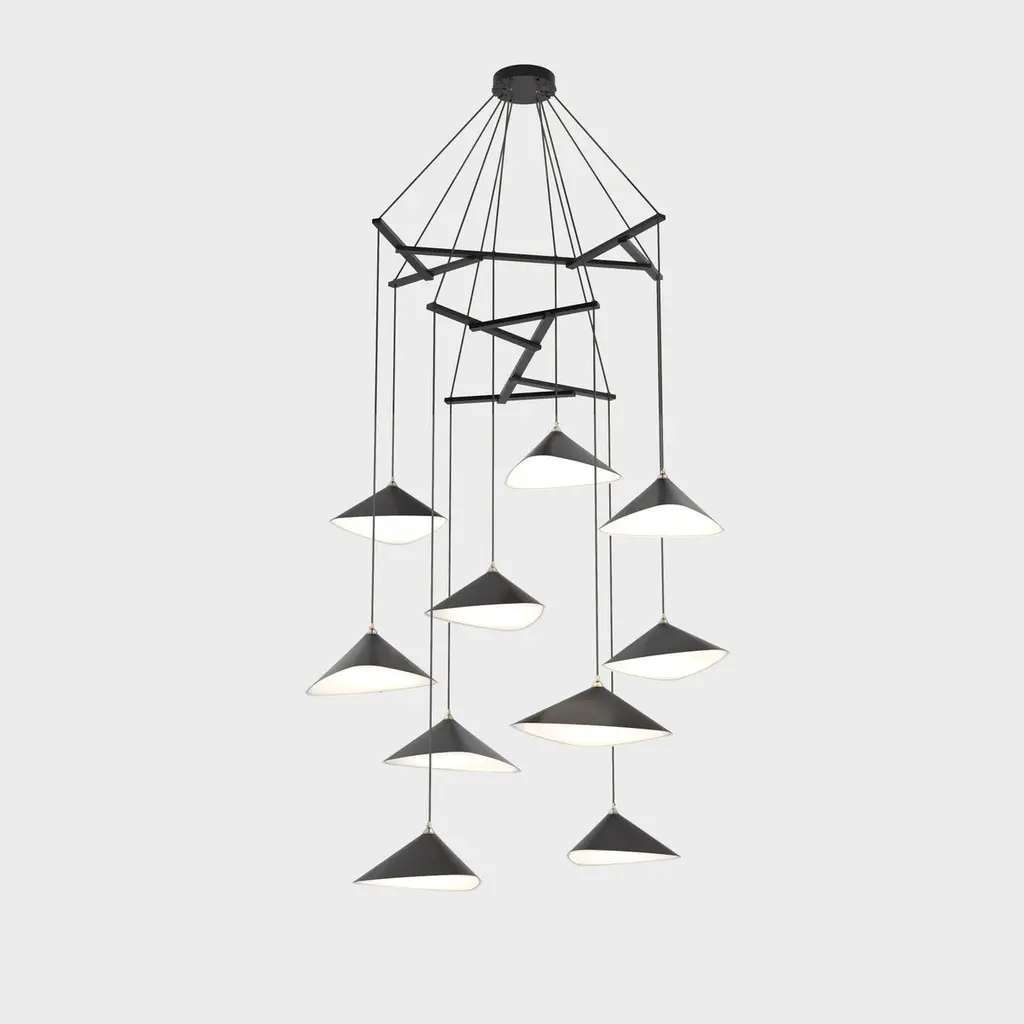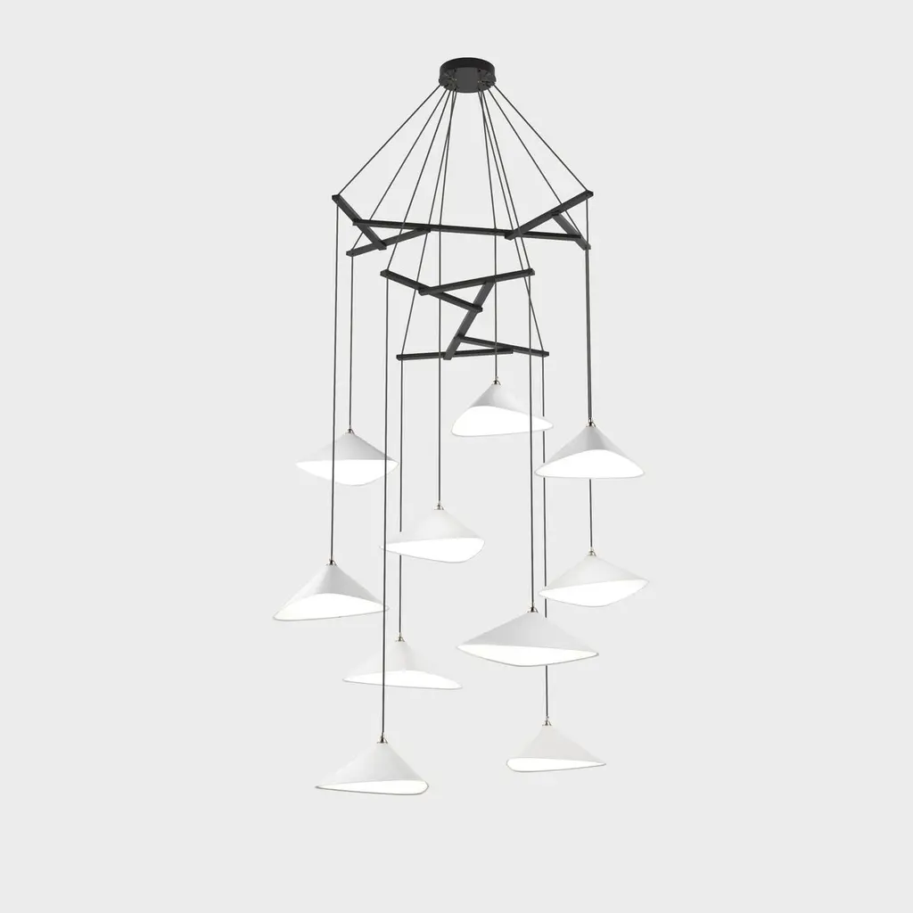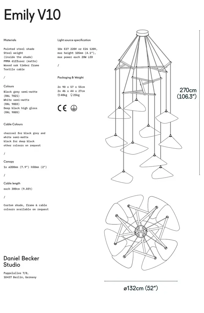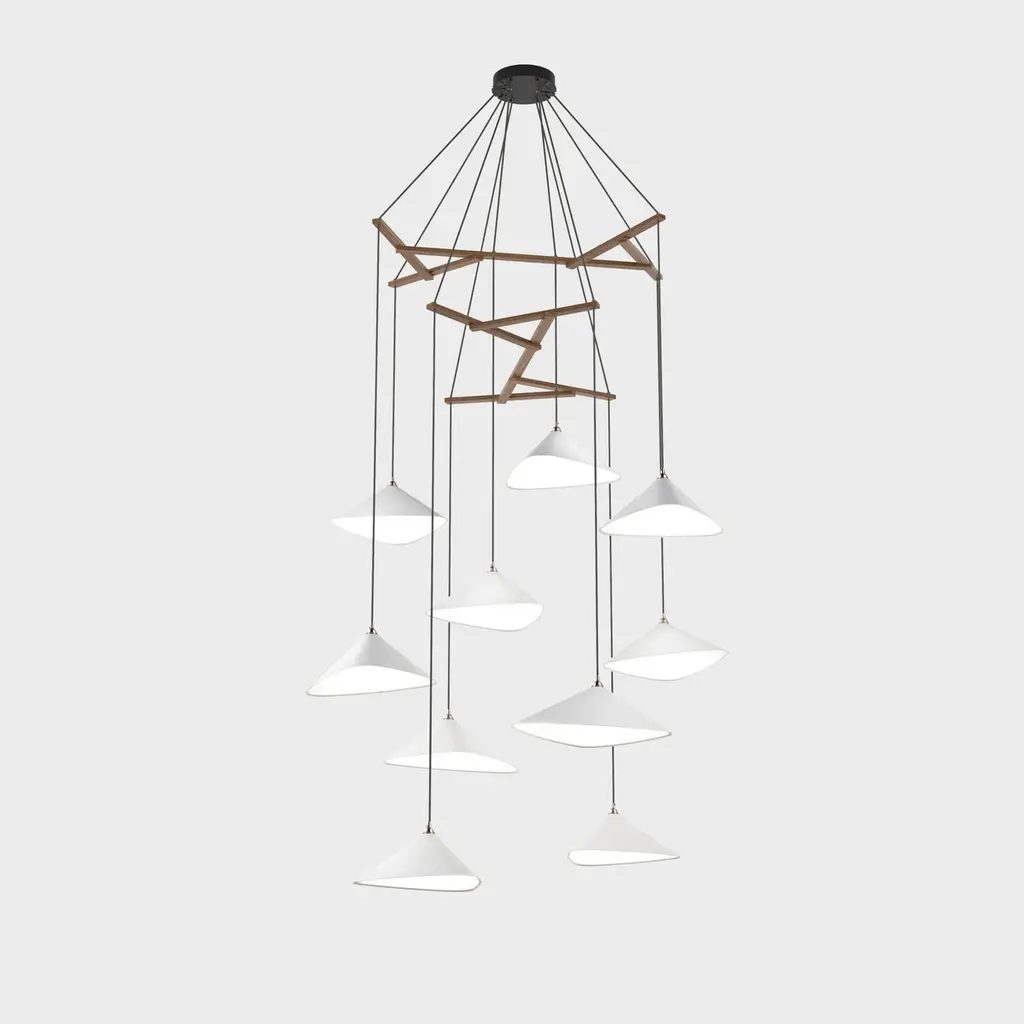 Daniel Becker 'Emily Vertikal 10' Chandelier in Anthracite/Oak for Moss Objects.Designed by Berlin luminary Daniel Becker and handmade to order using modern and mid-century manufacturing techniques, the Emily Series won the prestigious German Design Award 2019. The high quality sheet steel shades are cut, bent, formed, welded and sanded by hand in a complex process to build natural, organic shapes before they are painted semi-matte anthracite and fitted with opaline PMMA diffusers. Then they are arranged in a mobile like fashion around a sculptural frame of waxed oak timber. This new 'Vertikal' version of Becker's iconic design is better fitted for vertical spaces such as staircases, where a long and narrow installation is needed.Price per item. Shades available in glossy black (RAL 9005) as well as a semi-matte finish in anthracite (RAL 7021) or white (RAL 9003). Frame available in choice of natural or black oak. This listing is for the Emily Vertikal 10 chandelier in anthracite with oak frame. Please note that the photos in this listing also show other color and finish options. Prices vary.'Emily Vertikal 10' consists of:5 x 'Emily I' (13.6" W x 19.7" L)5 x 'Emily II' (14.6" W x 15.8" L)Standard in-stock lead time 5-6 weeks. Out of stock lead time up to 8 weeks or more. Lead time and availability are subject to change without notice. Please contact us for current lead time prior to placing time-sensitive orders.Wired for US electrical, each shade accommodates a single E26 medium base maximum 60W Equivalent LED bulb (bulb not included). Not UL listed, but recommended UL listing possible from an authorized 3rd party vendor upon request for an additional fee.Handmade to order. All sales are final.