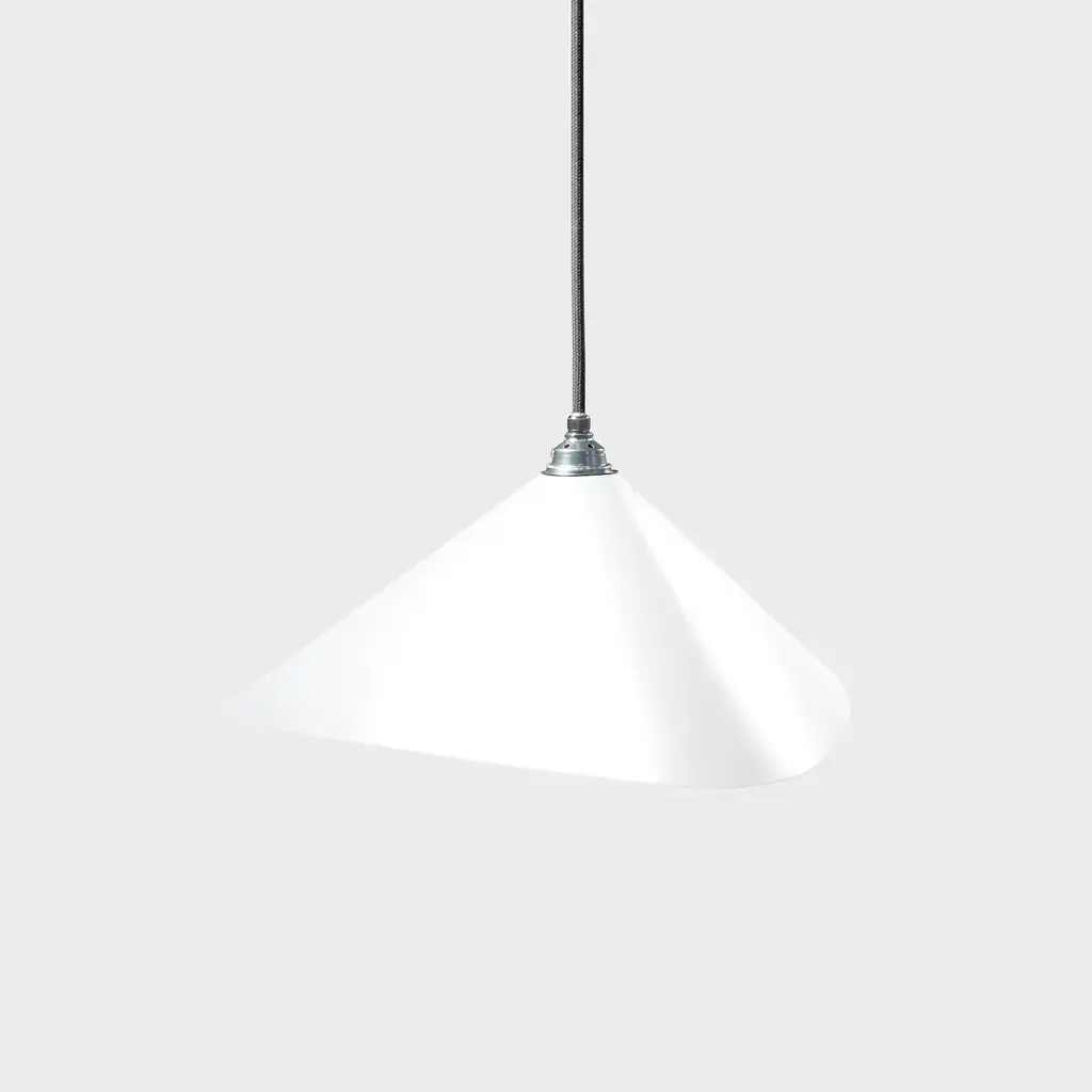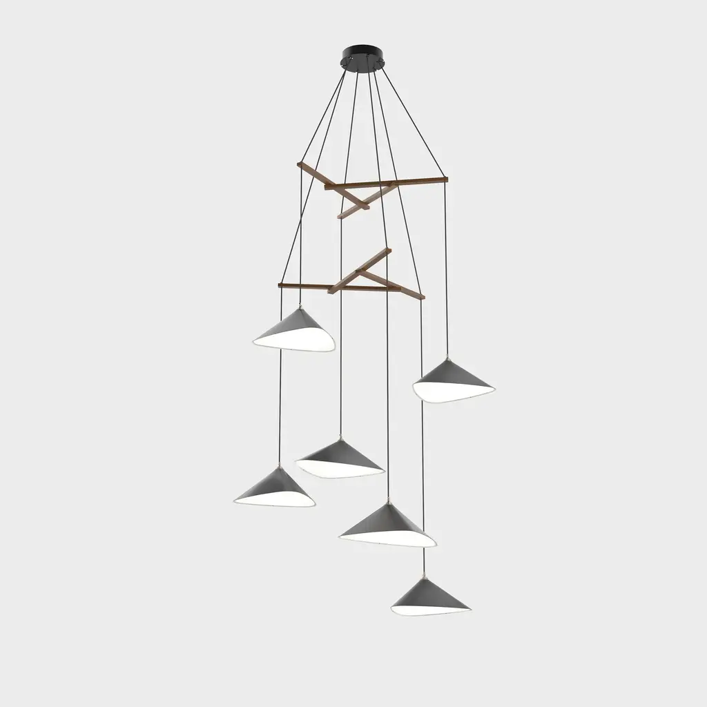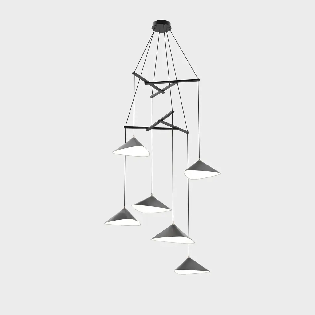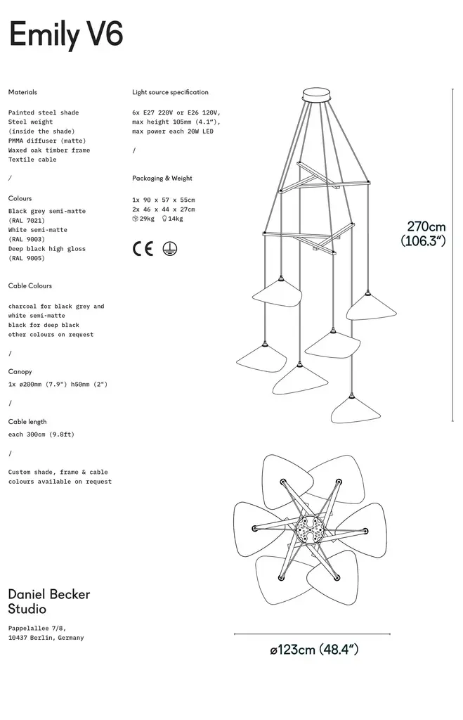 Daniel Becker 'Emily Vertikal 6' Chandelier in Matte White for Moss Objects. Designed by Berlin luminary Daniel Becker and handmade to order using modern and Mid-Century manufacturing techniques, the Emily Series won the prestigious German Design Award 2019. The high quality sheet steel shades are cut, bent, formed, welded and sanded by hand in a complex process to build natural, organic shapes before they are painted in choice of a high-gloss black or a semi-matte anthracite or white, and fitted with opaline PMMA diffusers. They are then arranged in a mobile-like fashion around a sculptural frame of waxed oak timber. This new 'Vertikal' version of Becker's iconic design is better fitted for vertical spaces such as staircases, where a long and narrow installation is needed. Price per item. Available to order in unlimited quantities. Shades available in choice of glossy black (RAL 9005), semi-matte anthracite (RAL 7021), semi-matte white (RAL 9003), or brass and pairs with a wood frame available in choice of natural or black oak. 'Emily Vertikal 6' consists of: 3 x 'Emily I' (13.6" W x 19.7" L) 3 x 'Emily II' (14.6" W x 15.8" L) Standard in-stock lead time 5-6 weeks. Out of stock lead time up to 8 weeks or more. Lead time and availability are subject to change without notice. Please contact us for current lead time prior to placing time-sensitive orders. Wired for US electrical, each shade accommodates a single E26 medium base maximum 60W Equivalent LED bulb (bulb not included). Not UL listed, but recommended UL listing possible from an authorized 3rd party vendor upon request for an additional fee. Handmade to order. All sales are final.